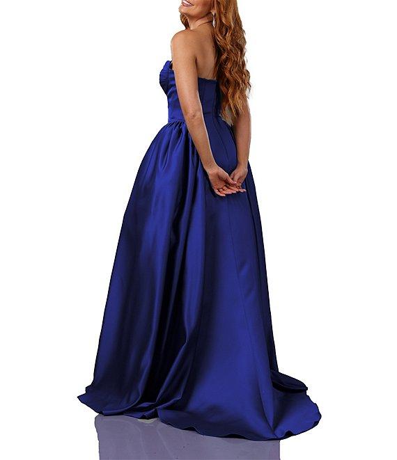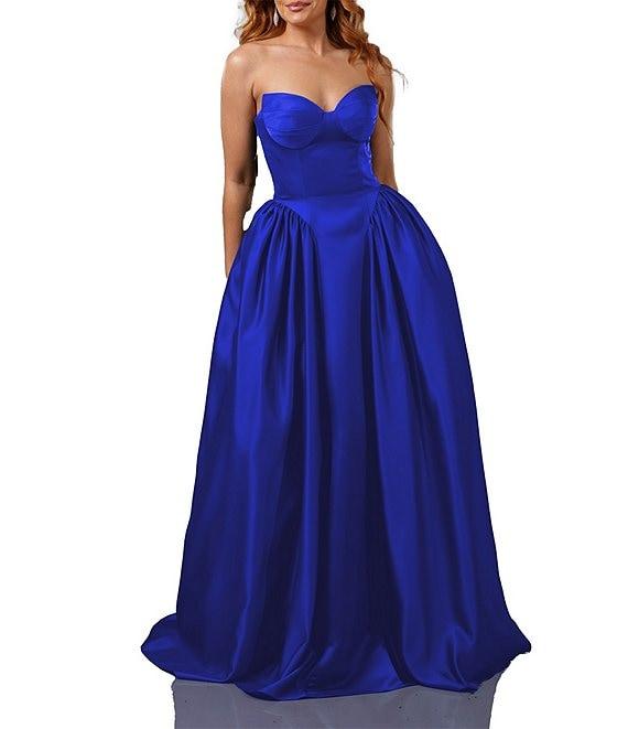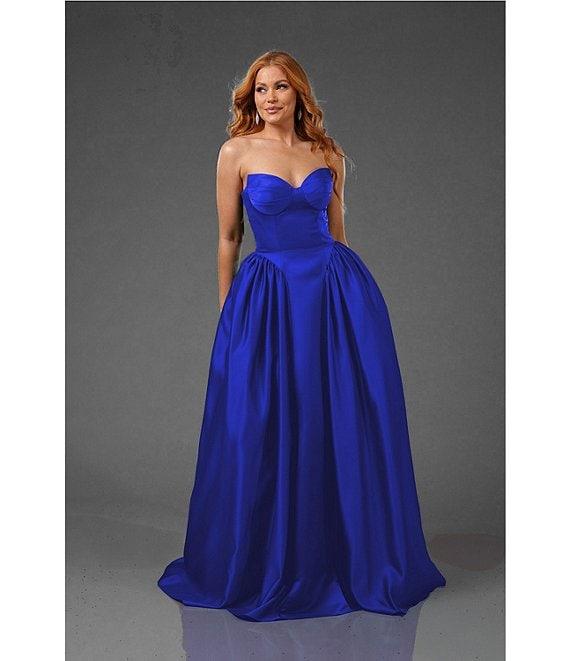 From Terani Couture, this gown features: Ballgown silhouette Satin fabrication Sweetheart neckline Strapless Side pleating Zip back closure Lined Approximate length 62.5" Polyester Hand wash Imported.