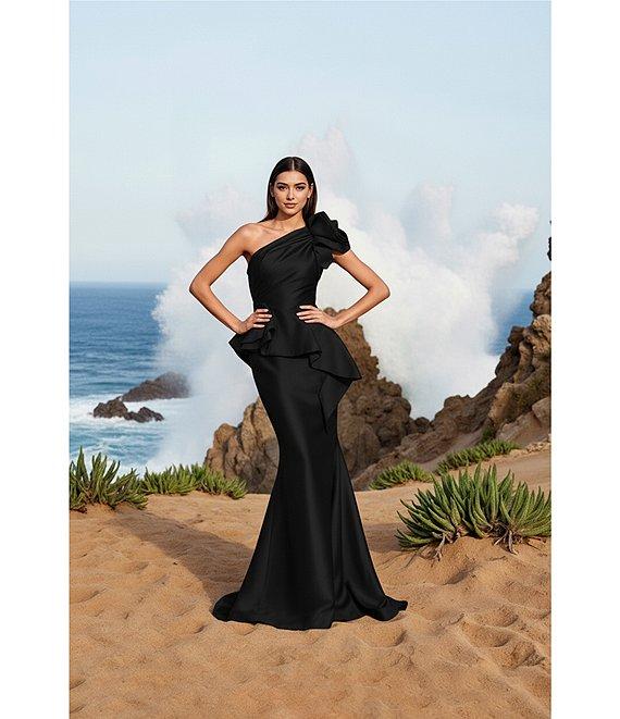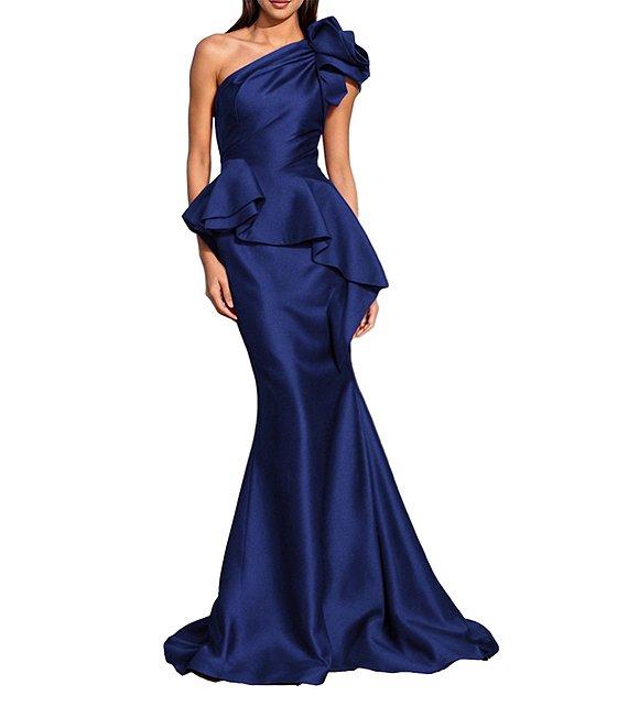 From Terani Couture, this dress features: Taffeta fabrication Peplum gown silhouette One shoulder neckline Sleeveless Large floral applique on shoulder Zip back closure Approx. 46" length from waist Polyester Dry clean Imported.
