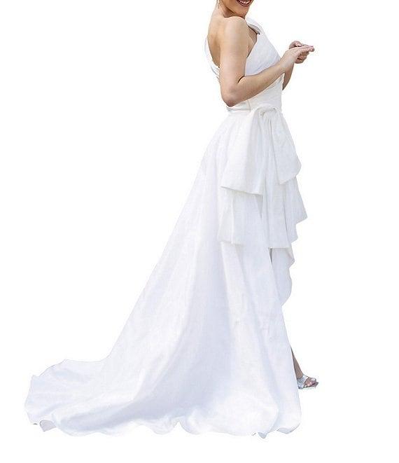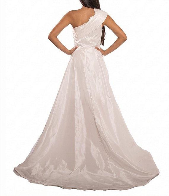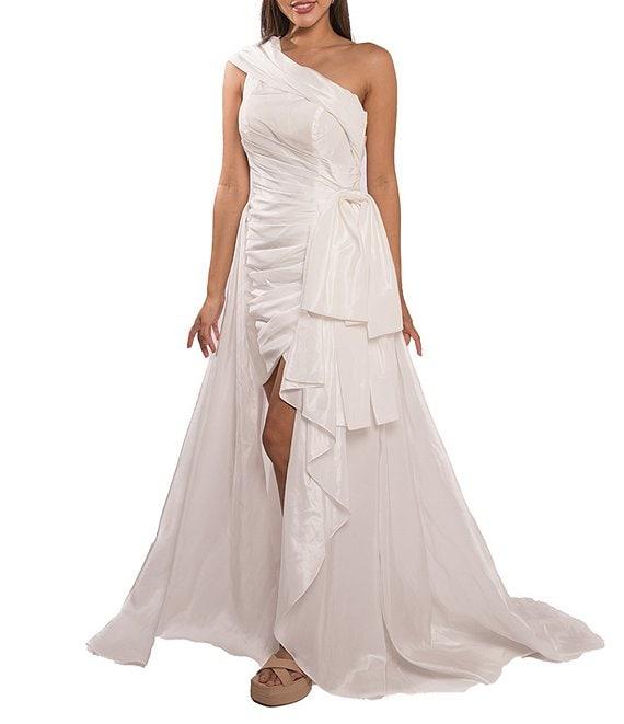 Terani Couture Taffeta One Shoulder Side Ruffle Hi-Low A-Line Gown