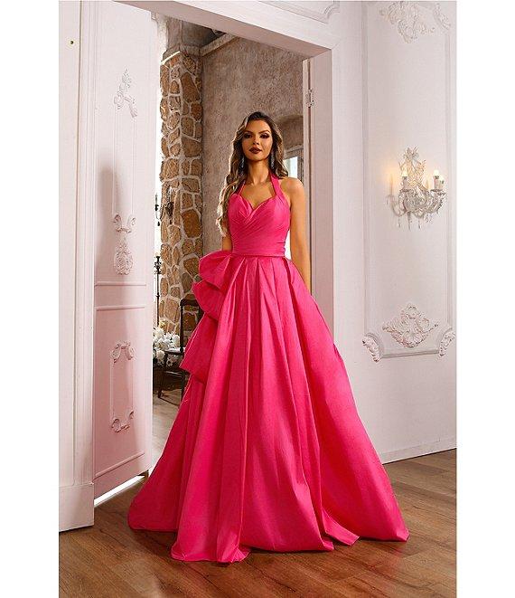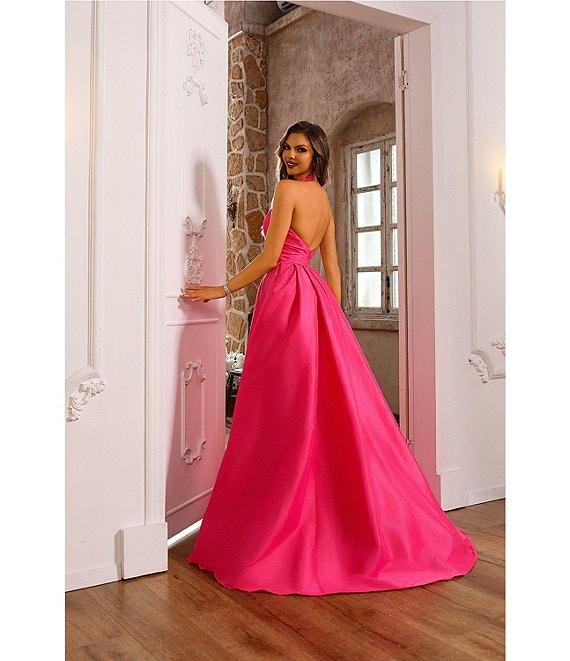 From Terani Couture, this dress features: Stretch taffeta fabrication A-line silhouette Sweetheart/halter neckline Sleeveless Side ruffle detail Front slit Lined Back zipper closure Approx. 48" length Polyester Dry clean Imported.