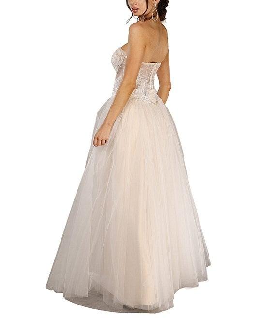 From Terani Couture, this dress features: Tulle fabrication Ball gown silhouette Sweetheart strapless neckline Sleeveless Bustier Lace Zip back closure Approx. 60" length Polyester Dry clean Imported.