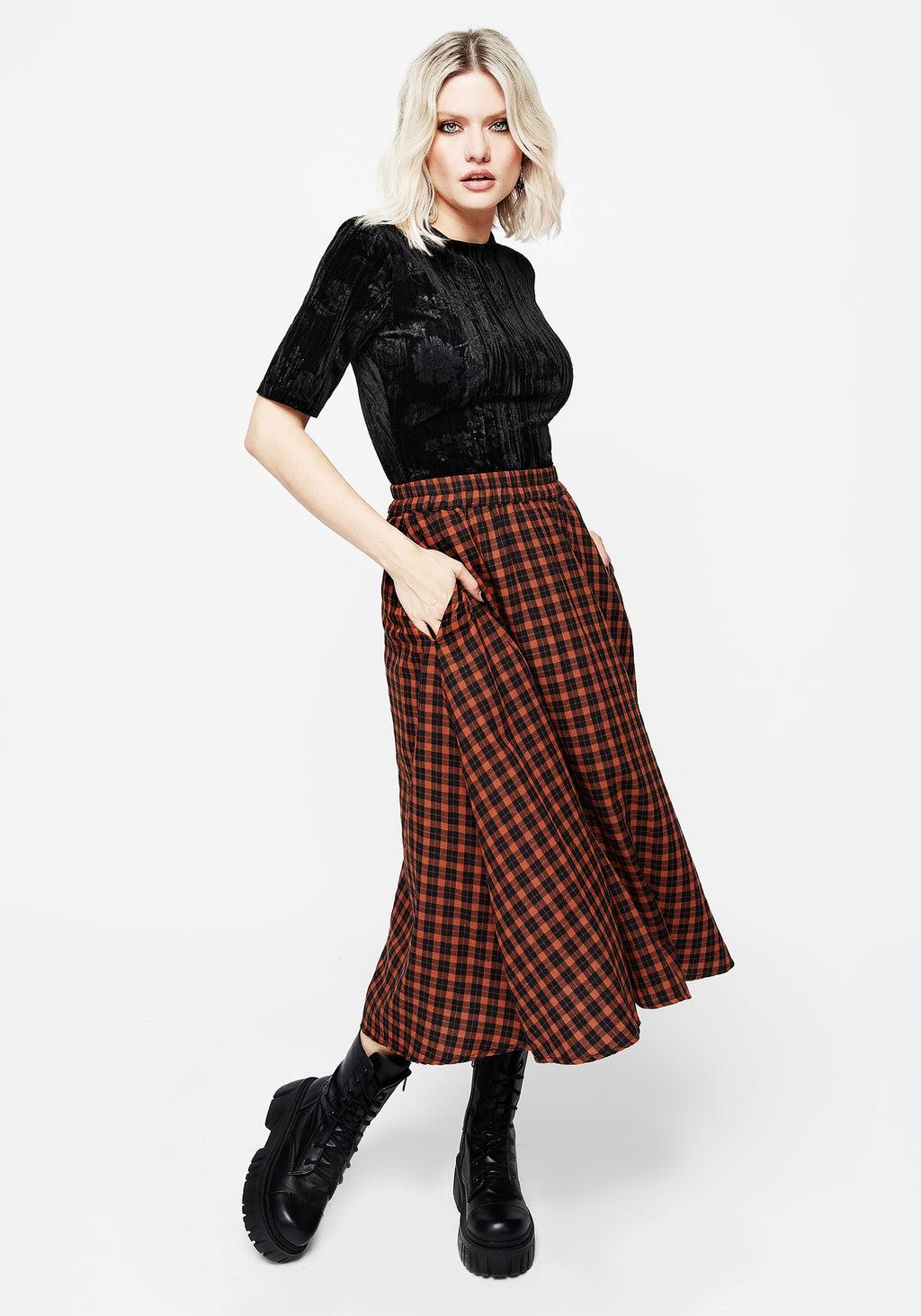 Bring the heat- Orange & black gingham midi skirt - Fully elasticated waistband for all day comfort - Modest midi length allows versatile styling - Two handy side pockets - Soft woven cotton-blend fabric for a soft, breathable finish - Grunged-up orange gingham - Green leaves turn to gold 57% cotton, 30% rayon, 13% polyester