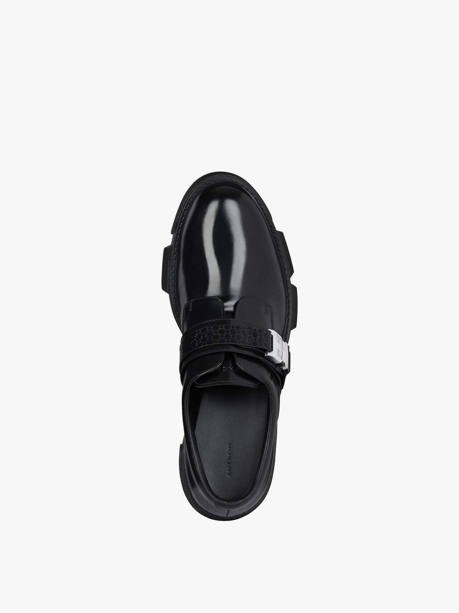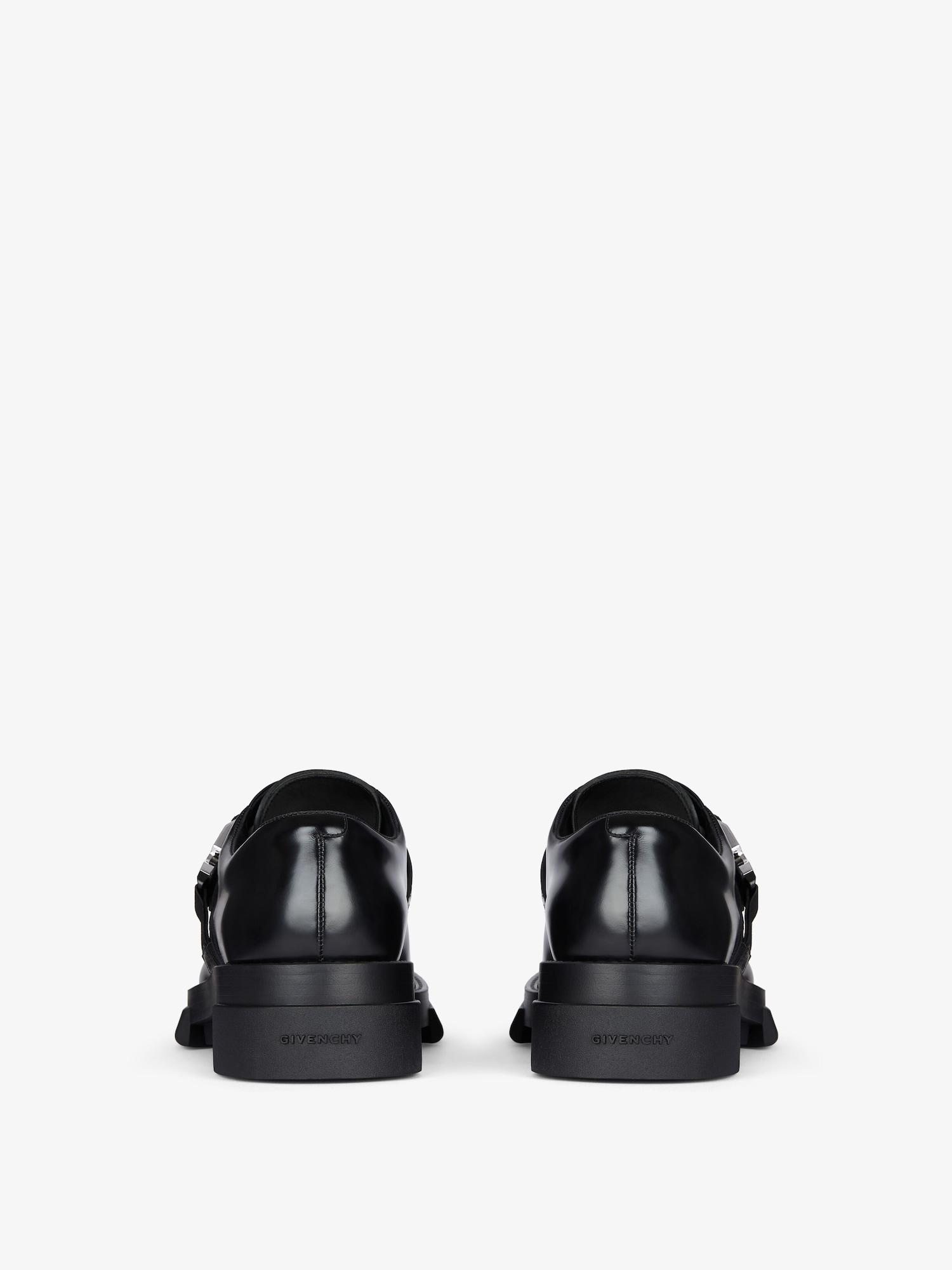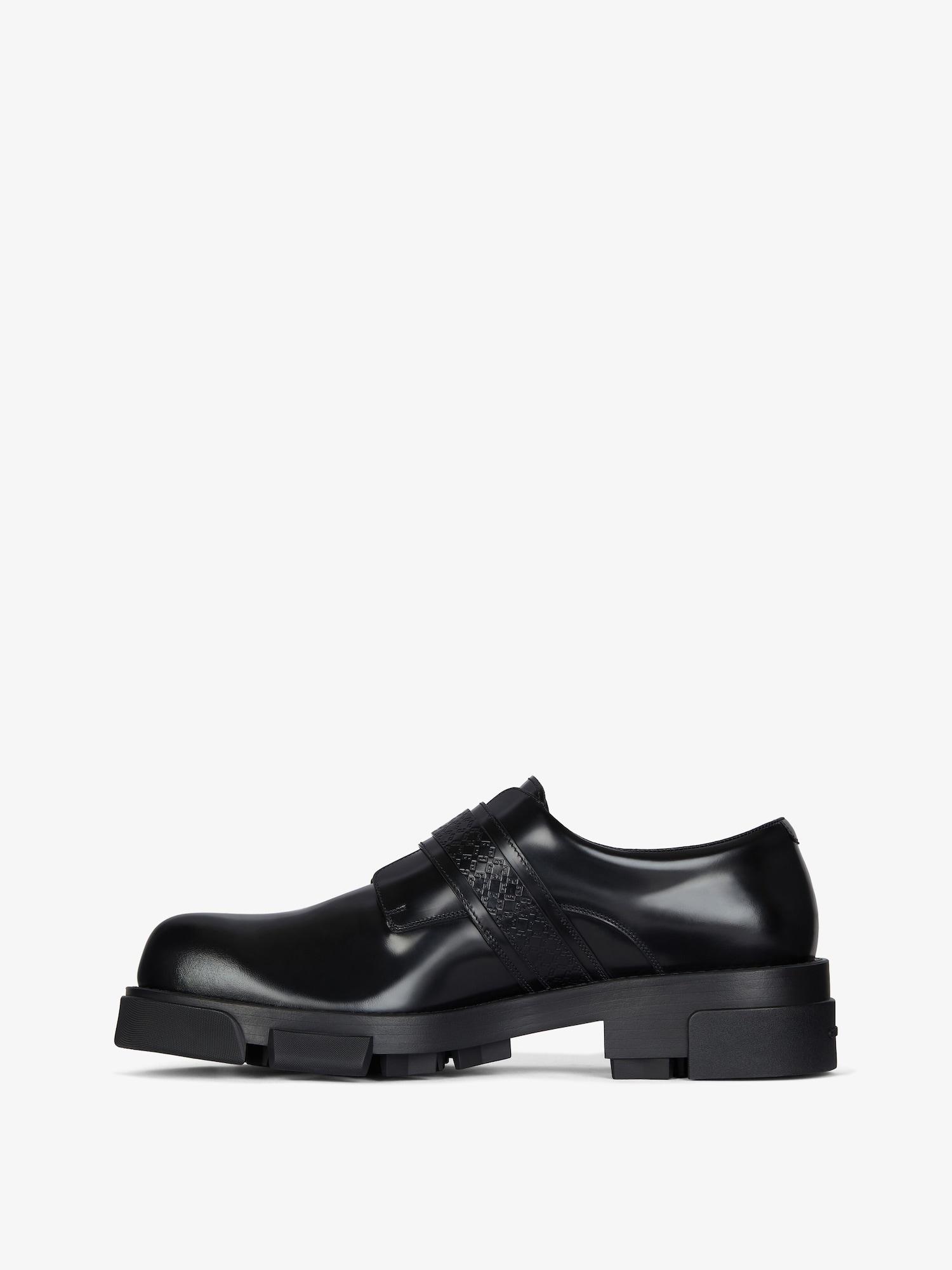 Derby shoes in brushed bull leather. Terra line. Strap on top with debossed monogram 72 and GIVENCHY engraved 2G metal clip buckle. GIVENCHY signature embossed on the back of the sole. GIVENCHY signature debossed on the leather insole. Silvery-finish metal details. Chunky technical sole.