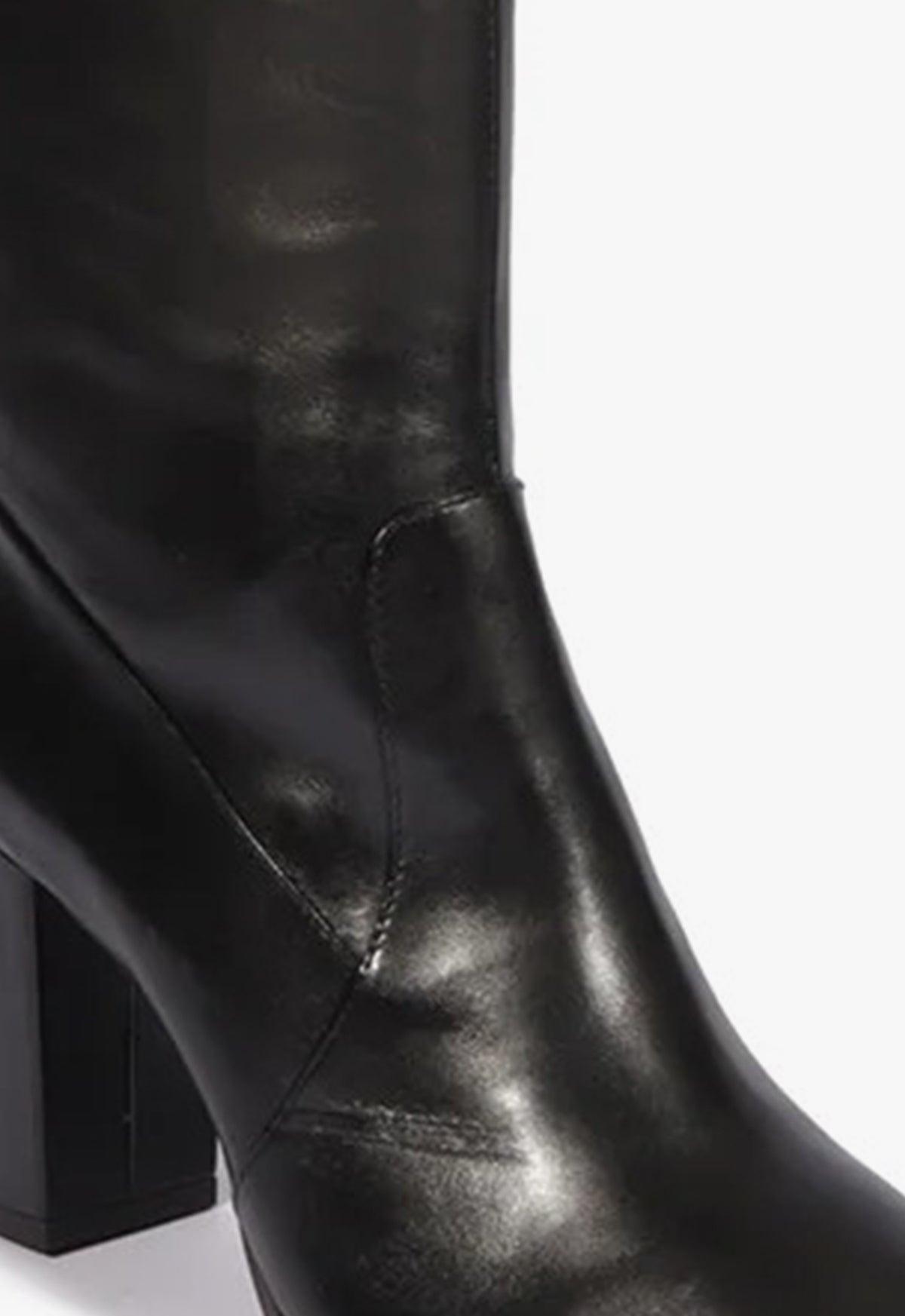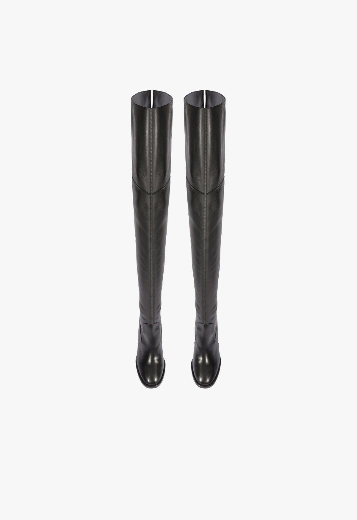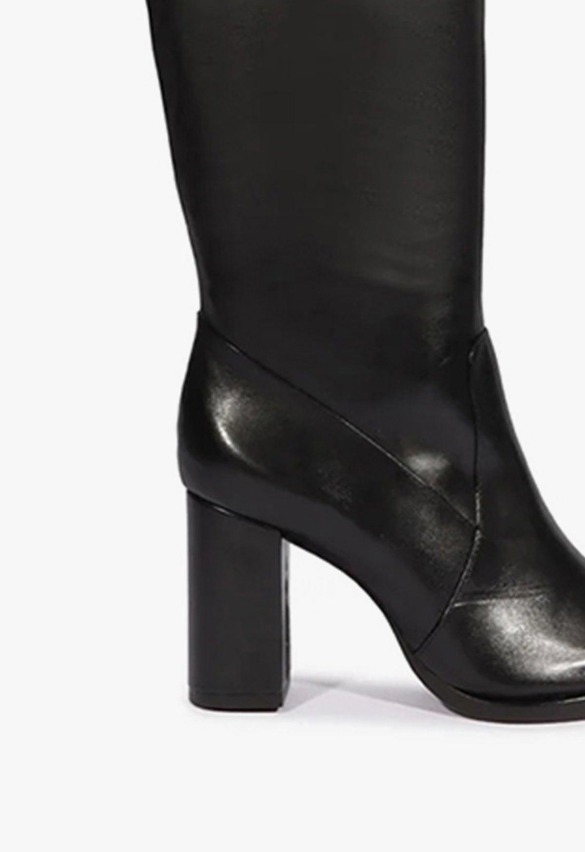 Our Terrance boots are striking over-the-knee boots designed to make a powerful fashion statement. They are crafted from sleek, high-quality leather that exudes style while featuring a tall shaft extending over the knee, giving them a commanding presence. The form-fitting silhouette hugs the legs and creates a streamlined look, and the high block heel is substantial, making the boots suitable for day and night wear. The round toe balances the overall design and adds a touch of femininity. Overall, our Terrance Boots' bold and confident style makes them an ideal choice for someone looking to make a statement while remaining robust and stylish.Materials: Leather Upper | Leather OutsoleHeel Type: High HeelHeel Style: Block HeelToe Style: Round ToeCounter Type: ClosedShaft Height: 25 In | 635 mmShaft Circumference: 21.3 In | 540 mmHeel Height: 3,1 In | 80 mmSKU: S2211600030001