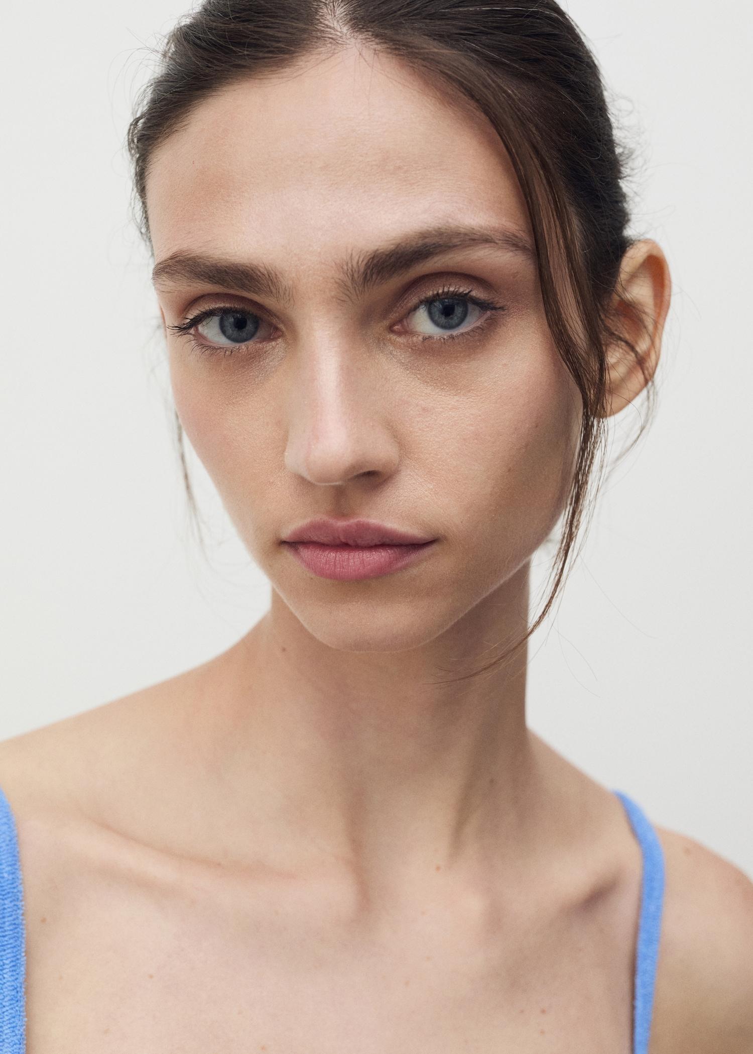 Cotton fabric. Terry cloth. Short design. Straight design. Low neckline. Sleeveless. Thin straps. No closure. Online Exclusive