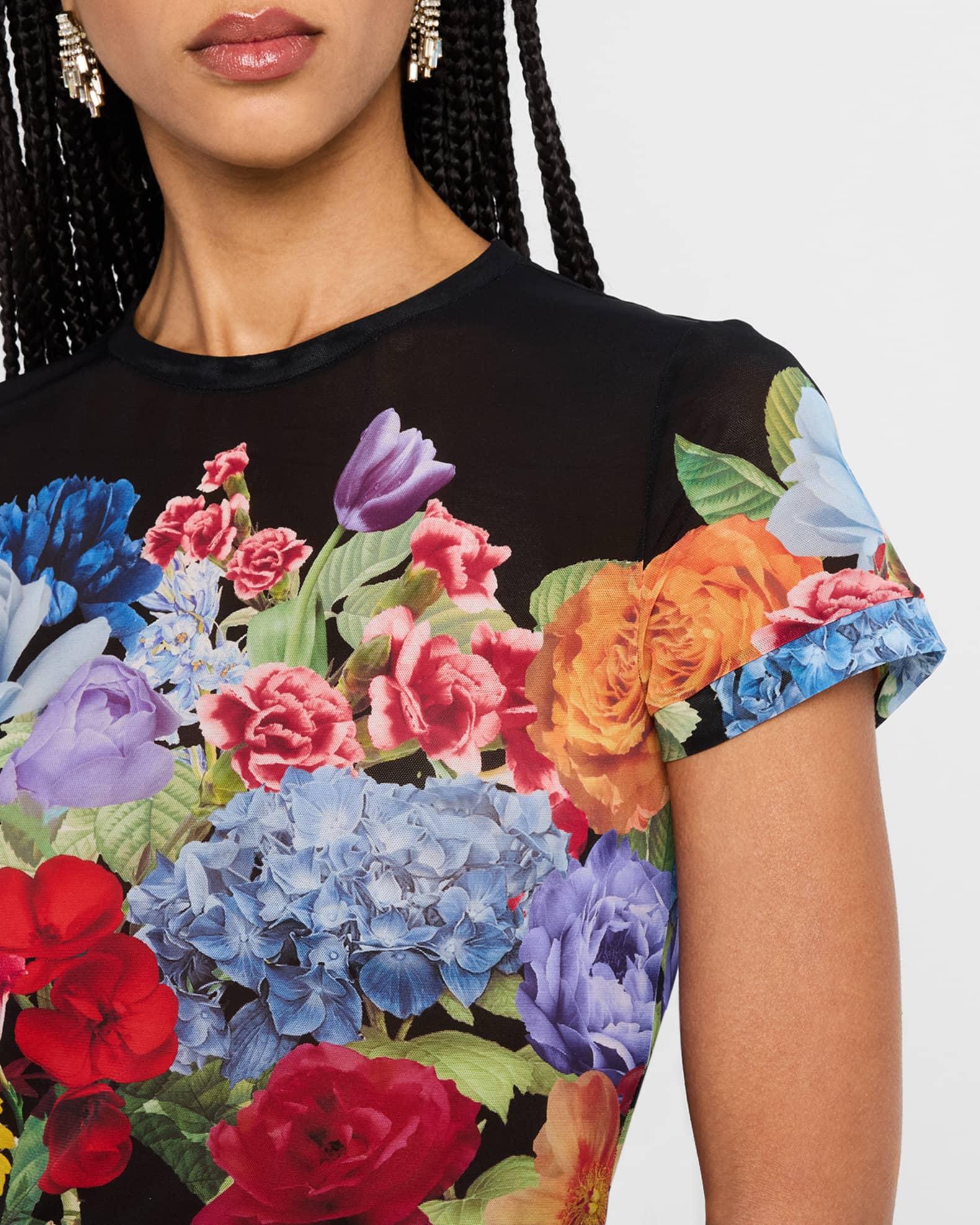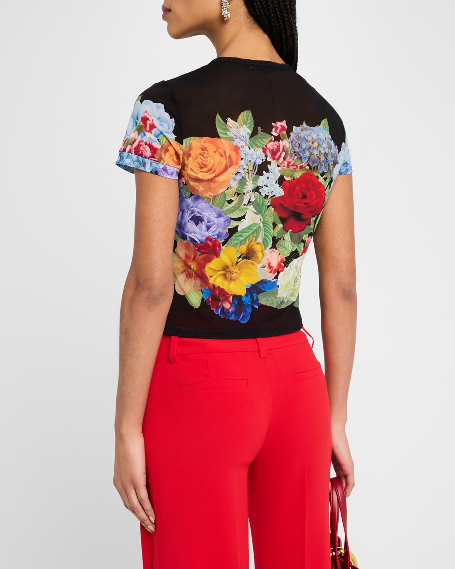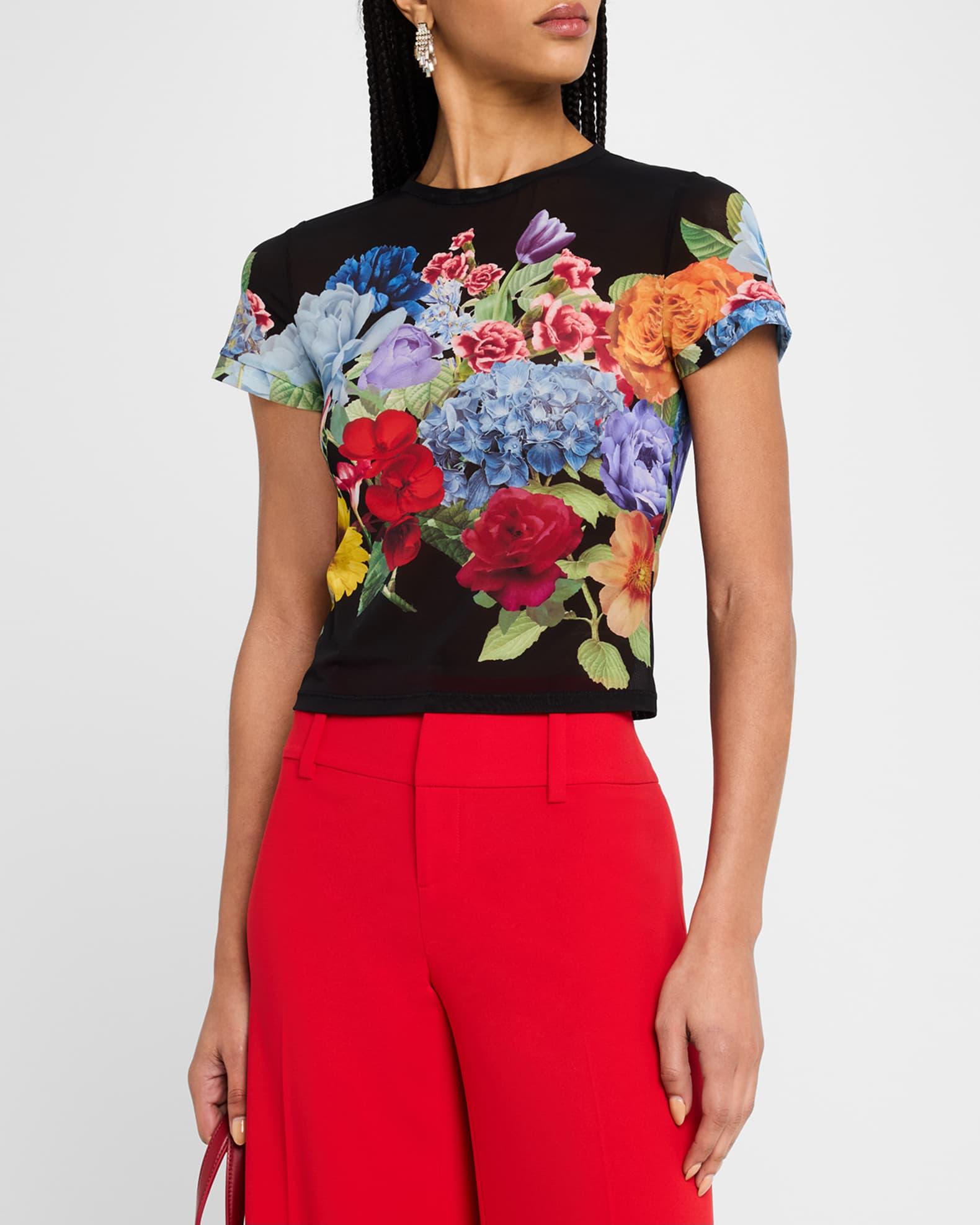 Alice + Olivia "Tess" t-shirt printed with a vibrant bunch of floral blooms Approx. 19"L from shoulder to hem Crew neckline Short sleeves; approx. 6"L Classic fit Hip length Pullover style Polyester/elastane Unlined Dry clean Imported
