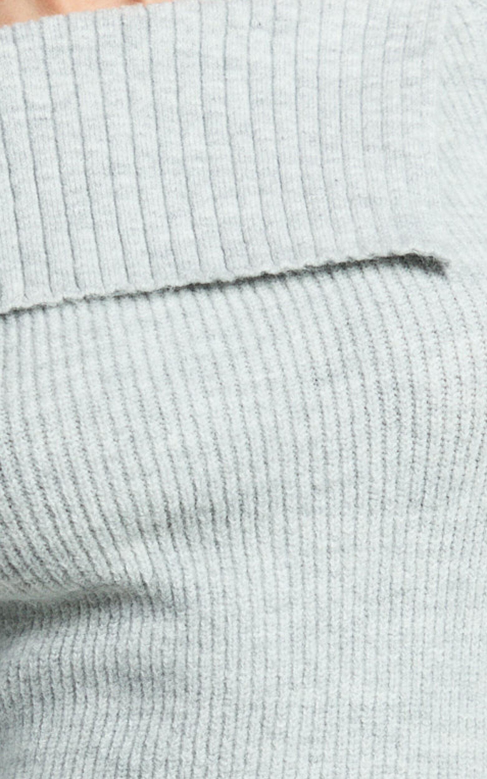 Tess Mini Dress - Asymmetric Off Shoulder Long Sleeve Knit Dress in Light Grey Marl
