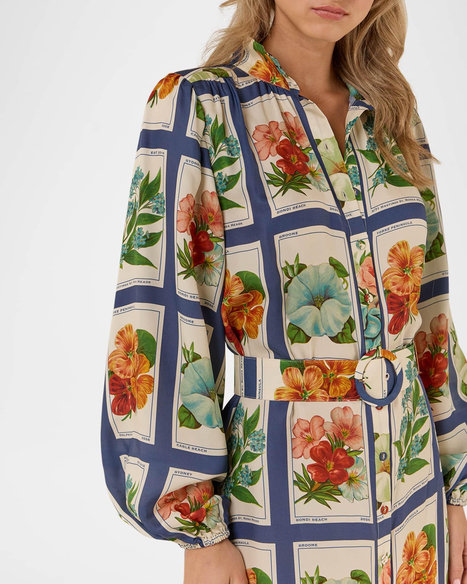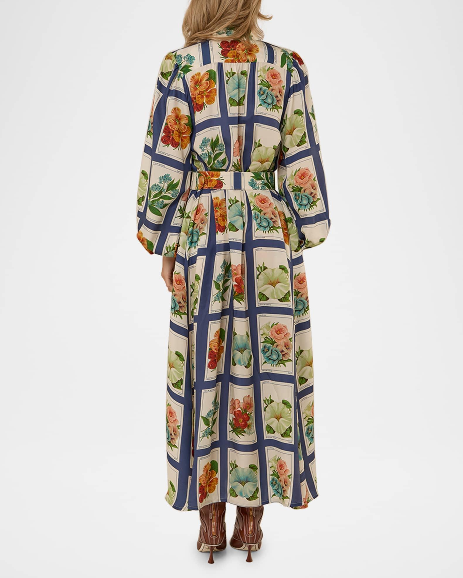 PALM NOOSA "Tessie" maxi shirtdress in silk-blend twill, printed in the exclusive Vintage Botanical print Stand collar; button front Long blouson sleeves Elasticized cuffs Belted waist Full length A-line silhouette Viscose/silk Dry clean Imported