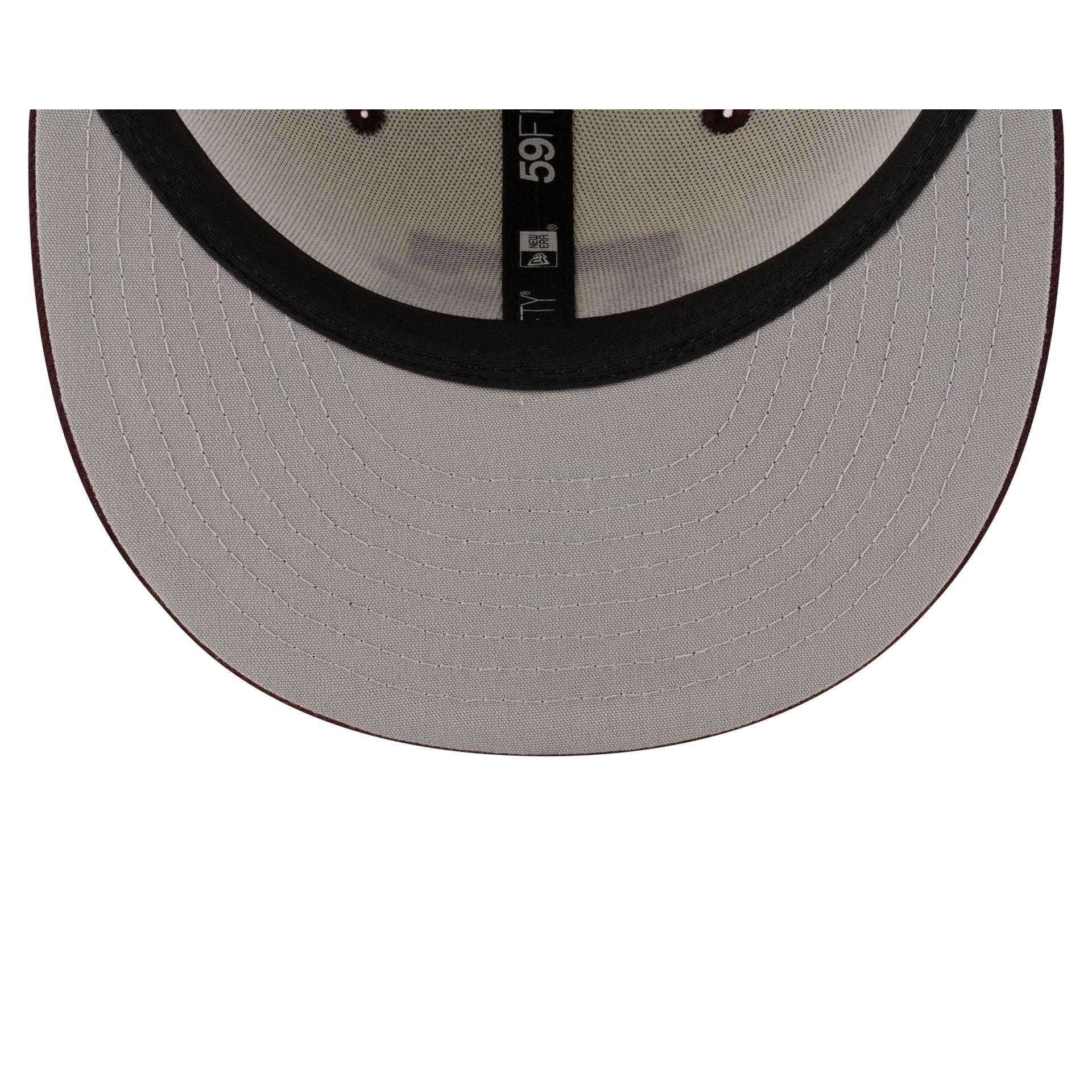 The Official On-Field cap for the Texas A&M Aggies baseball, the Chrome White 59FIFTY Fitted Cap features an embroidered Aggies logo at the front panels with a gray undervisor.