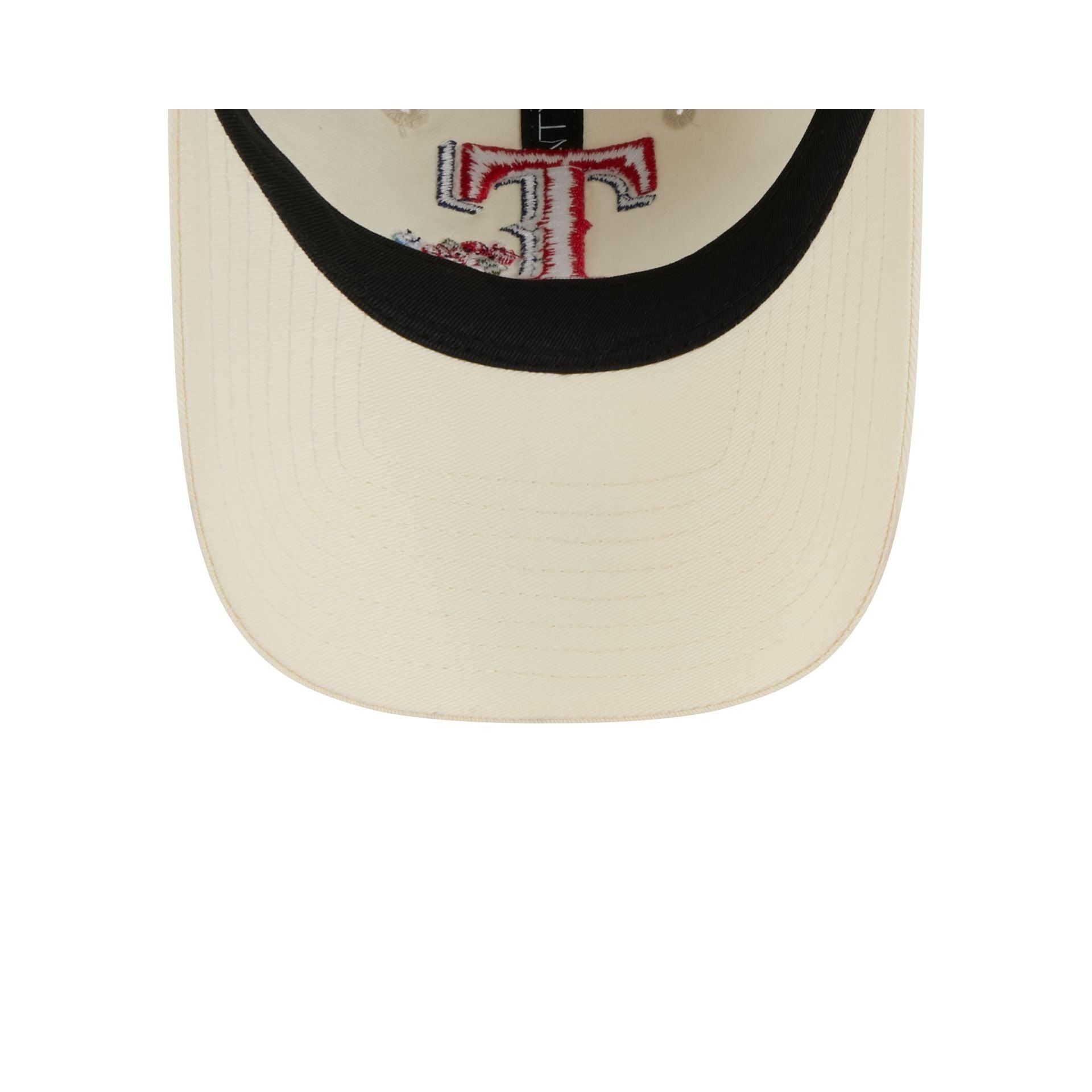 The Texas Rangers Women's Floral Stitch 9TWENTY Adjustable Cap features an embroidered Rangers logo with matching flowers at the front panels and an adjustable D-Ring closure at the rear.