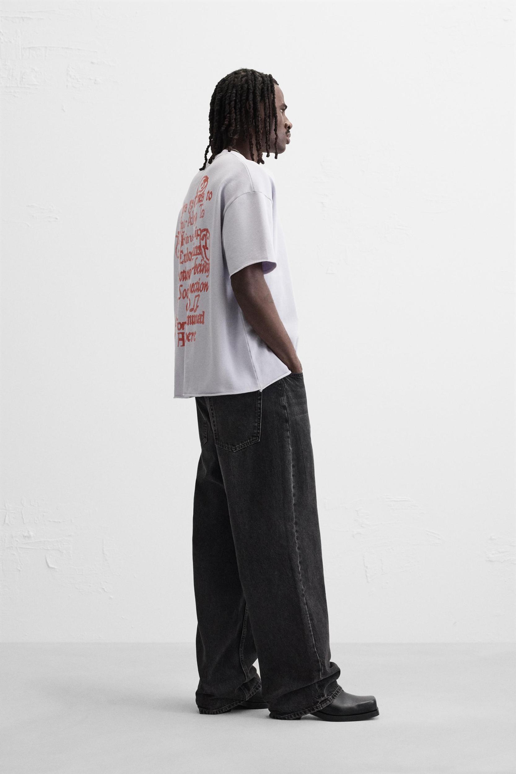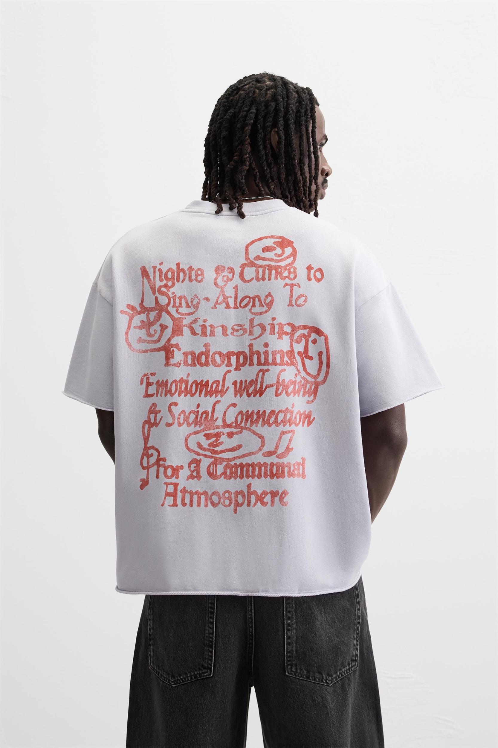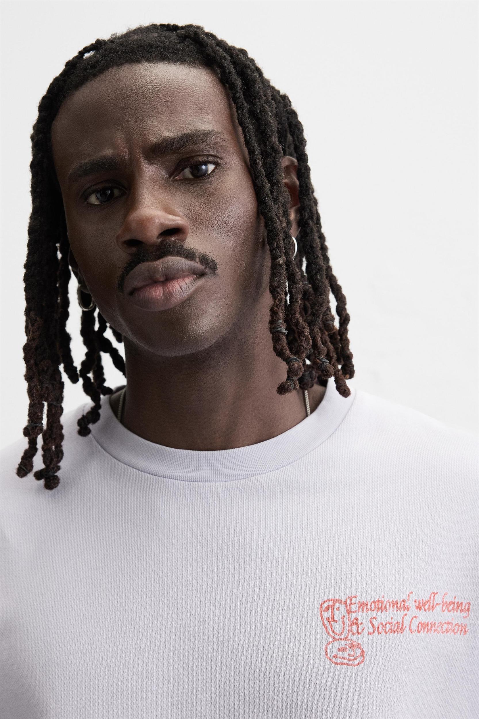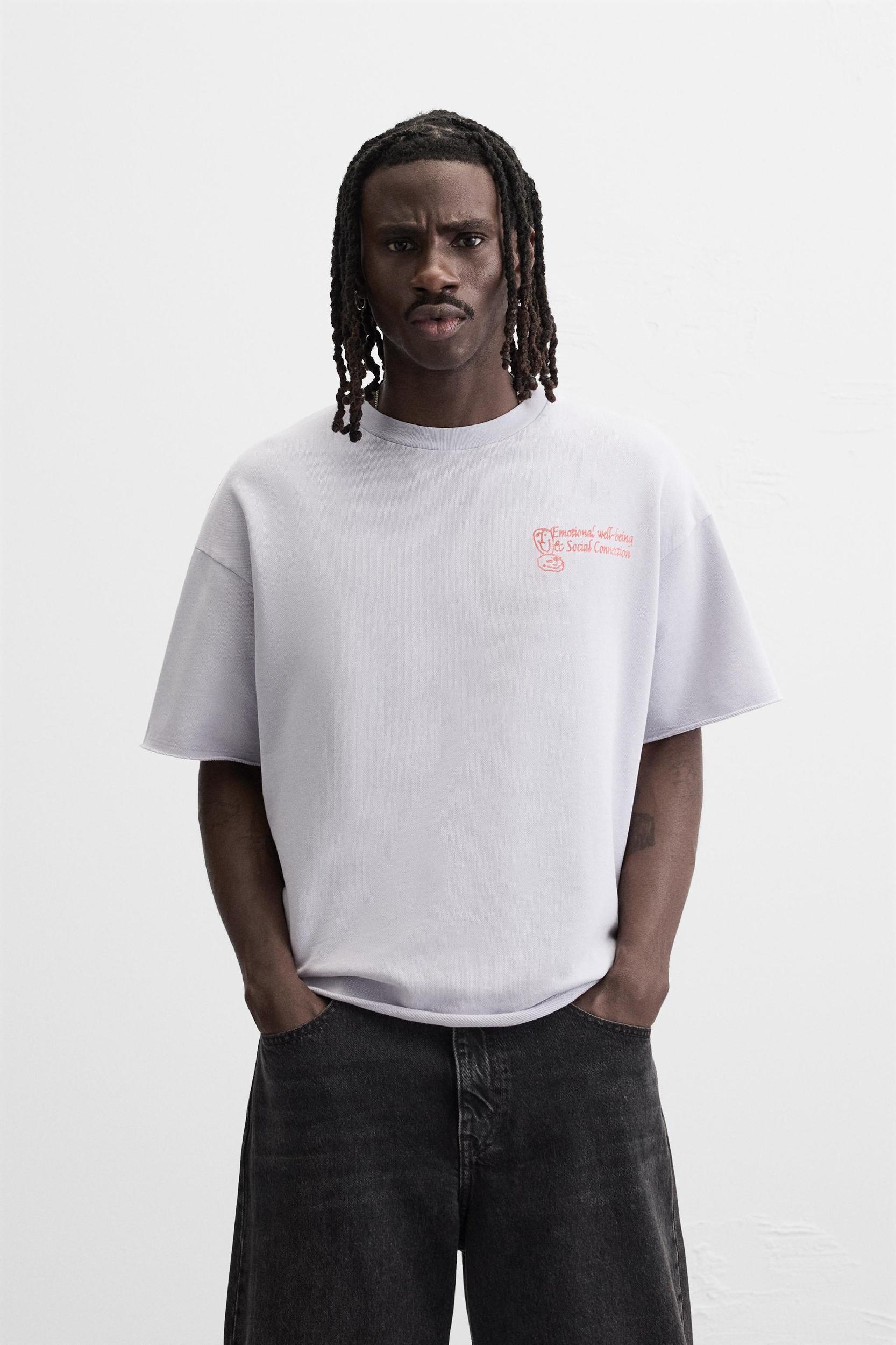 Relaxed fit sweatshirt made of cotton fabric with a French terry interior. Crew neck and short sleeves. Contrasting printed texts on the front and back. Washed effect. Raw edges.