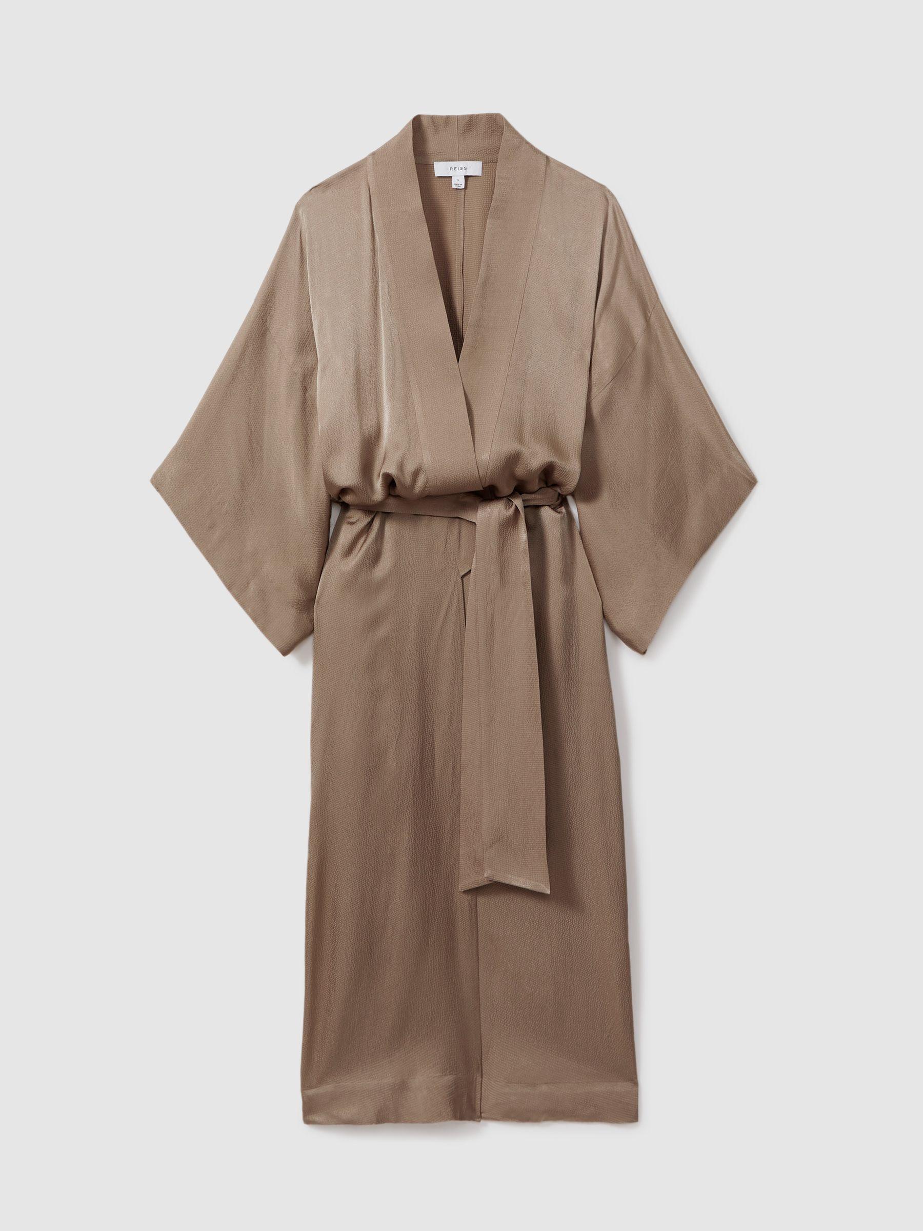 The Nell kimono is made from a textured fabric with ample sheen and a silky drape against the skin. Thread the belt through the garment for a cinched, wrap effect and embrace bell sleeves for added drama. Matching trousers. Textured. Wrap style. Belted waist. Bell sleeves. Midi length. The model is wearing a size 8. Measurements of model: 5ft 9'' / 175cm.