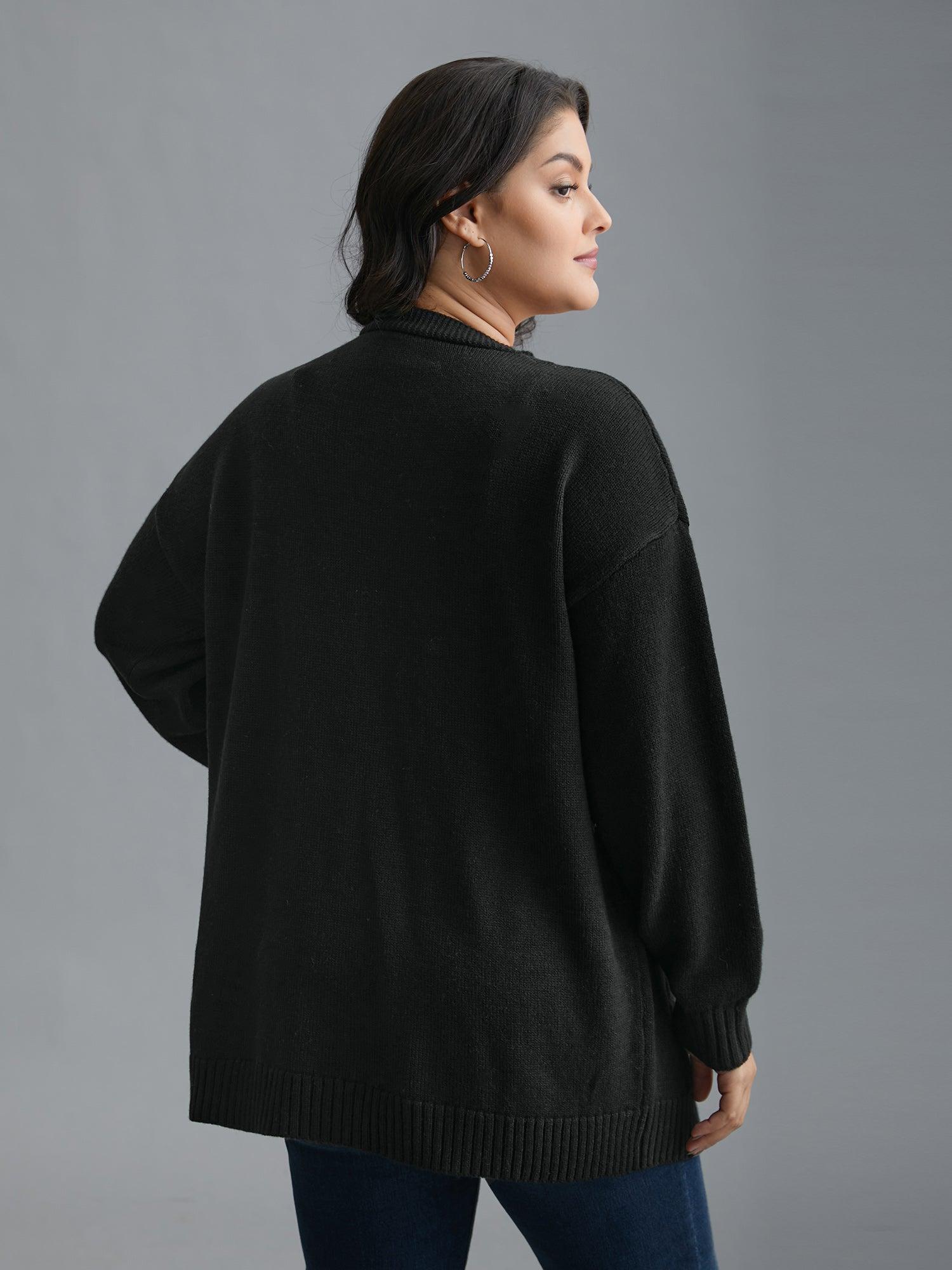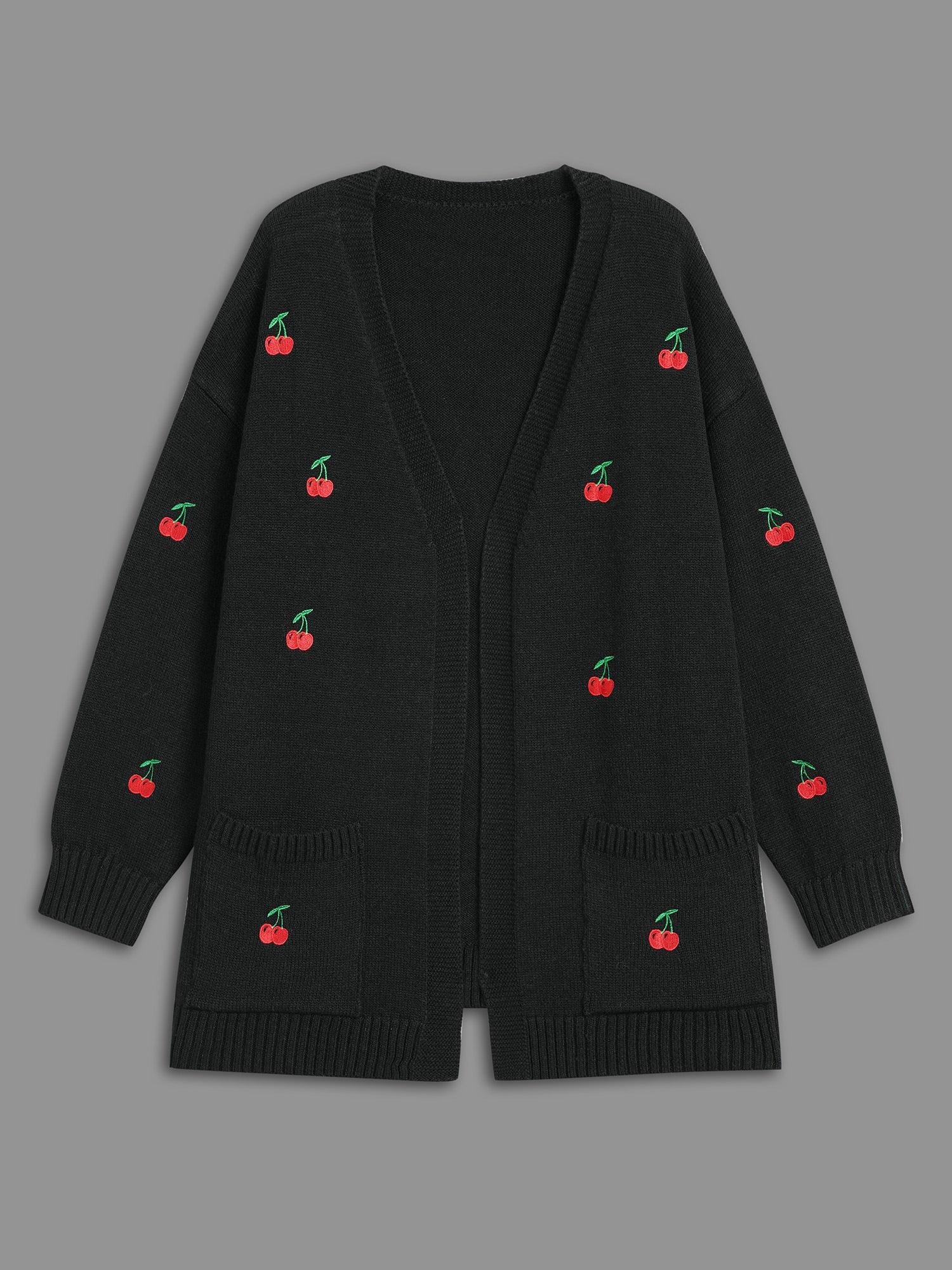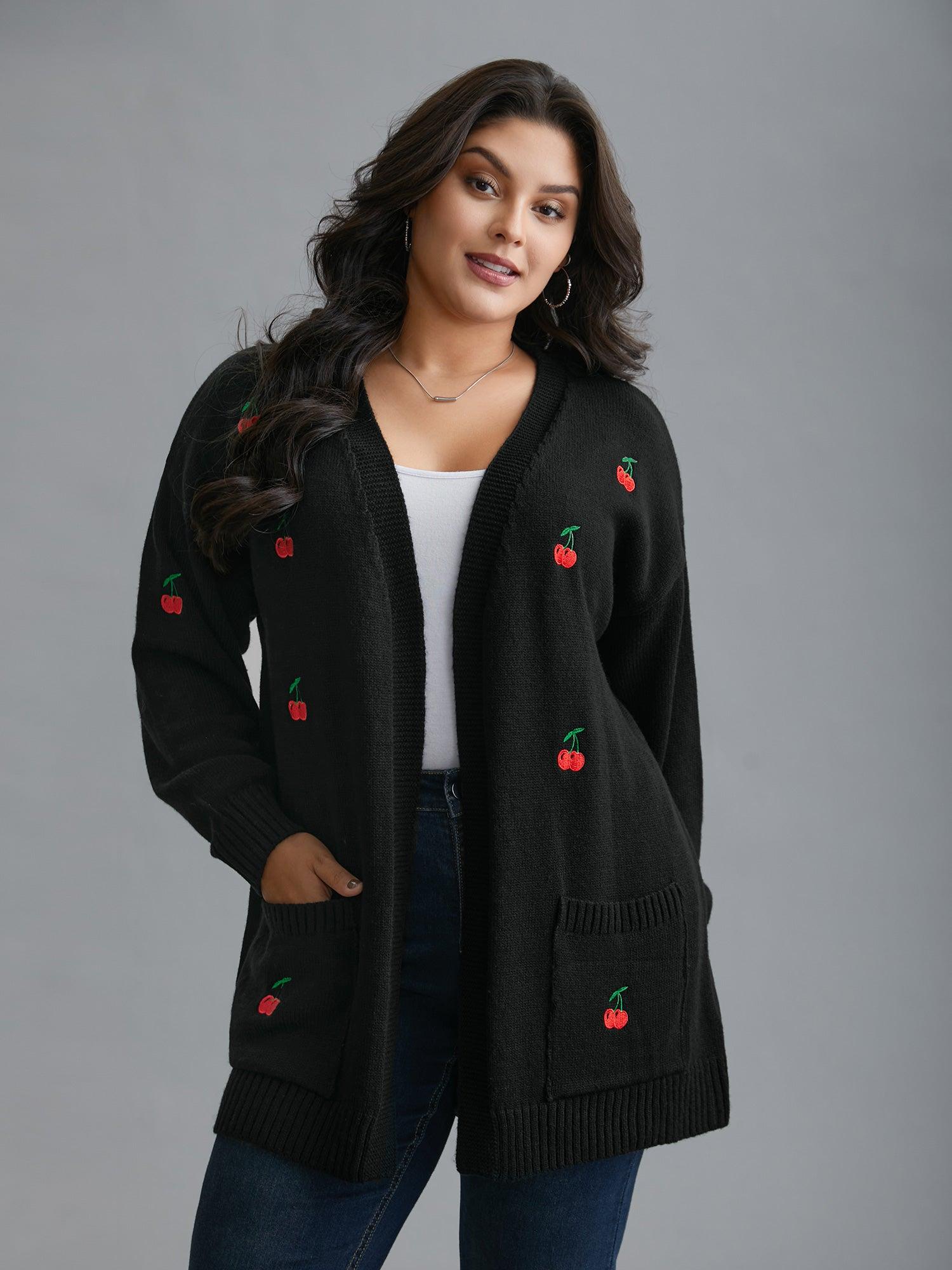 Shop Textured Cherry Embroidery Pocket Pullover now and redefine your style with confidence at BloomChic. Tailored for mid and plus-size women. This trendy Sweaters Cardigans Women, sizes 10-30. Season:Winter;Color:Black;Style:Casual;Neckline:Kimono collar;Sleeve Type:Drop shoulder sleeve;Prints:Fruit and vegetable print;Details:Texture, Embroidered;Pocket:Patch pocket;Belt:No-belt;Closure Type:Open front without closure