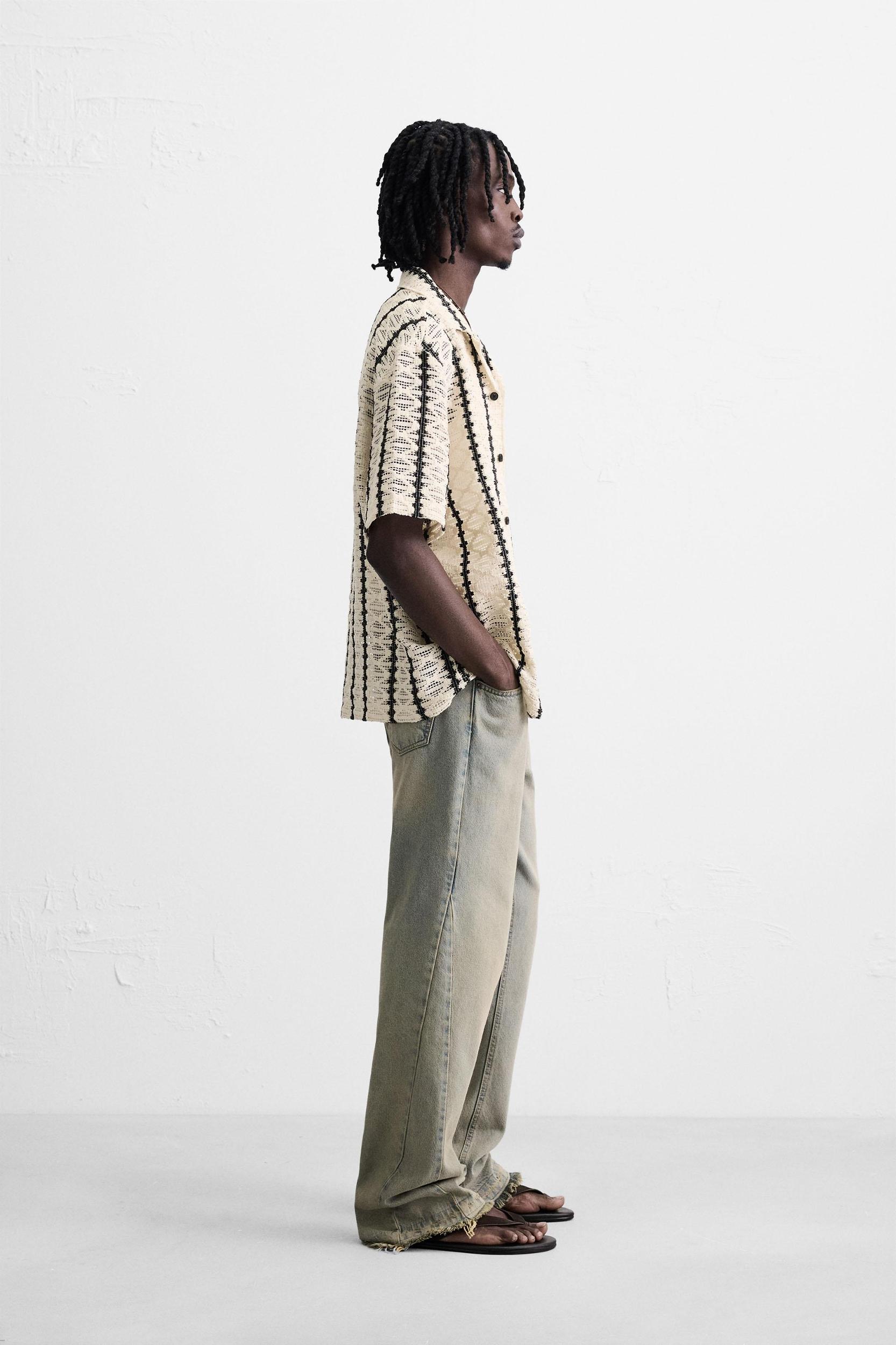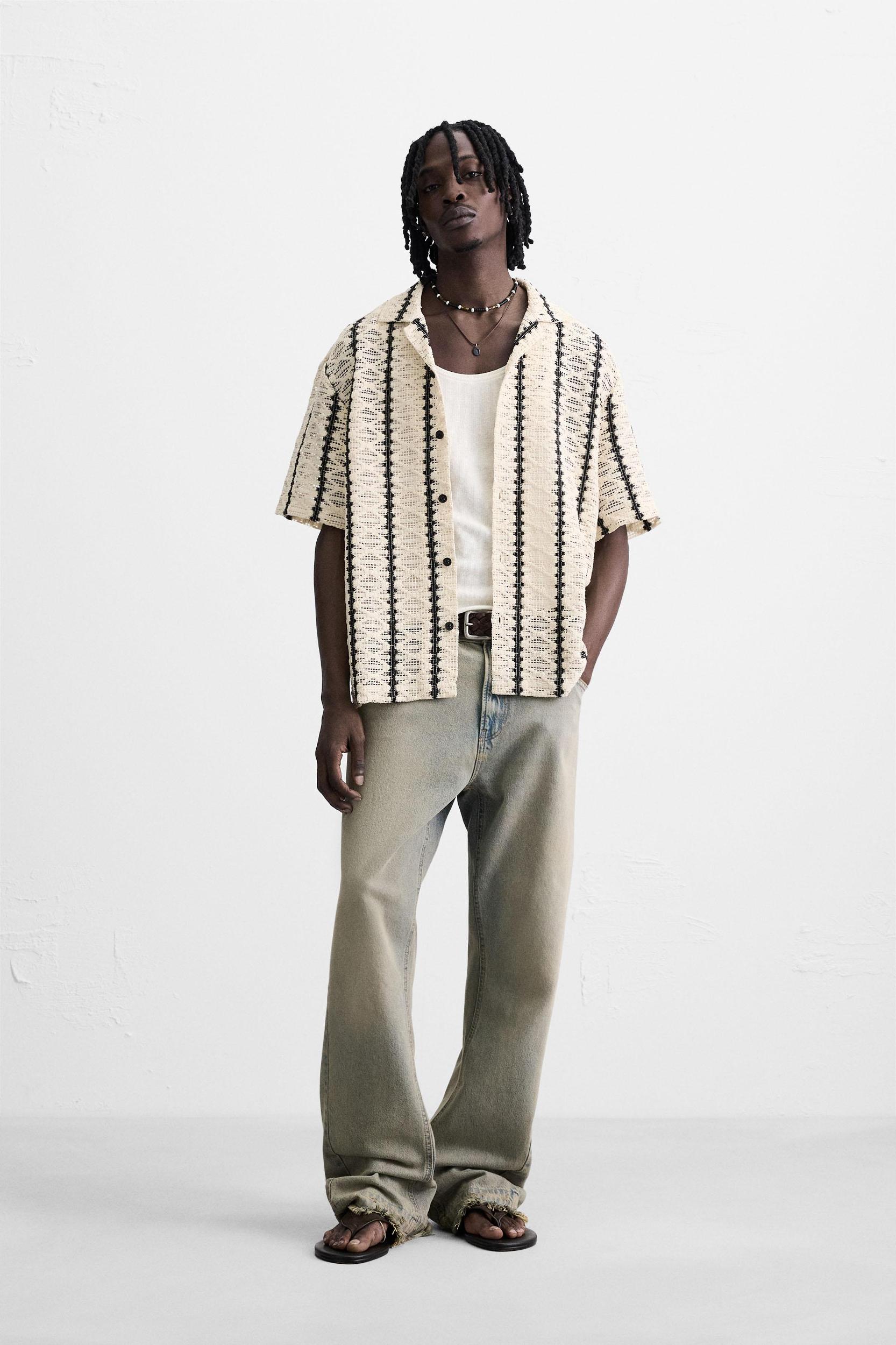 Relaxed fit shirt made of open-knit fabric. Spread collar and short sleeves. Front button closure.