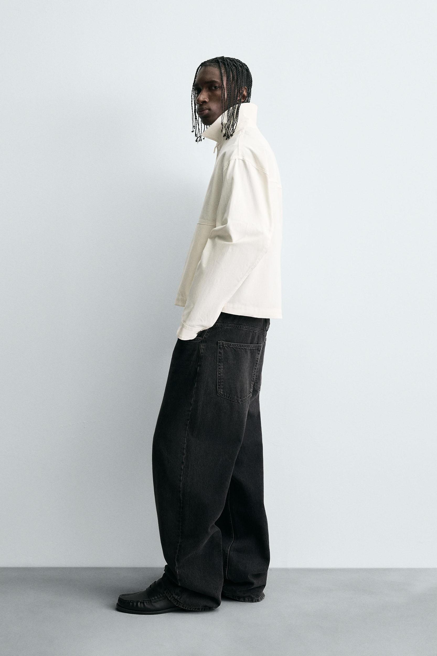 Cropped fit overshirt made of cotton canvas fabric. Lapel collar and long sleeves. Side pockets at hip. Front button closure.