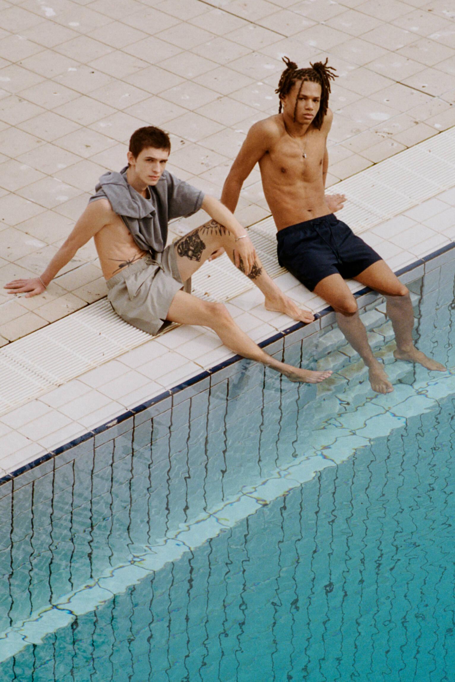 Basic board shorts with pockets and an elastic drawstring waistband. Available in several colors. Made of textured fabric.