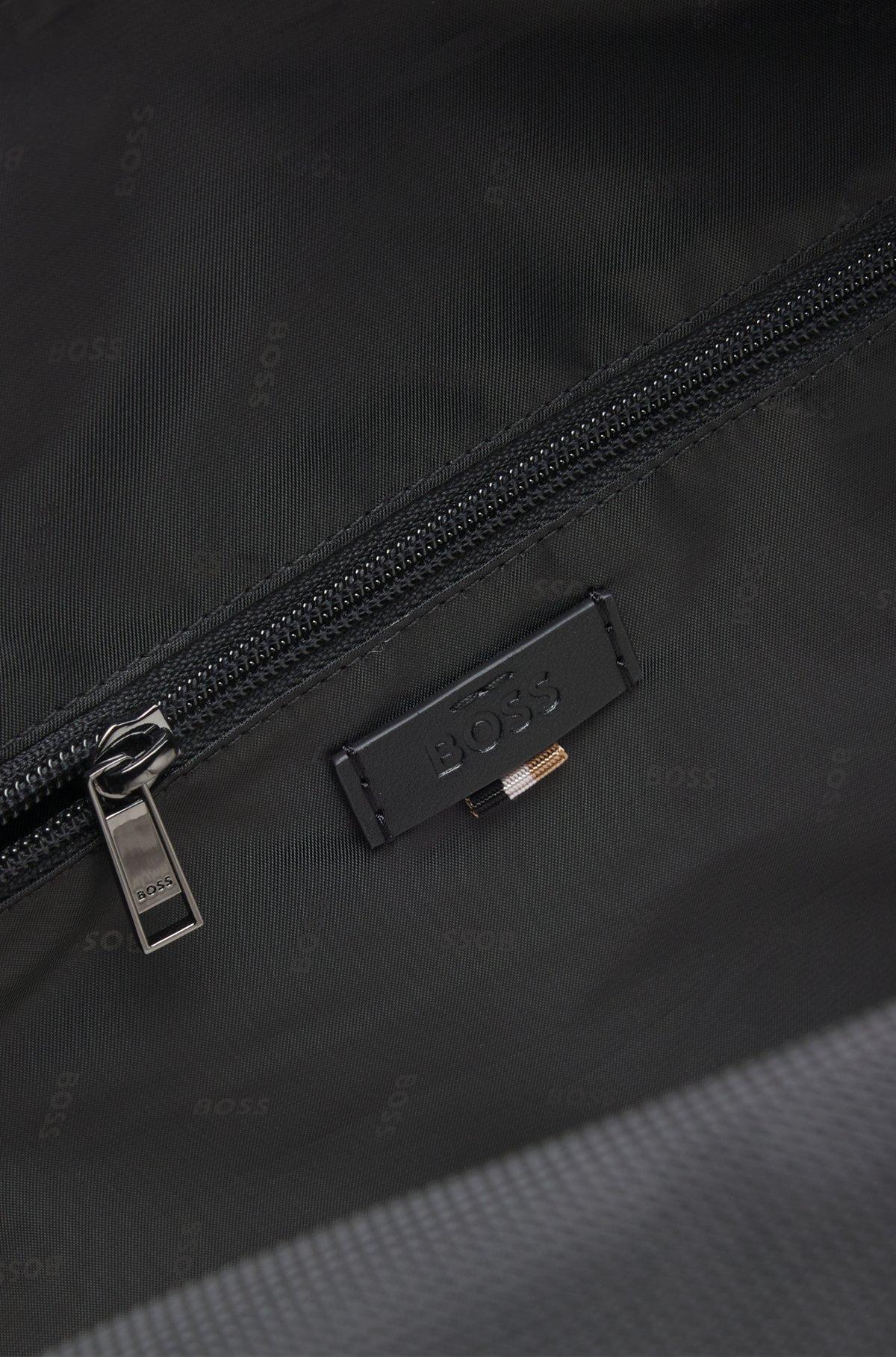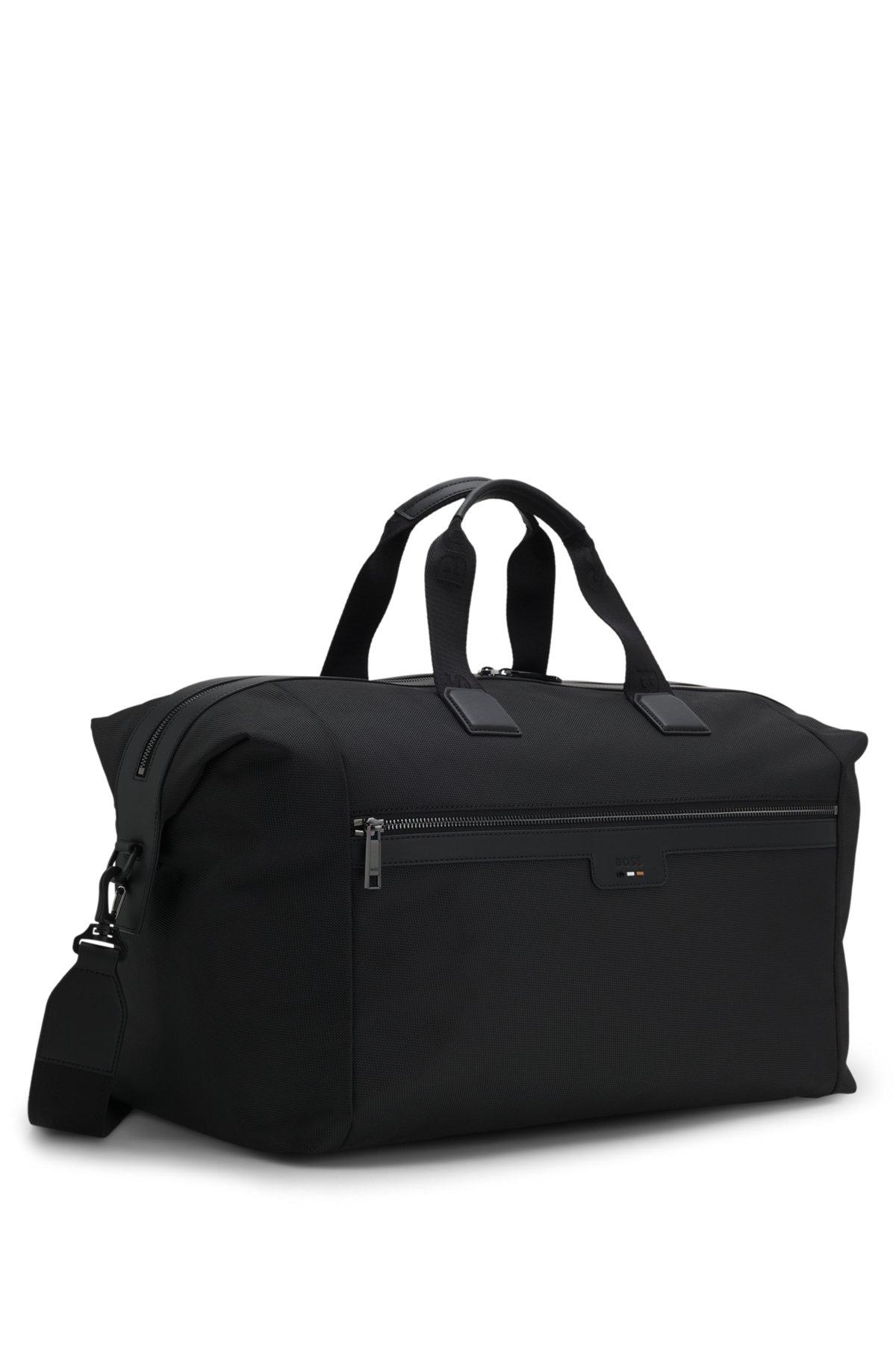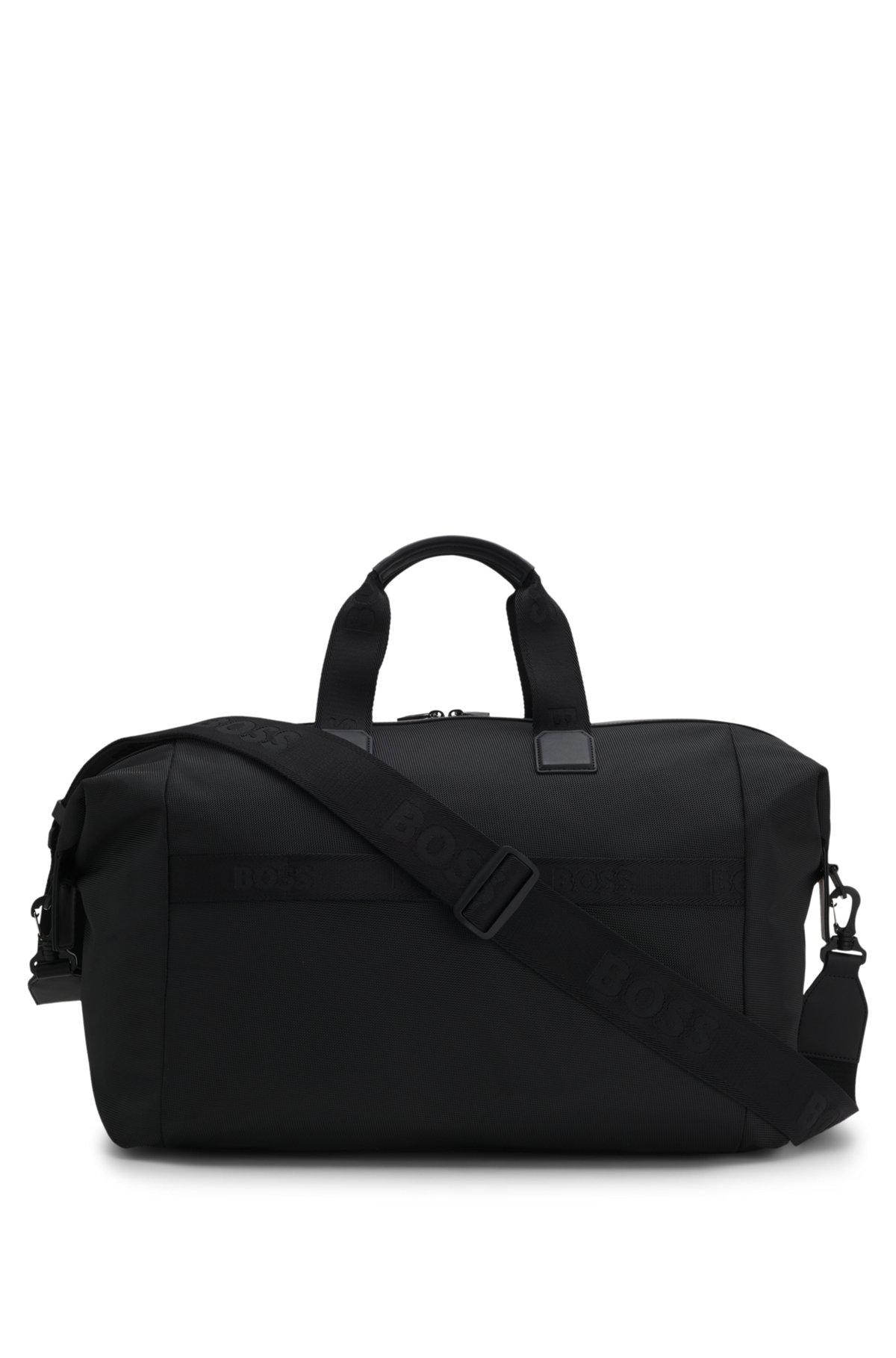Ideal for short trips and gym visits, this BOSS Menswear holdall is made in sporty material with trims in synthetic coated fabric. Detachable, adjustable strap. Synthetic coated fabric, sometimes referred to as faux leather, is a fabric designed to resemble real leather, and/or display a matte, glossy, smooth, or textured, coated appearance. Measurements: 32 x 50 x 26.5cms.