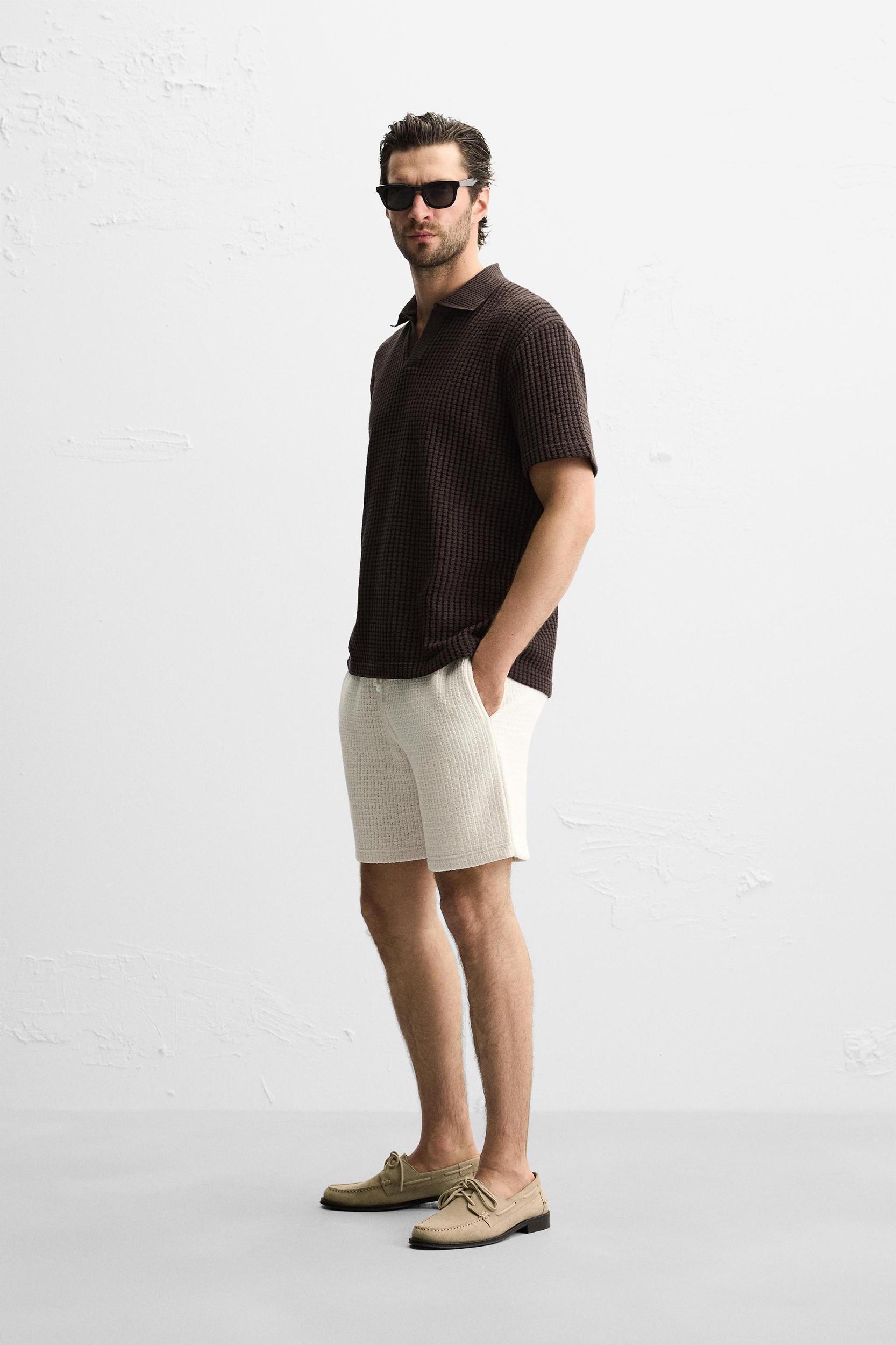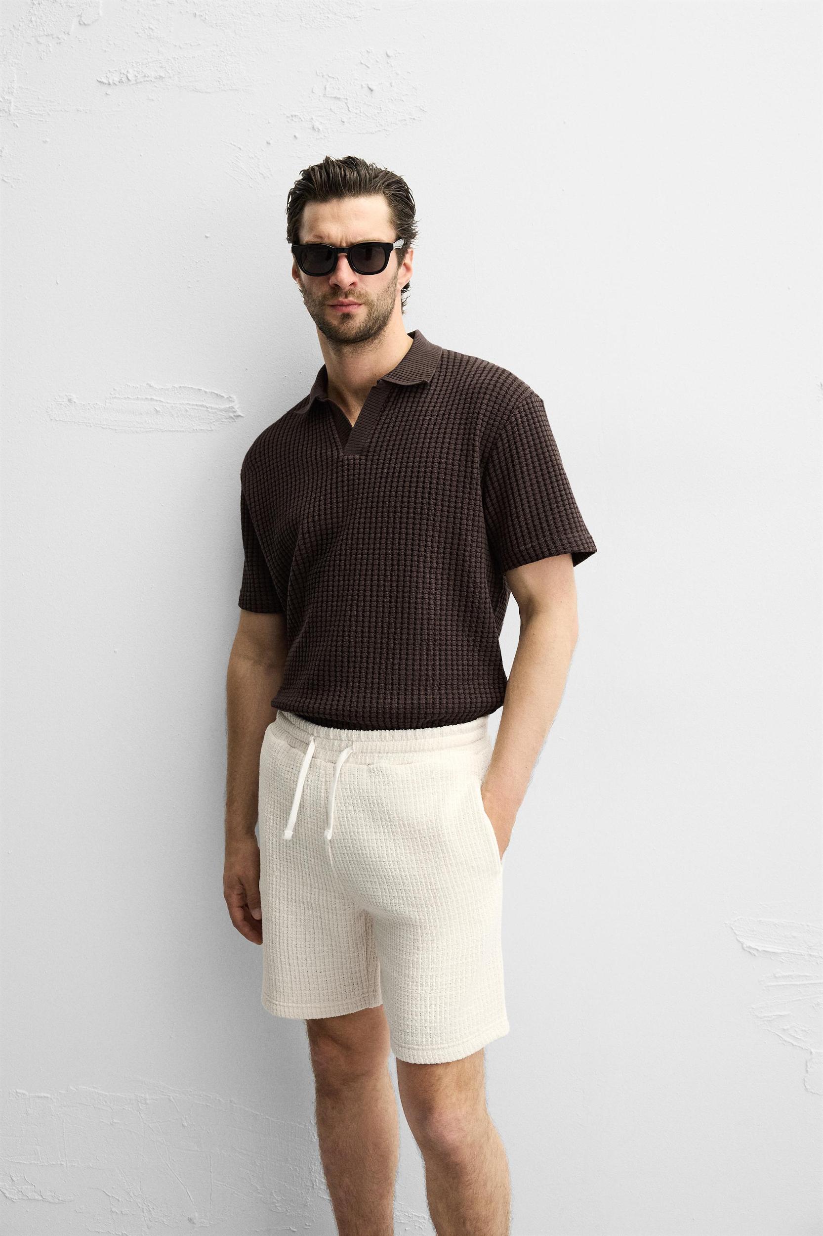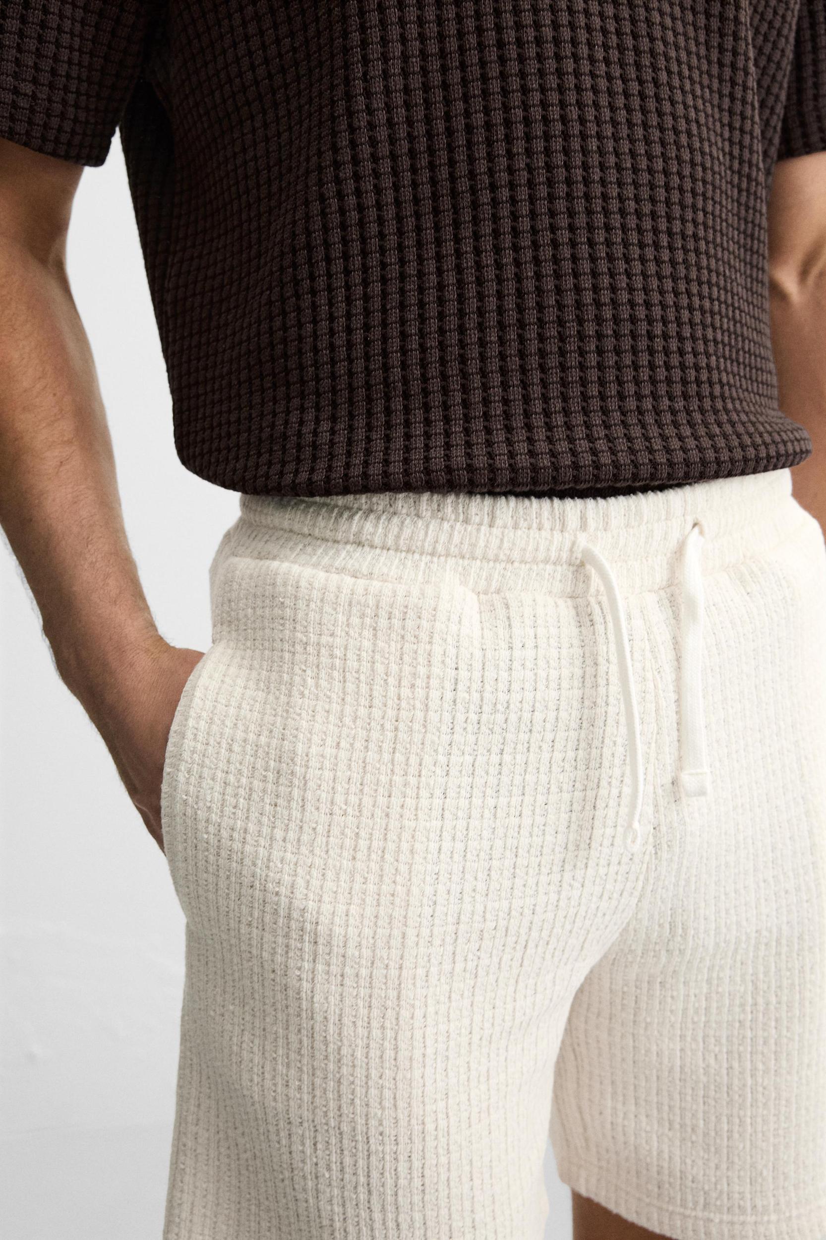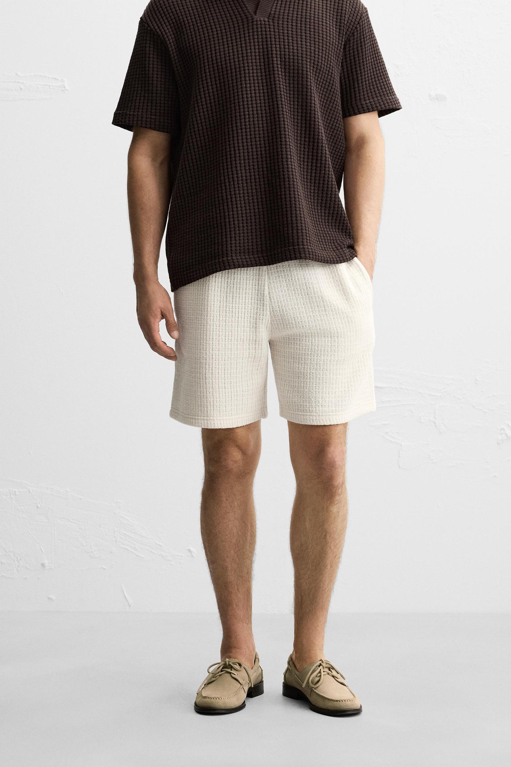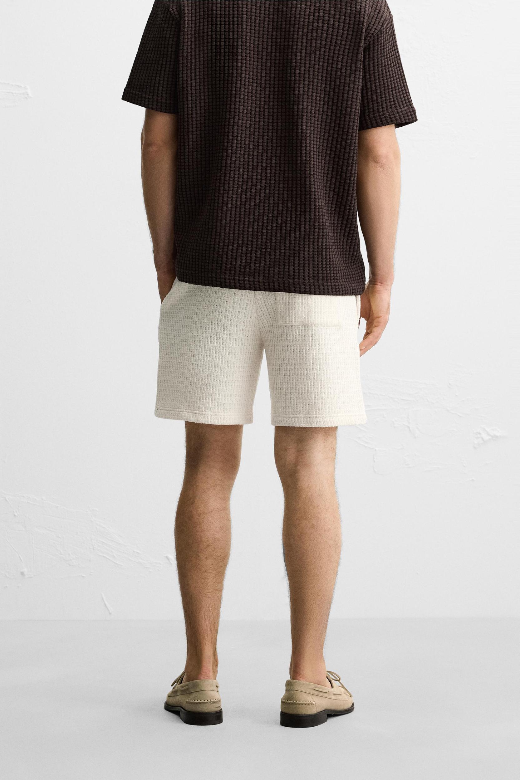 Regular fit Bermuda shorts made in cotton fabric. Adjustable elastic waistband with drawstring. Front pockets and back patch pocket detail.