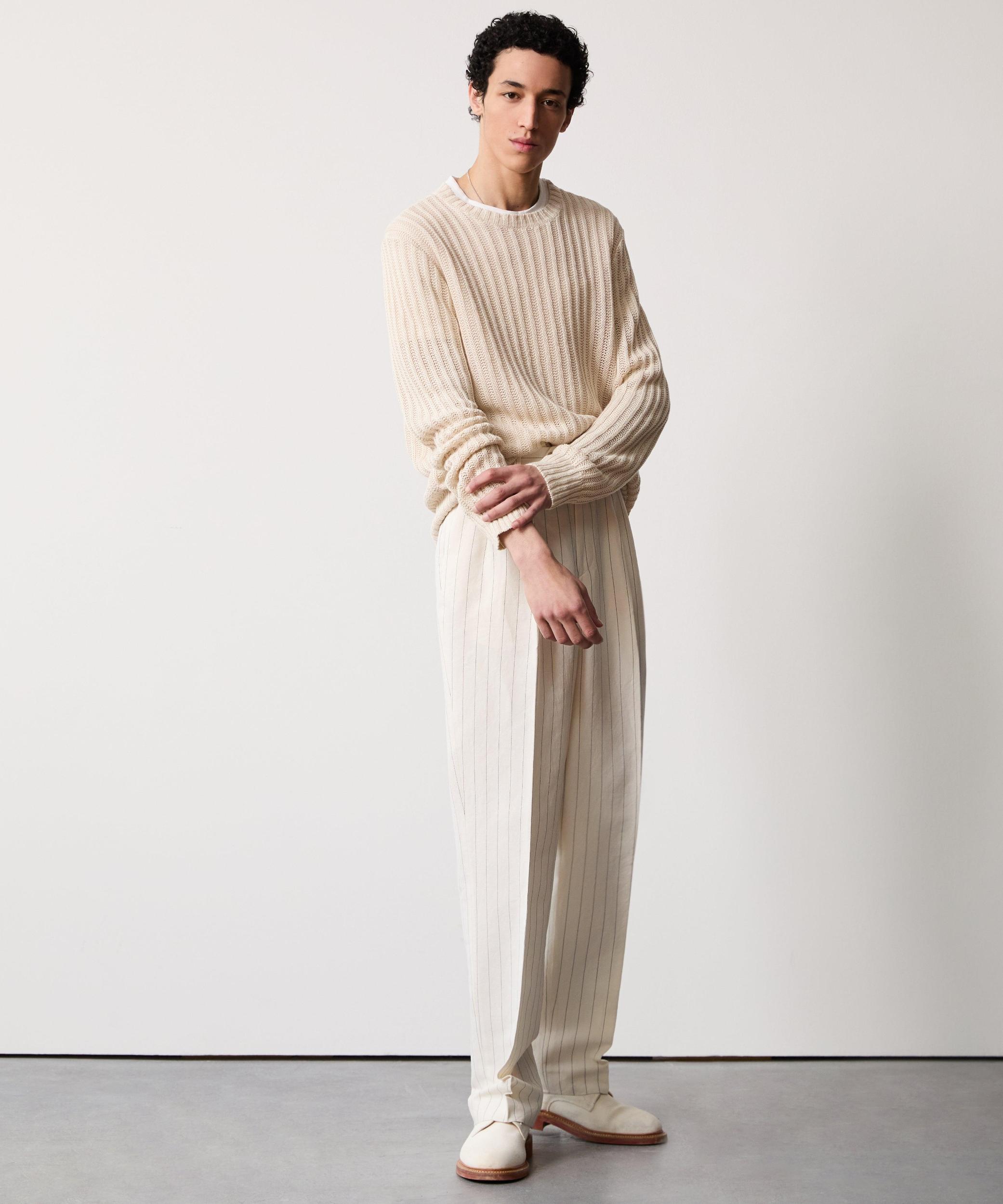 This crewneck sweater is the definition of what Todd calls a “luxe essential,” a go-to item that he’s refreshed with a refined fabric and sophisticated design details. In this case, the sweater is made from linen yarn in a variegated stitch to create a subtle, inverse ribbed look. It’s also the perfect weight for summer — light and breathable but not wrinkly, and able to wick moisture away from the skin on a foggy morning. 100% Linen 3-Gauge Knit Made in China Dry clean or hand wash cold (max water temperature 30C°). Do not machine wash (even if your machine has a "Hand Wash" setting). Remove promptly and lay flat to dry. Style SW3230063