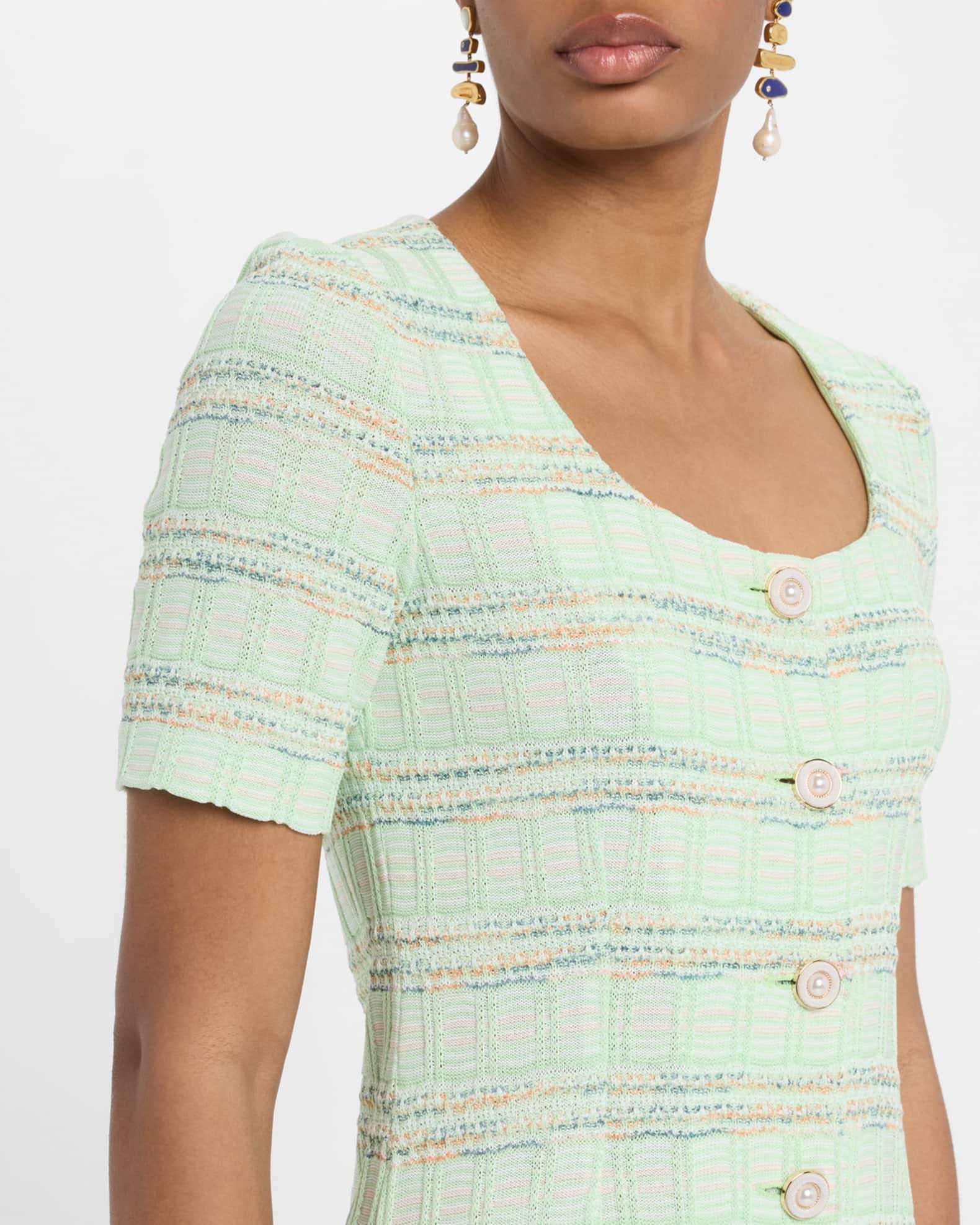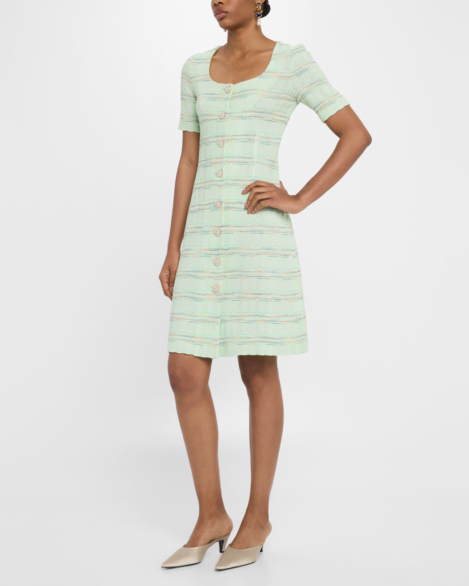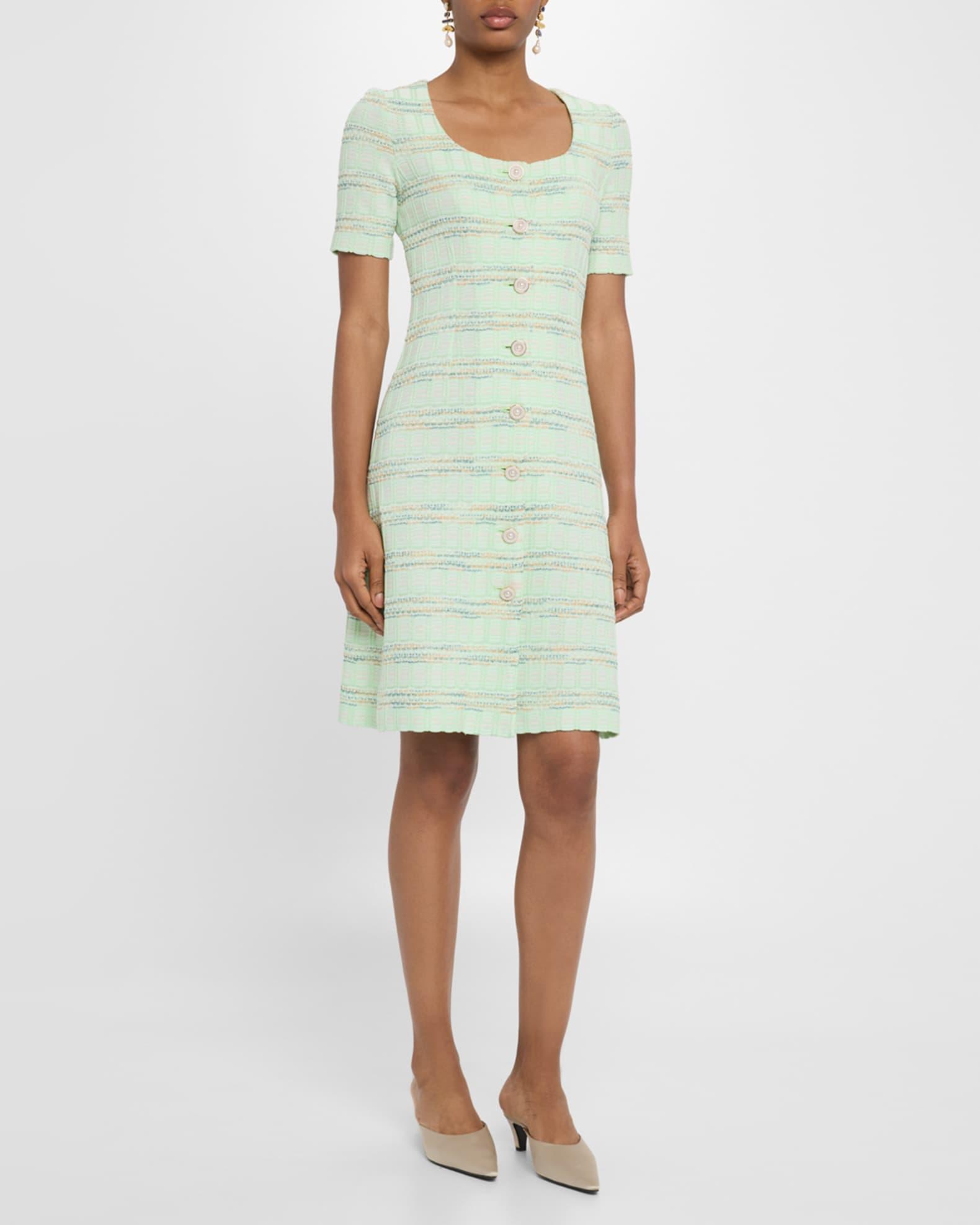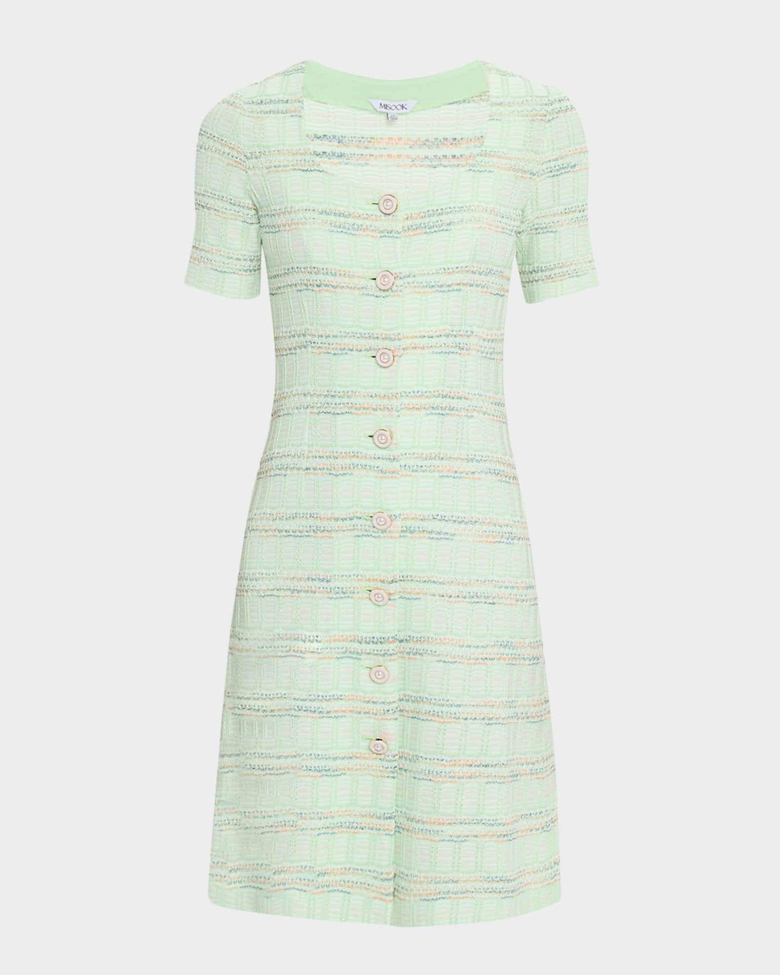 Misook sweater dress crafted in a soft textured plaid knit Approx. 38"L from shoulders to hem Scoop neckline; button front Short sleeves Hem hits around the knee A-line silhouette Acrylic/Amni® nylon/Promodal® rayon Machine wash cold Imported