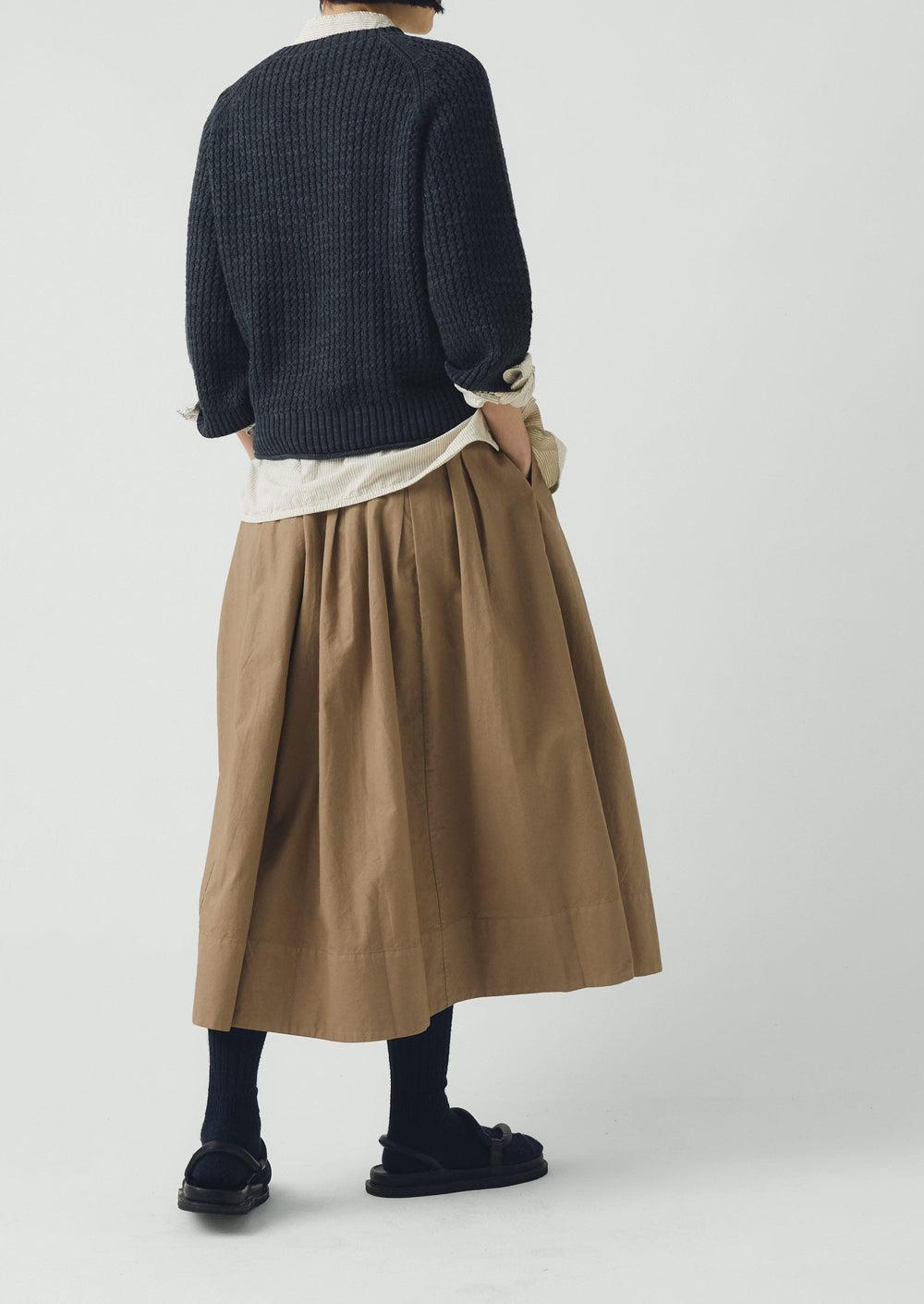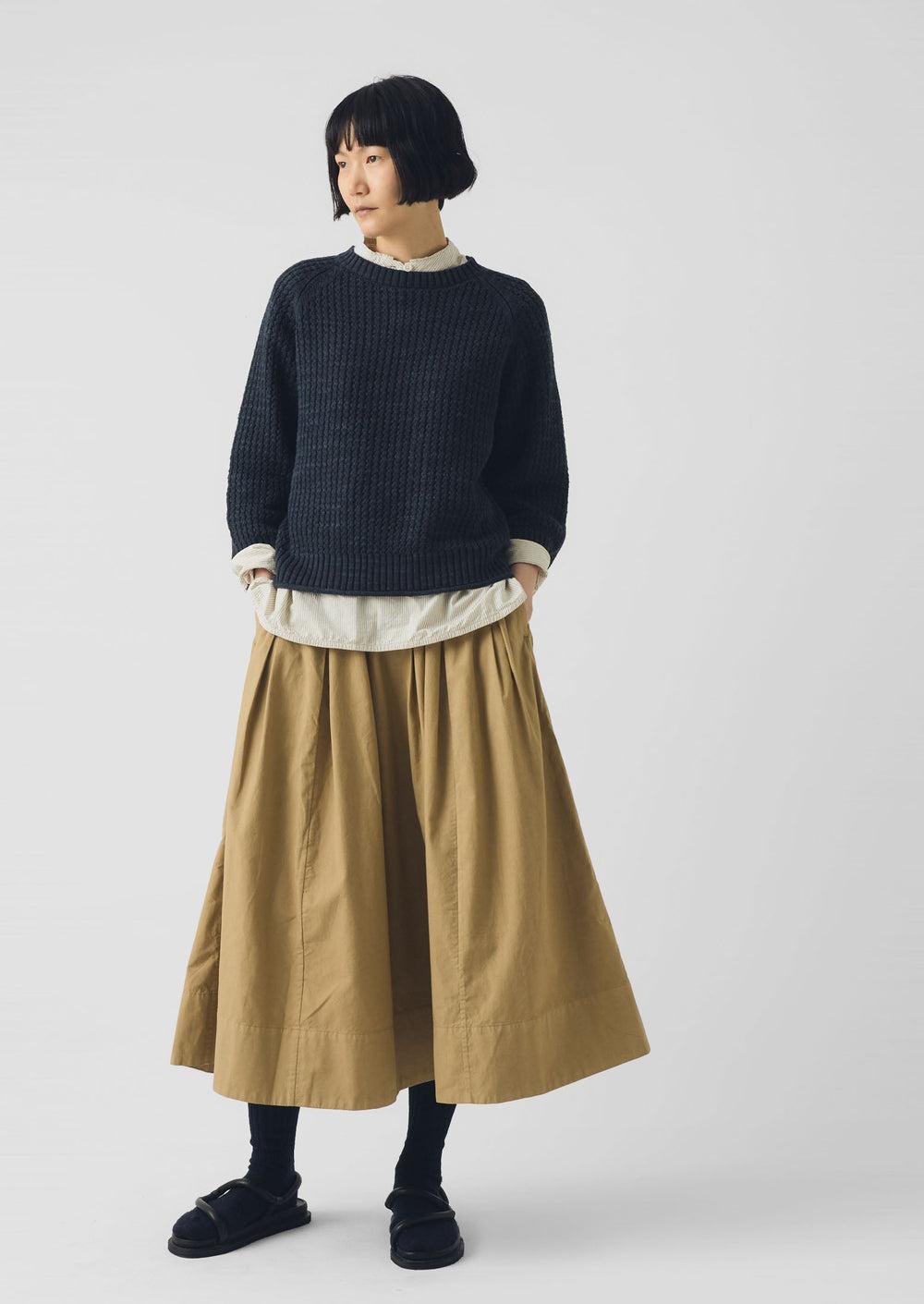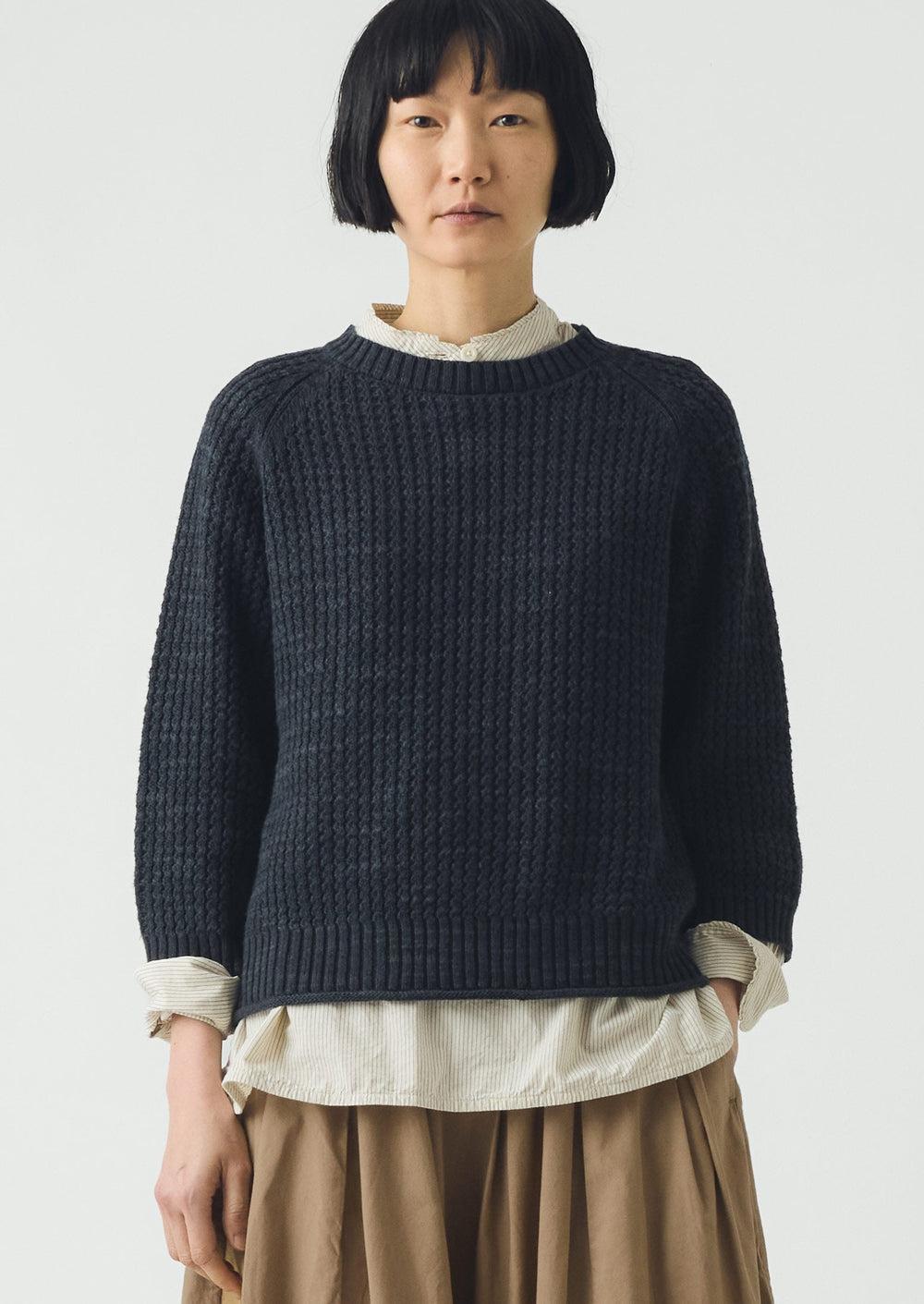 A defined rib stitch brings texture to our sweater. Knitted from a weighty blend of linen and cotton in a racked-rib stitch. Shaped to an easy silhouette with a ribbed crew neck and three-quarter-length raglan sleeves, then finished with a roll at the hem.