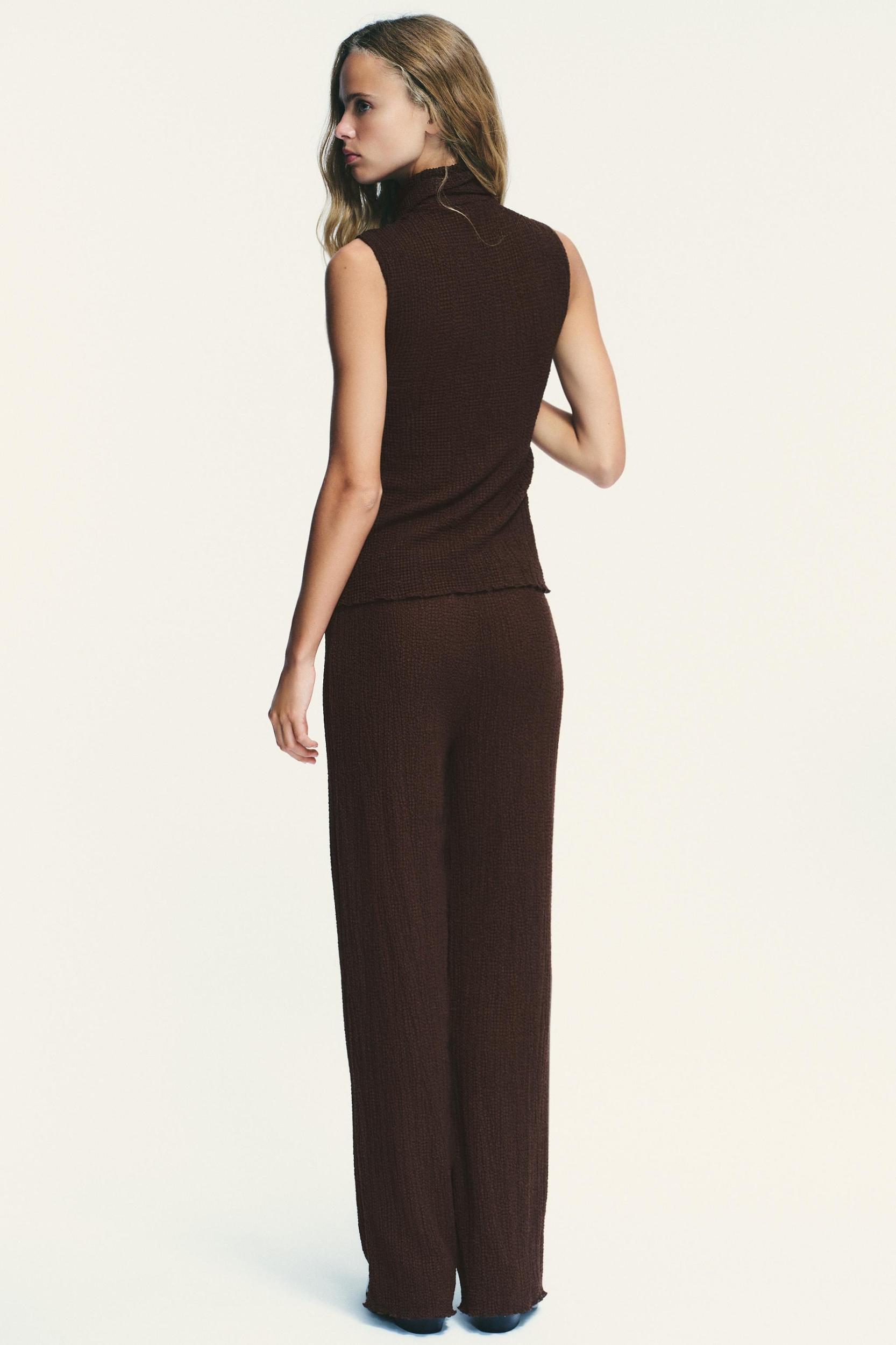 Top made in textured fabric. High neck and sleeveless. Matching fabric scarf detail.