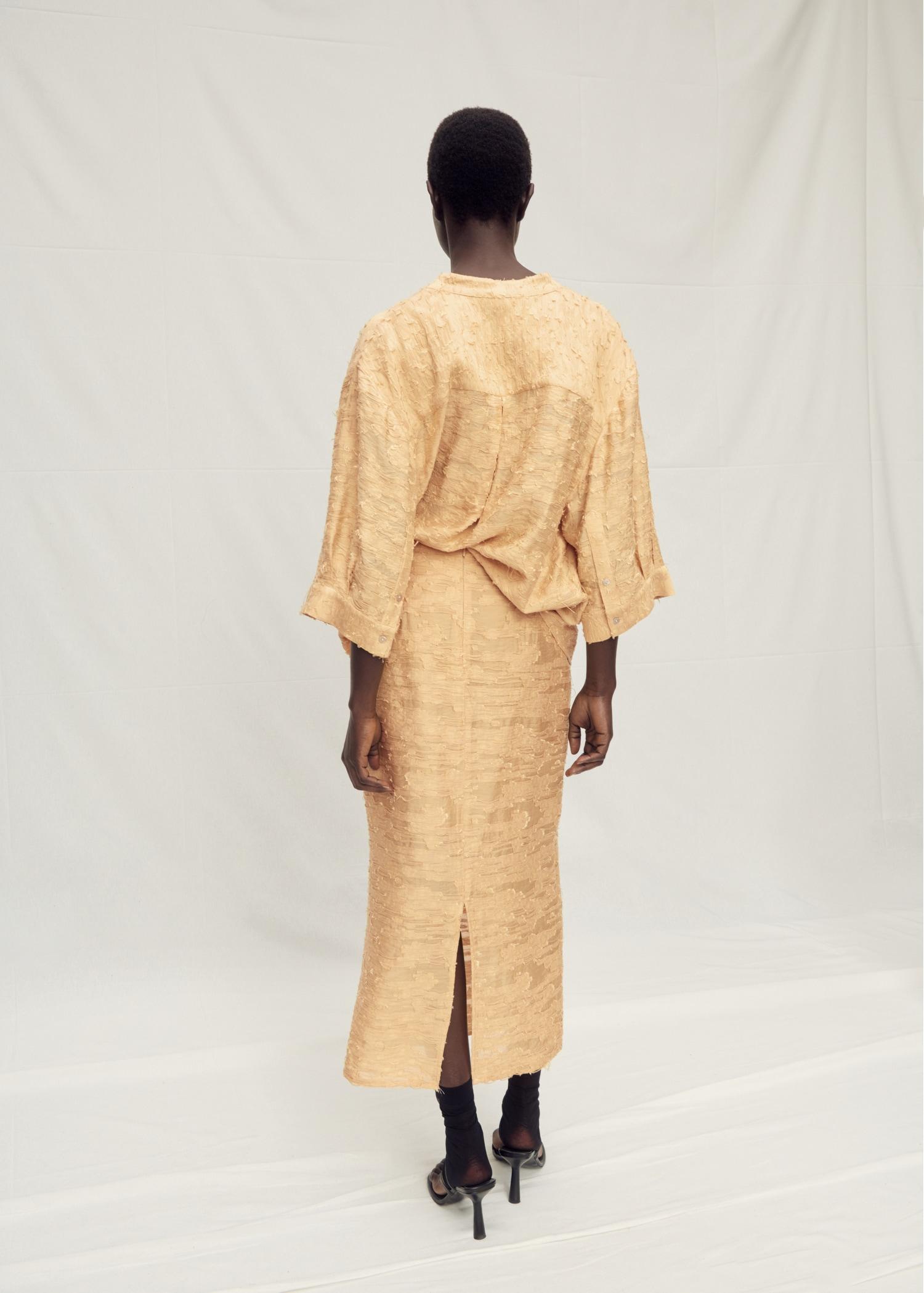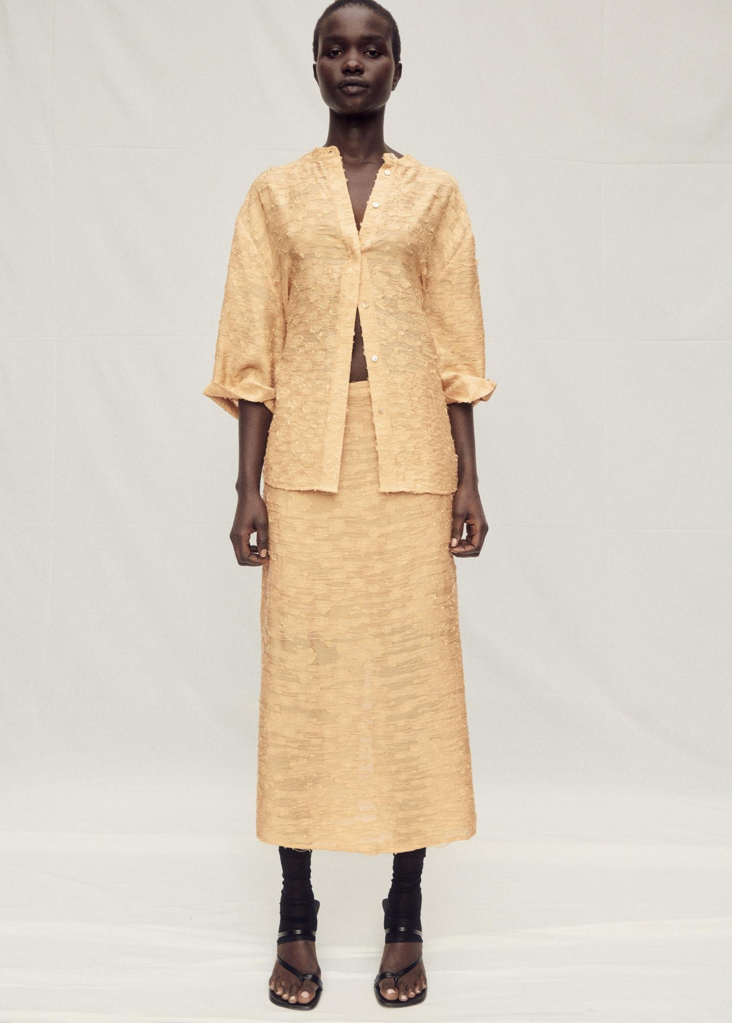 Textured fabric. Midi design. Straight design. Mid-rise. Back Slit at the Hem. Back zipper closure. Inner lining. Total look. Selection Collection. Side length 34.65 in. Skirt length 34.65 in. A selection of refined garments, made with quality materials to create a feminine and contemporary closet
