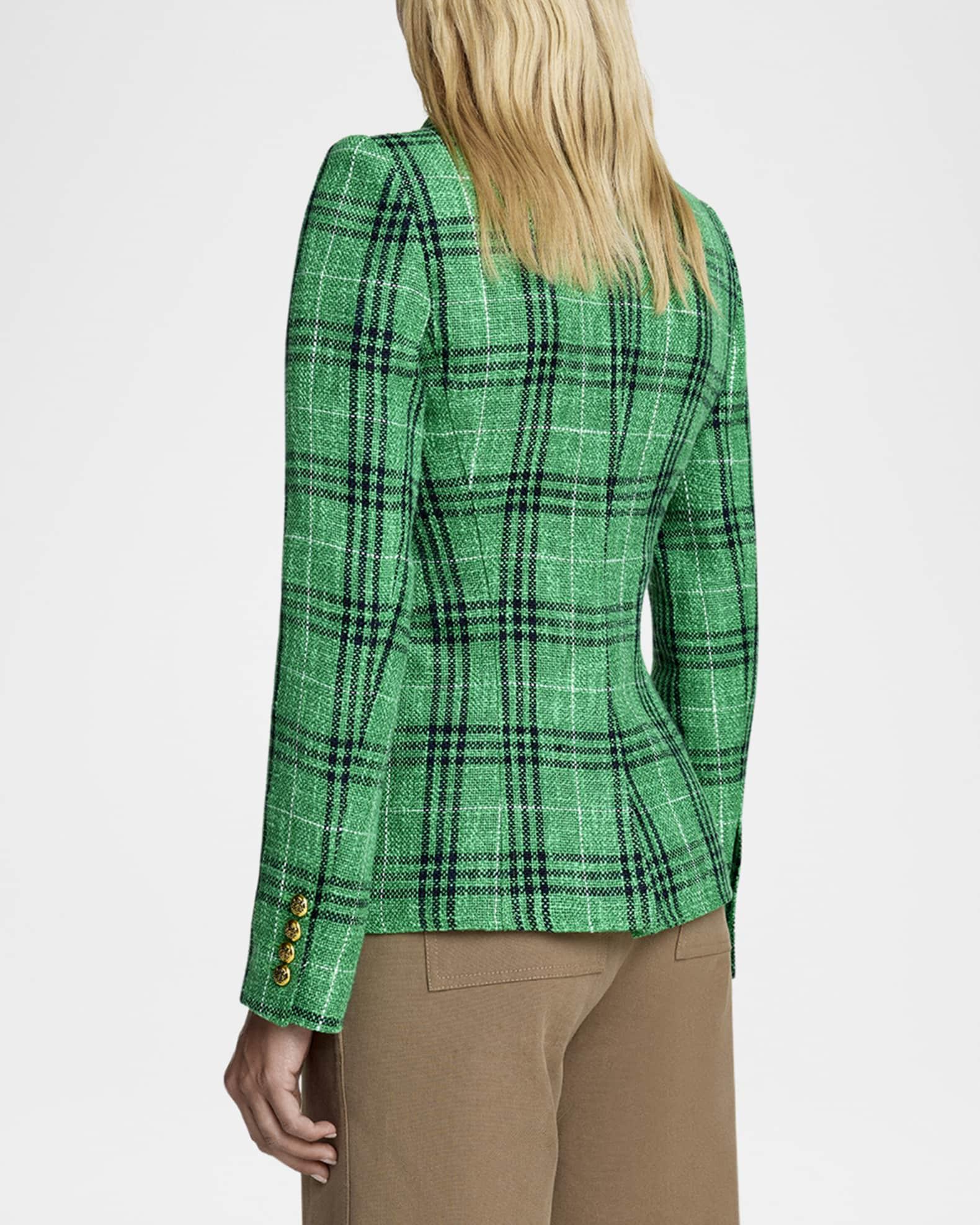 Smythe textured summer plaid blazer in a cut-away silhouette Approx. 25"L from shoulder to hem Feminine portrait neck collar Long sleeves Exaggerated bias-cut welt pockets Mid-length Tailored fit Button front closure Linen/cotton Made in Canada