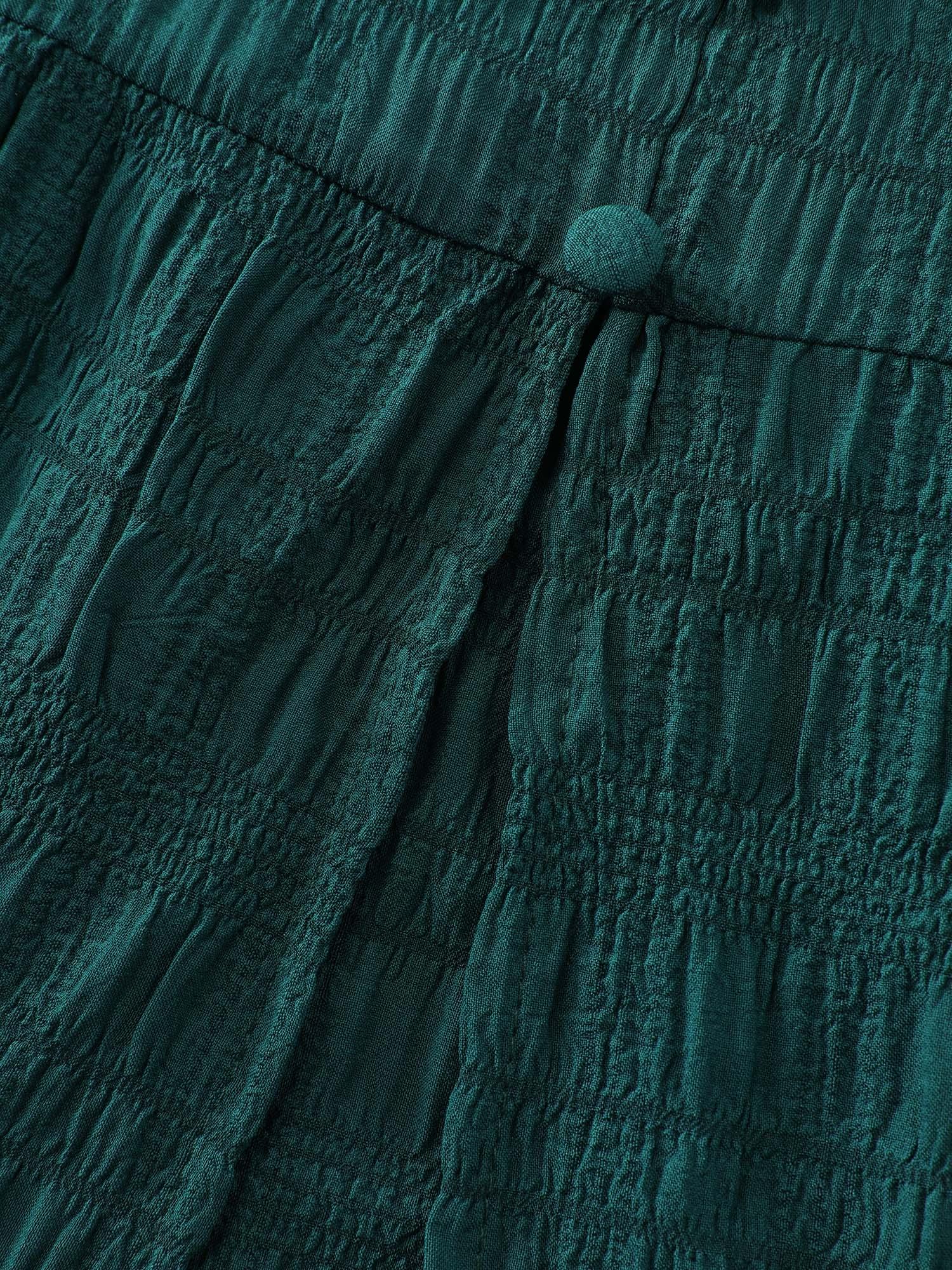 Shop Textured Triangular Cinched-Waist Tiered Maxi Dress now and redefine your style with confidence at BloomChic. Tailored for mid and plus-size women. This trendy Dress, sizes 10-30. You can never go wrong with BloomChic Dresses. Color:Dark Green;Style:Timeless;Neckline:V-neck;Sleeve Type:Elastic cuff;Prints:Synthetic texture;Details:Gathered, Texture, Shirred;Pocket:Side seam pocket;Belt:No-belt;Closure Type:Decorative button