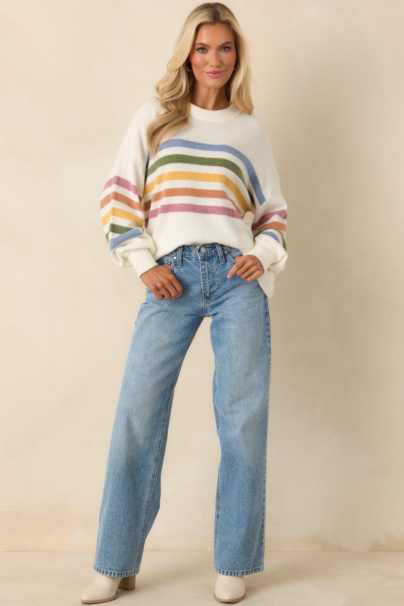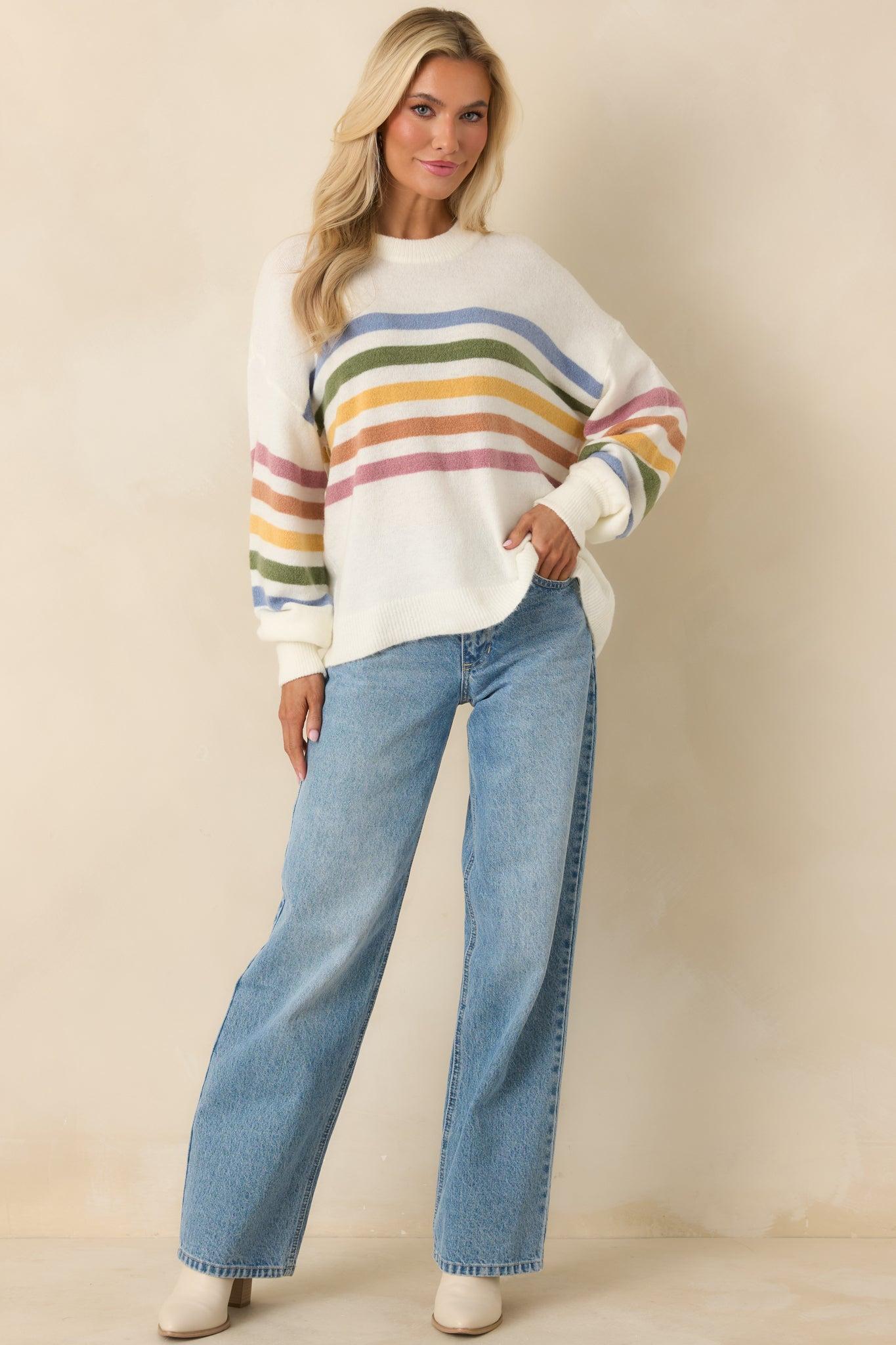 That Tracks Ivory Multi Knit Striped Crewneck Sweater is the kind of sweater that just makes sense. Soft ivory tones paired with muted, multicolor stripes give it a relaxed, pulled-together feel that works with denim, trousers, or layered over a dress. Easy, cozy, and quietly stylish, it’s one of those pieces you’ll reach for without overthinking it. This ivory knit sweater features a classic crew neckline and multicolor horizontal stripe detailing across the chest and sleeves. Designed with a relaxed fit, it includes long sleeves with ribbed cuffs, a ribbed neckline, and a straight hem. Crafted from a soft, lightweight knit fabric.