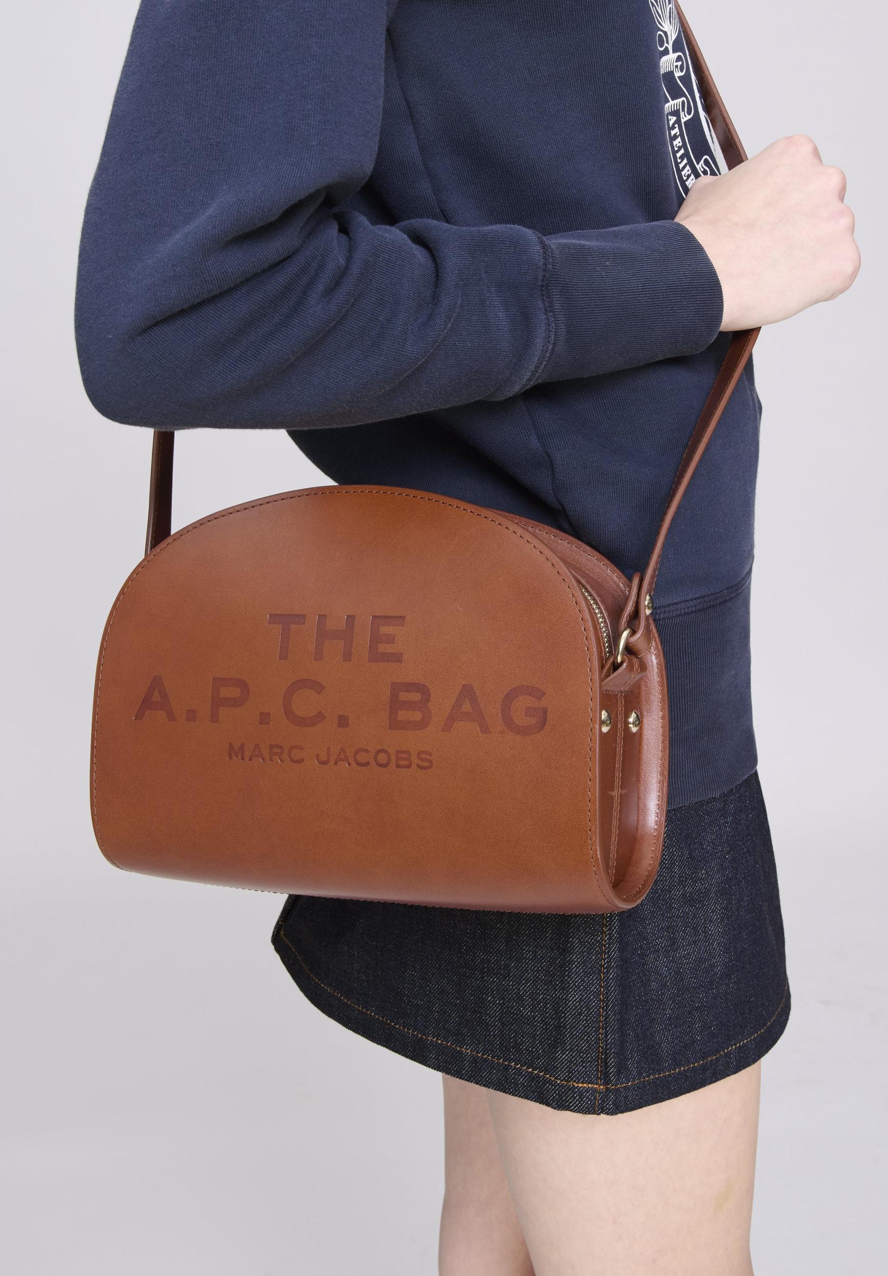 A.P.C. x Marc Jacobs interaction bag. - Iconic A.P.C. bag in smooth leather.- THE A.P.C. BAG Marc Jacobs embossed on the front.- A leather patch sewn on the back in the style of Marc Jacobs leather goods.- Gold zip closure and double leather pull tab.- Inside pocket.- Adjustable shoulder strap with metal buckle.- Carried on the shoulder or across the body.- Gold rivets on the sides.