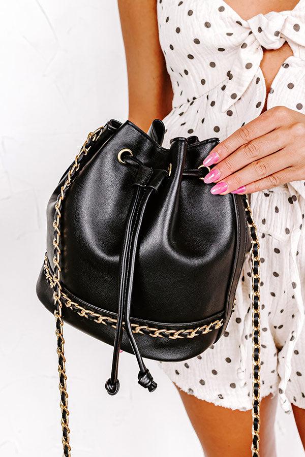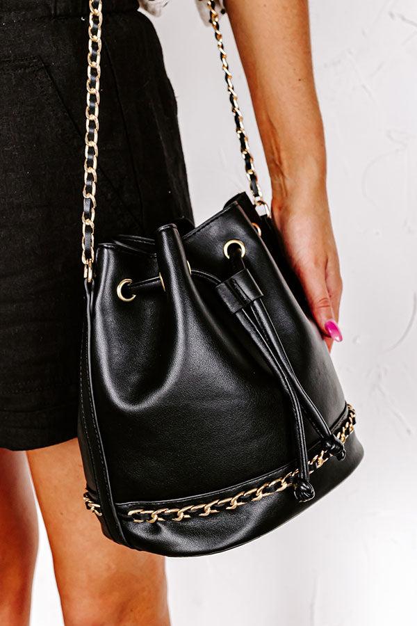 - It does not get any more chic than this luxe faux leather bag! - Sleek faux leather material with a gold accent chain - Gold hardware - An attached faux leather and chain shoulder strap - A spacious unlined pouch - Drawstring top closure - Gold toned hardware