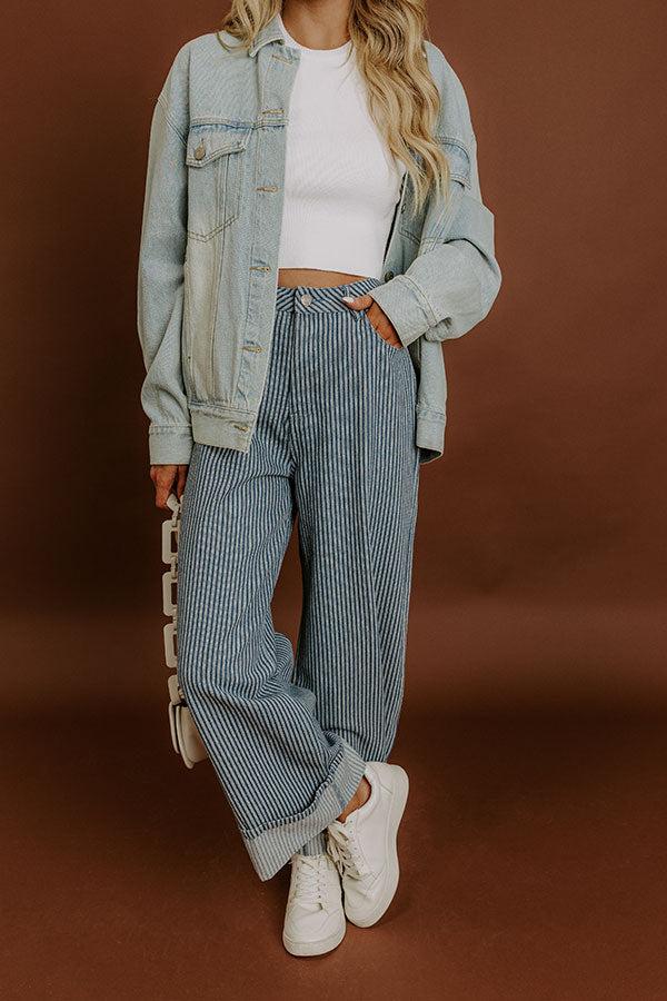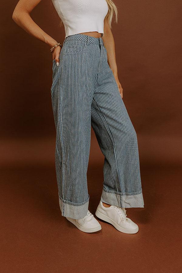 - Add instant style to your wardrobe with bold striped jeans! The wide leg cut and cuffed hems make them a casual denim essential with trendy appeal. - Unlined denim material with an ivory colored striped pattern - Belt loops - A hidden zip fly and button closure - Functional front and back pockets - A wide leg silhouette that ends in cuffed hems