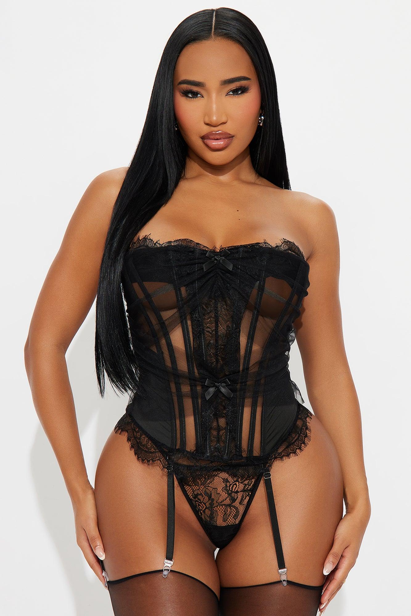 The Aline Boned Mesh Bow Corset 2 Piece Set - Black