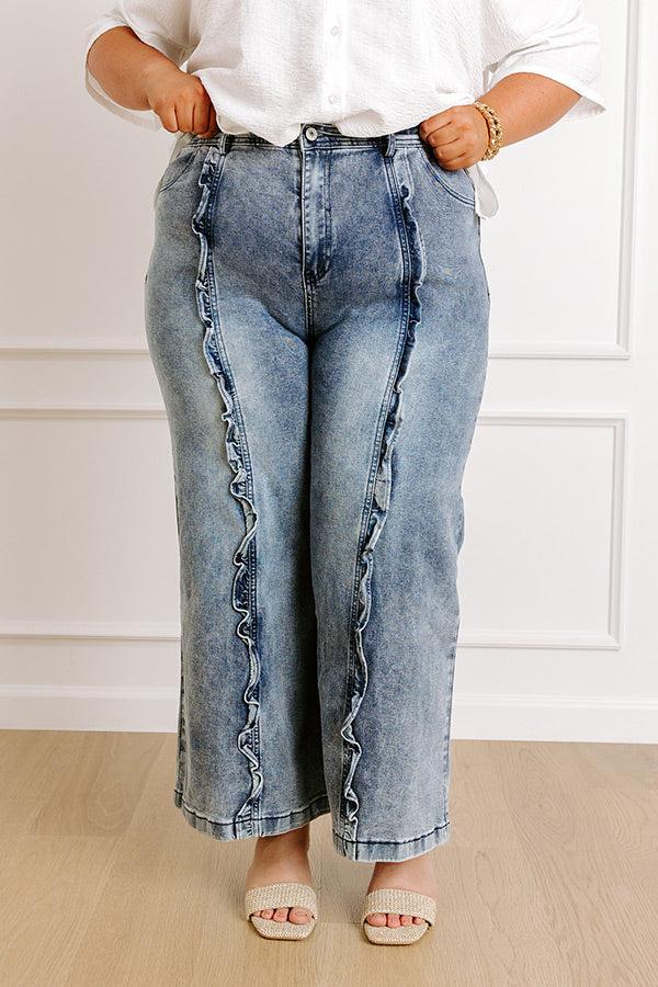 - Add a flirty twist to your OOTD with these wide leg jeans! The ruffle details bring a trendy feminine vibe to your everyday denim look.
