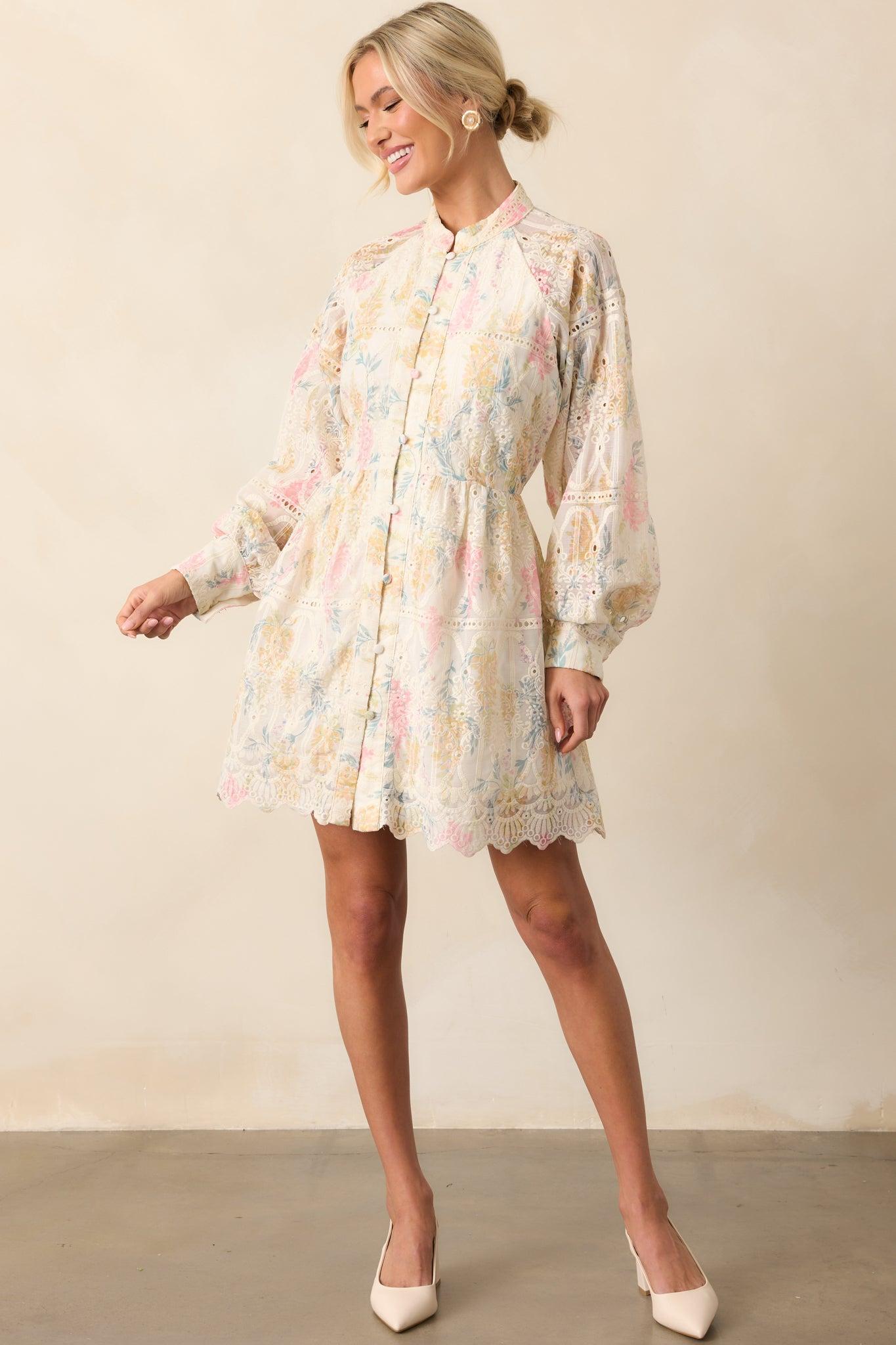 The Art Of Being Ivory Floral Embroidered Eyelet Mini Dress is a charming choice for embracing the beauty of simplicity. It's perfect for those moments when you want to feel elegant and carefree, with a sense of artistry that makes every moment special. This ivory dress features a multicolor floral print, embroidered eyelet detailing throughout, a high neckline, functional button front, button cuff long sleeves, and a scalloped bottom hem. 100% Polyester Lined: 100% Rayon Hand Wash Cold Manufactured in China Designed in The USA Model is 5'8" and is wearing a size small