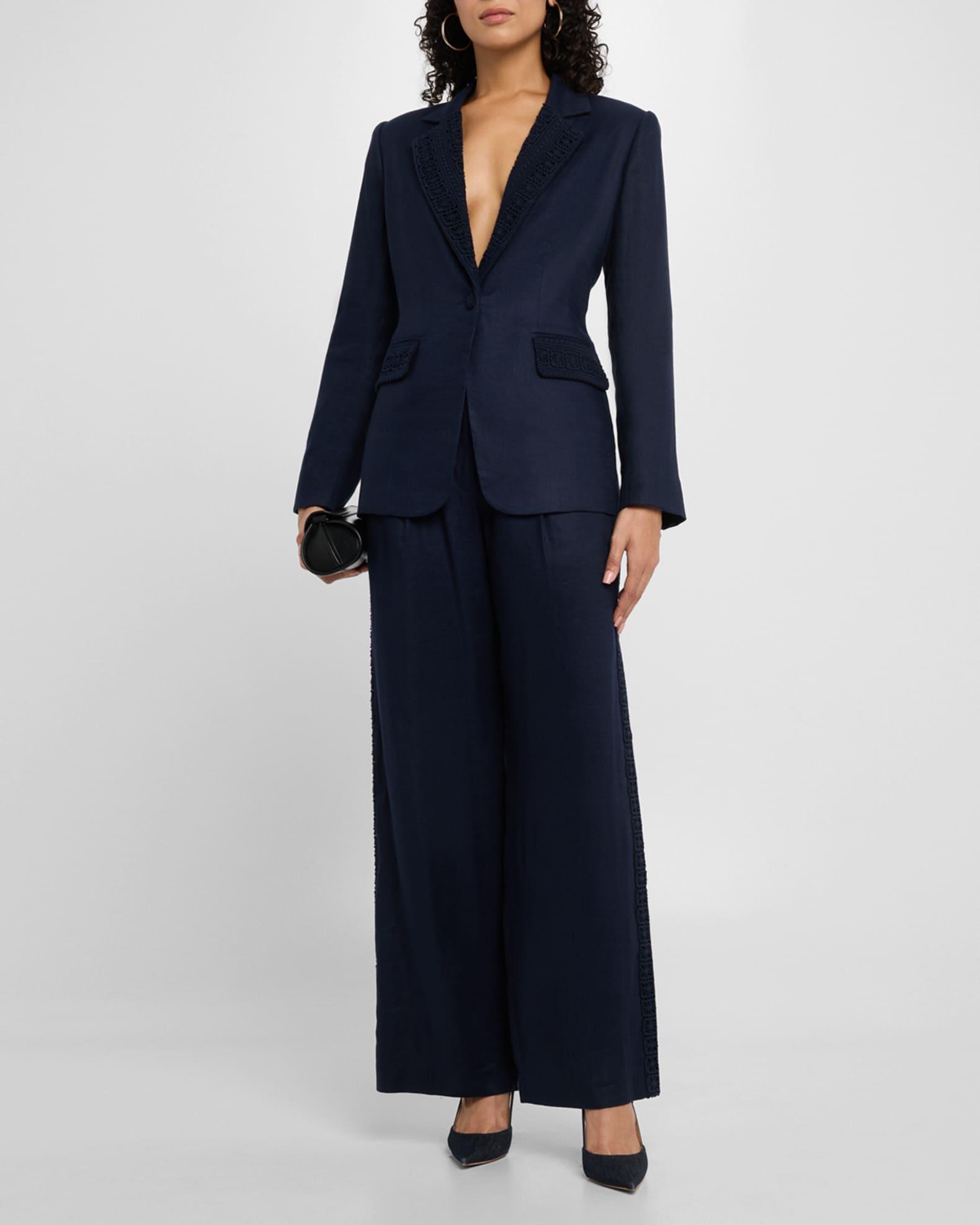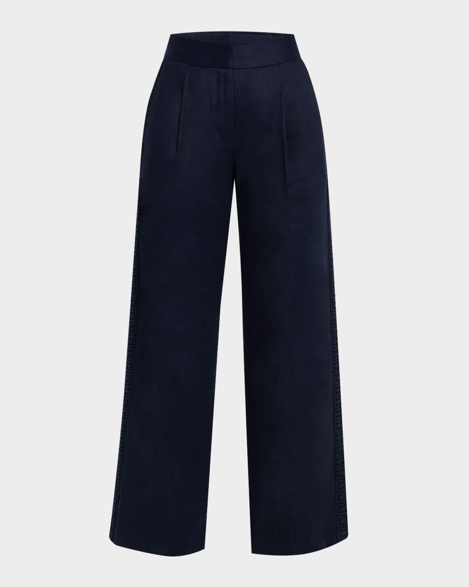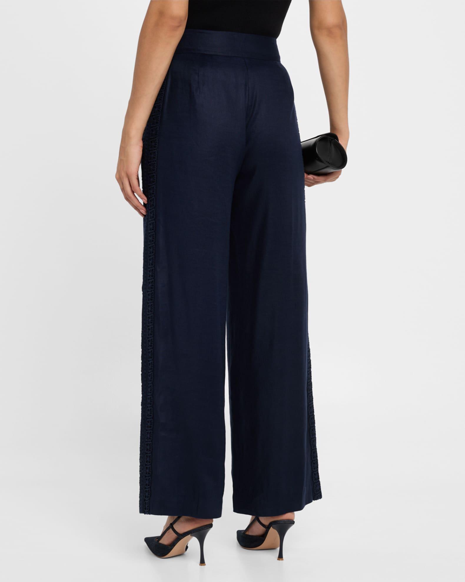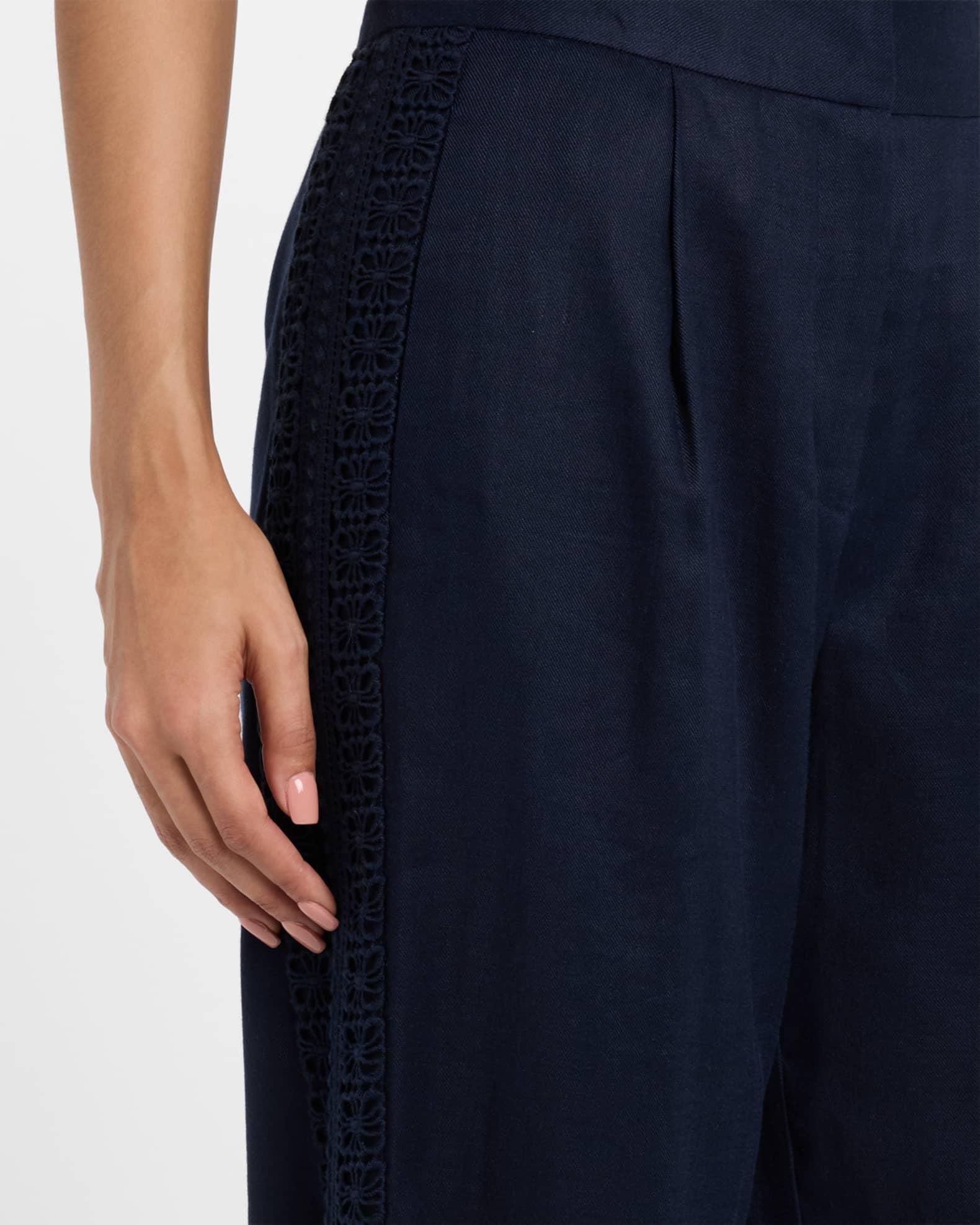 Elie Tahari "The Aster" pants trimmed with floral lace Approx. measurements: 31" inseam; 39" outseam Mid-rise sits high on the hips Pleated front On-seam pockets Full length Wide legs Zip fly Linen/viscose/spandex Lining: Cotton Dry clean Imported