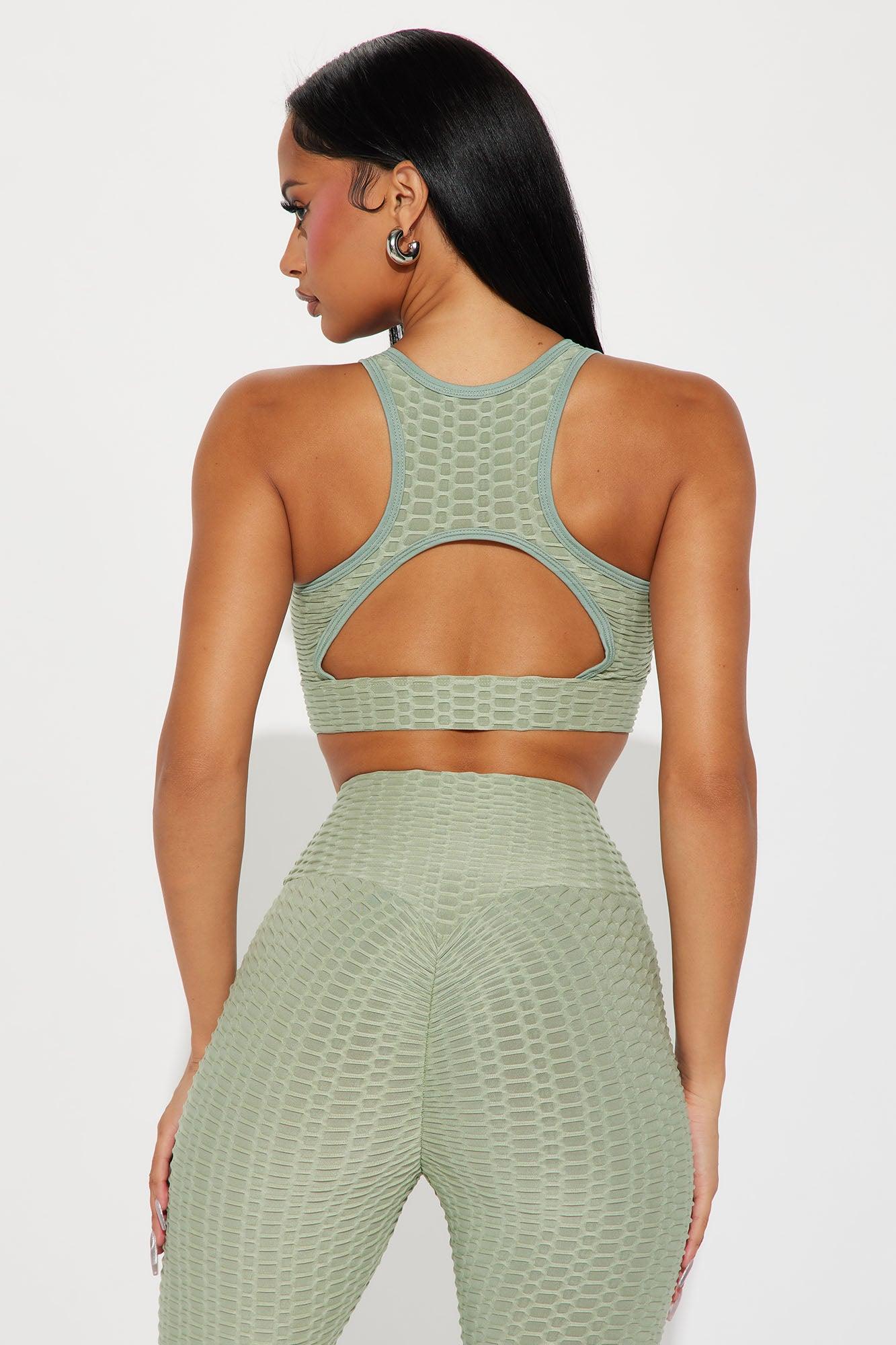 Available In Black, Burgundy, Red, Royal, Mocha, Olive, Mint, Silver, Pink, And Navy. Sports Bra Scoop Neck Sleeveless Textured Cut Out Low Impact Stretch Pair With "The Best Assets Textured Scrunch Butt Active Leggings" 87% Polyester, 13% Spandex Imported