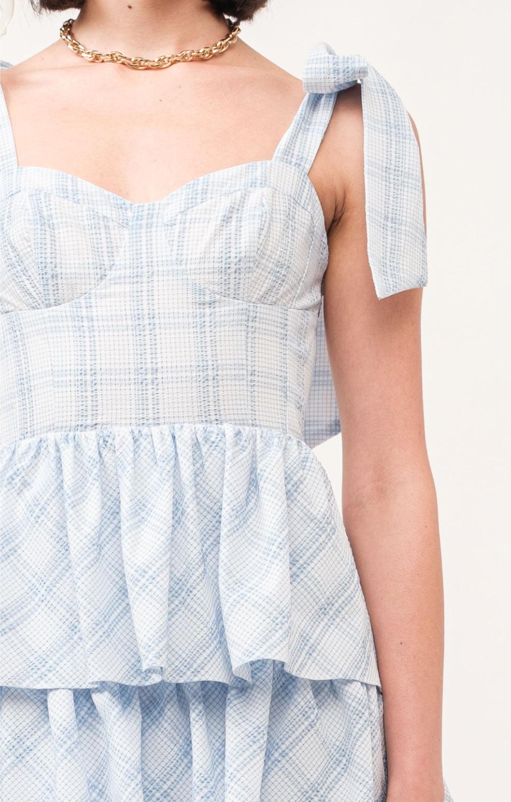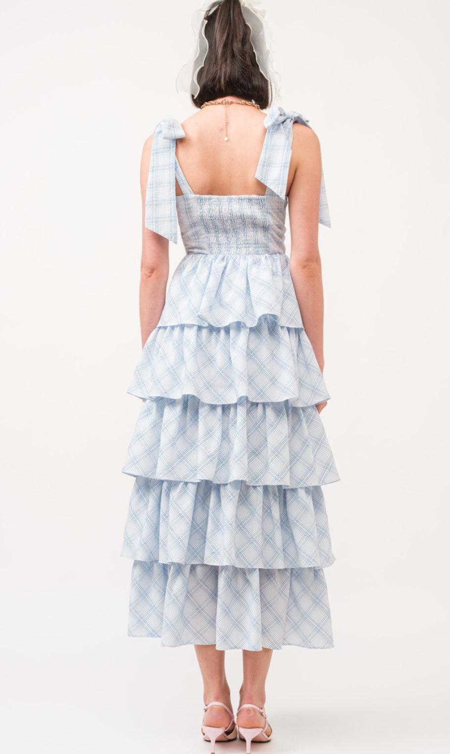 This dress is a charming and feminine maxi dress with a romantic, vintage-inspired aesthetic. It features a soft pastel blue plaid pattern on a lightweight fabric, giving it a delicate and airy feel.