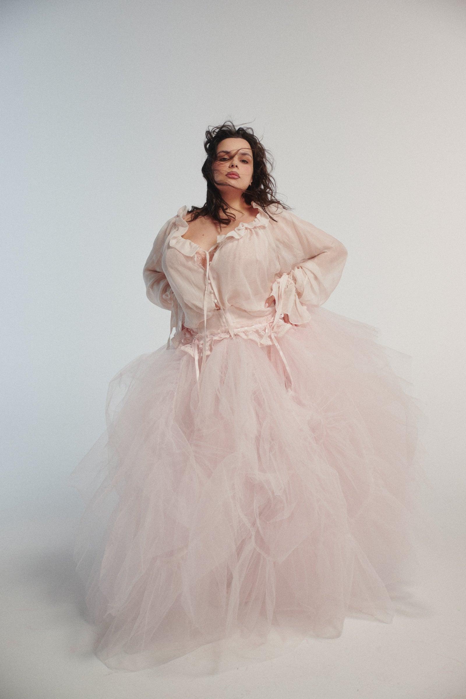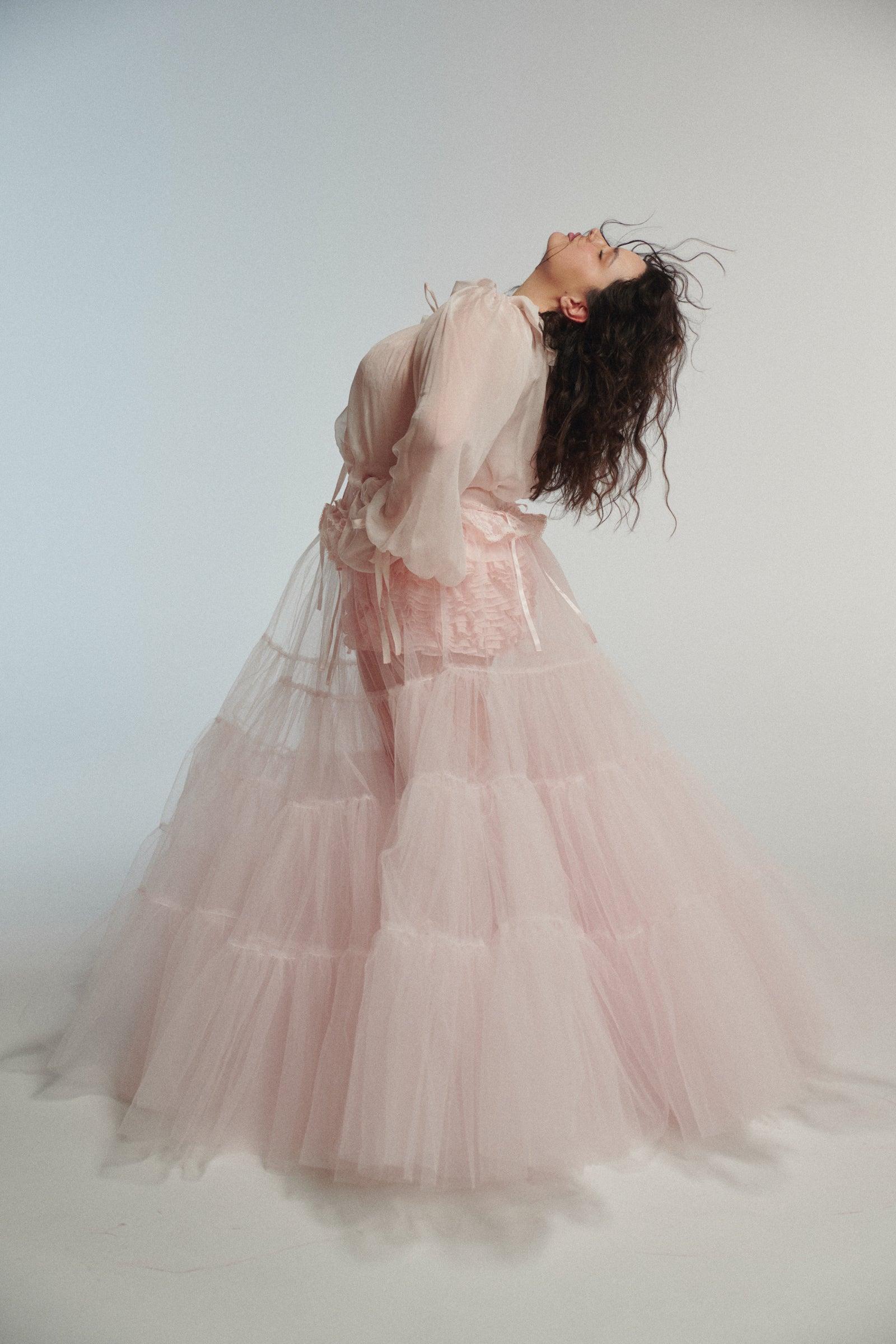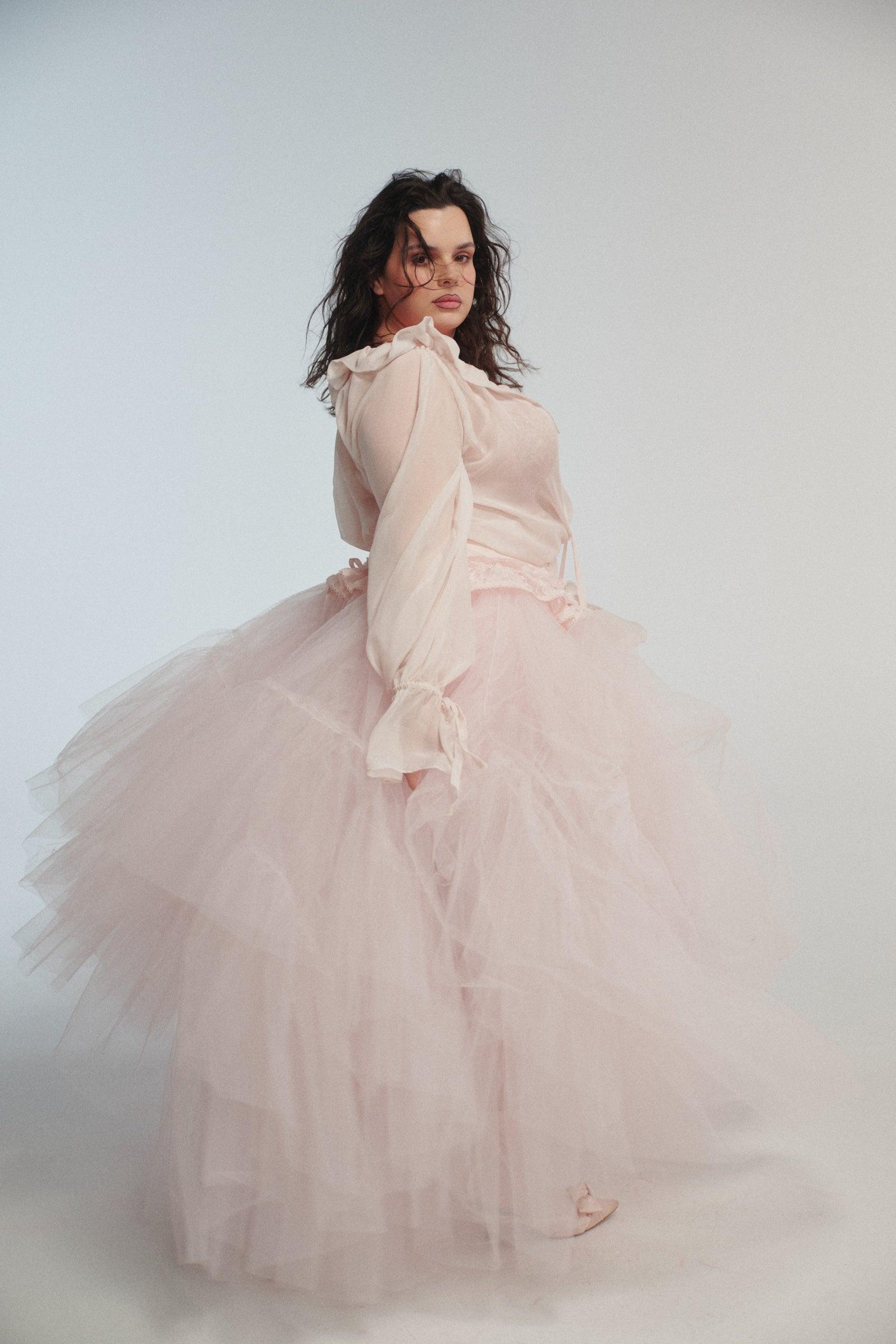 The cloud of all clouds in baby pink. Sheer tulle layered into tiers that bustle and bloom, finished with a silk satin waistband and lace ribbon details. Wear it over pieces as a statement or under dresses for volume. Petticoat fantasy, real-world versatility. Styled with The Blush Shakespeare Blouse. Sheer tulle open-front layered skirt with bustle Silk Satin waistband with lace and satin ribbon details Hook-and-eye closures Fabric: 100% Polyester skirt, 100% Silk Satin waist Julie is 5’9” and a size XS in Selkie. Her measurements are 34” bust, 25” waist, 34” hip. Alicia is 5’4” and a size XXL in Selkie. Her measurements are 38” bust, 37” waist, 47” hip.