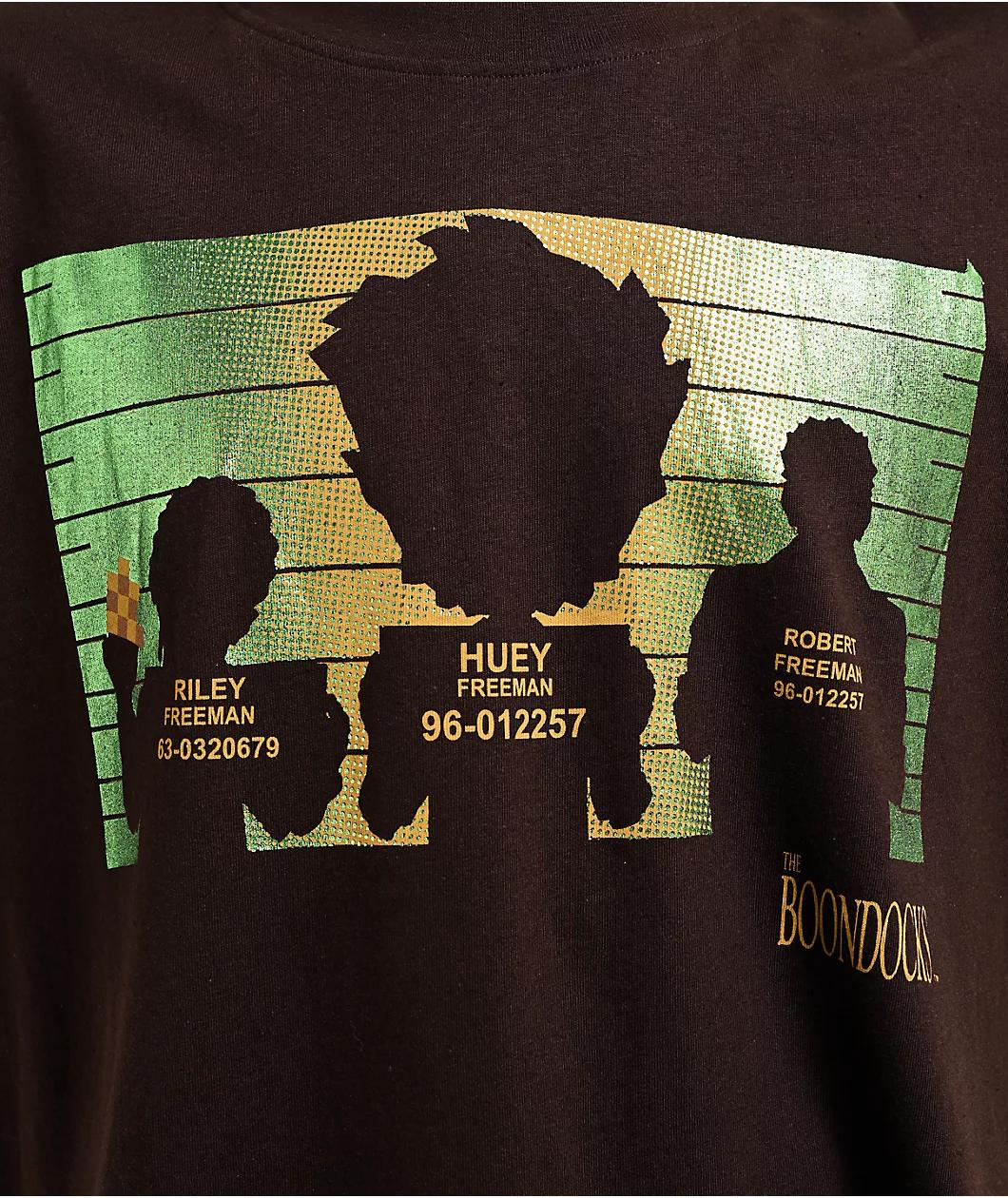 Landing in a brown colorway with holographic screen-printed foil imagery, The Boondocks welcomes the Shadow Line Up t-shirt. The design showcases the renowned television show characters Riley Freeman, Huey Freeman, and Robert Freeman's silhouettes, a