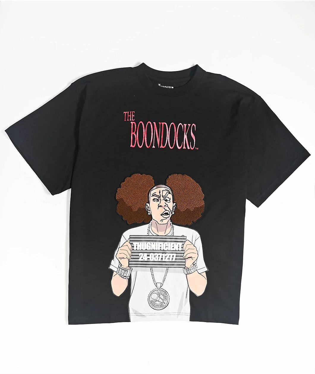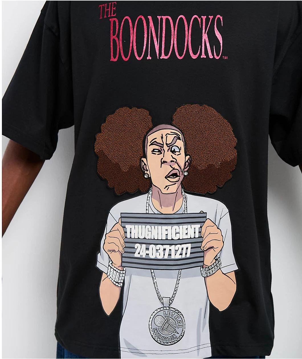 Representing Terra-Belle, Georgia, fictional animated rapper Otis Jenkins aka Thugnificent is featured prominently on the black Mugshot t-shirt from The Boondocks. Famously known for the hit songs "Booty Butt Cheeks" and "Stomp Em In The Nuts" from t
