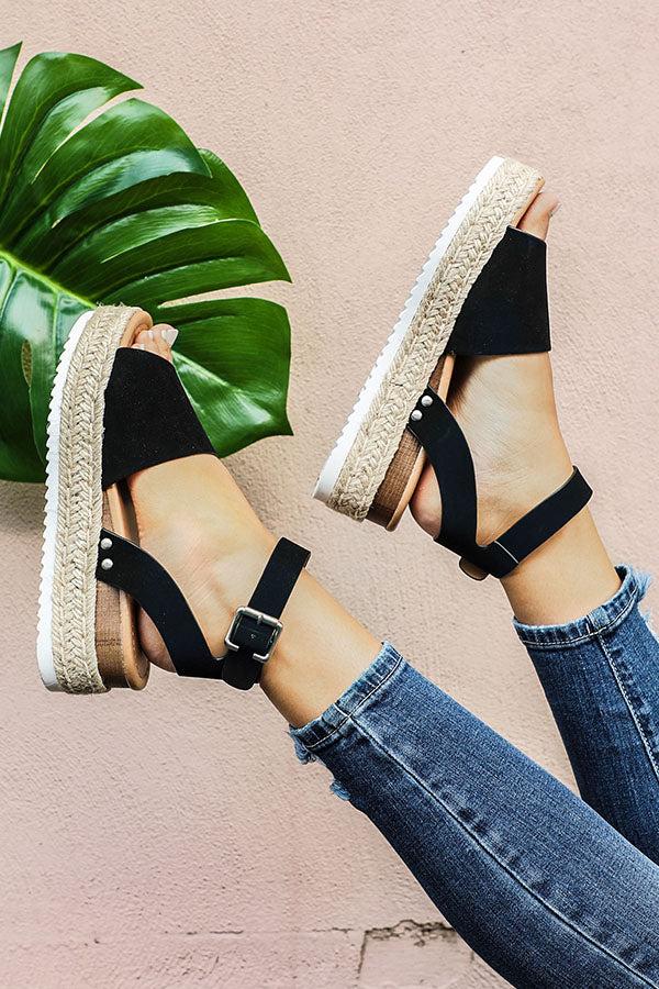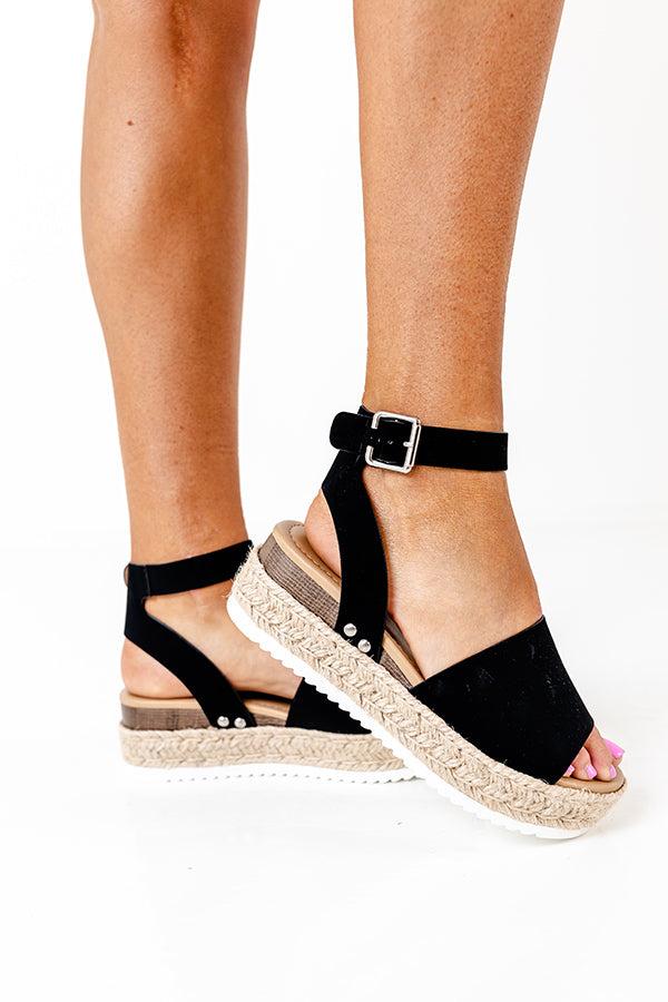 Be solely original this summer in our adorable black "Brighton Espadrille" featuring lifted 2-inch soles with braided texturing, a wide over-the foot strap with open toes, and buckled ankle straps with open heels! These espadrilles run more true to size.