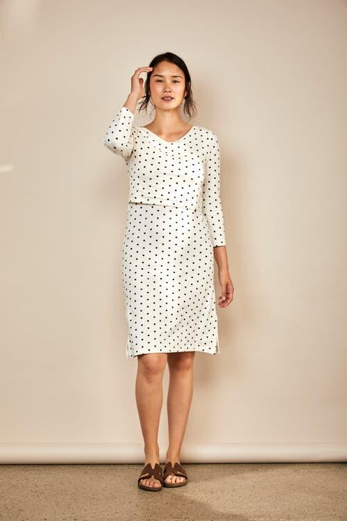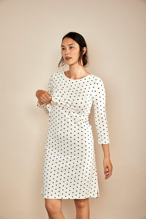 Smart, chic, and effortlessly versatile, the Bshirt White and Black Spots Breastfeeding Dress is designed to meet the needs of stylish nursing mothers. The eye-catching spots give it a modern look, while its no-fuss feeding hole allows for easy and discreet nursing. The longer flap design offers full coverage, making it versatile for styling while flattering a variety of body shapes. Its thoughtful design promotes a natural feeding position, benefiting both milk flow and your baby’s well-being.This dress transitions seamlessly from casual daywear to an elegant evening dress, making it ideal for the modern mum on-the-go. Whether dressing for a day out or an evening event, this sleek, spotty dress blends fashion with functionality, elevating your nursing wardrobe with ease and sophistication. Machine washable Material: 95% Organic Cotton, 5% Elastane Brand : The Bshirt True to size Size S : Length 62cm