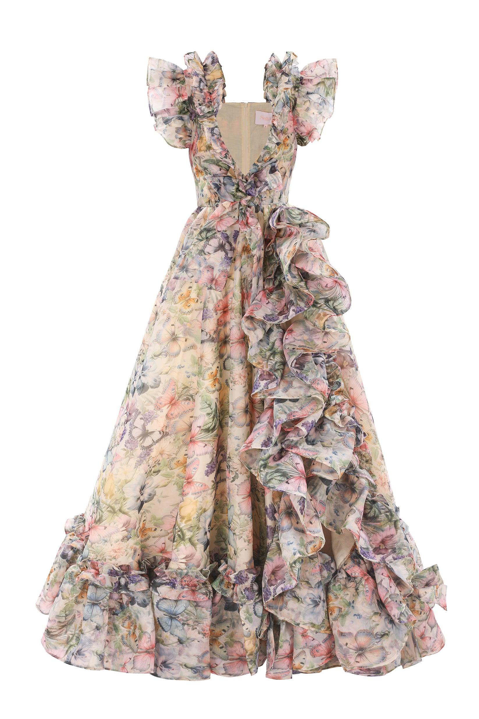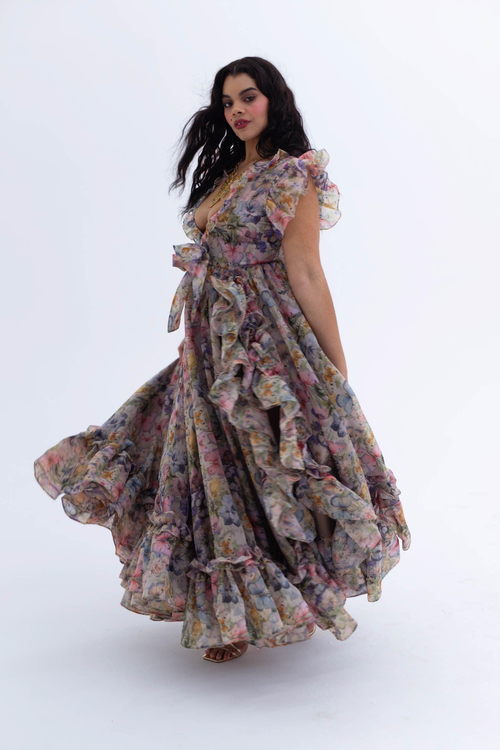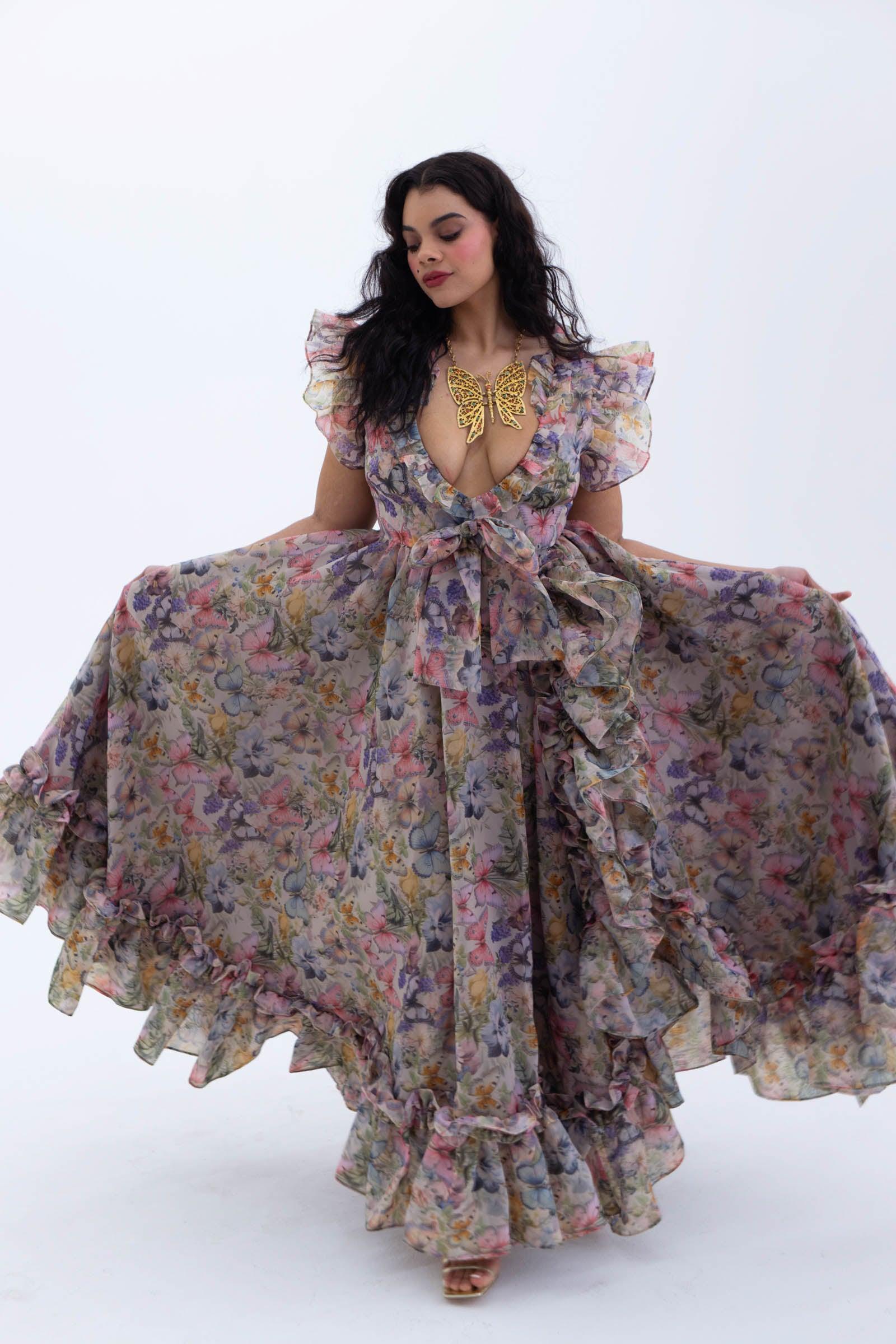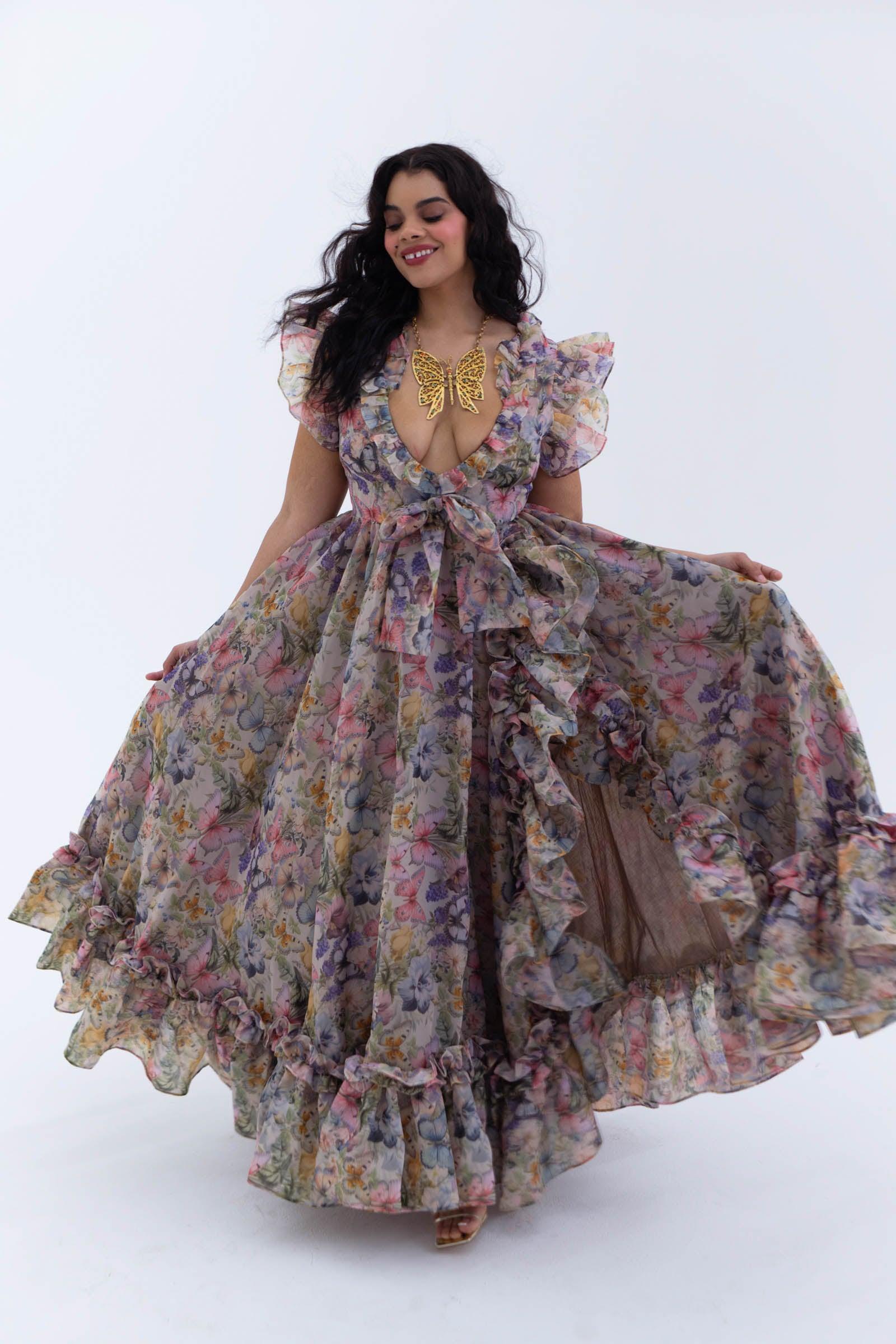 Unafraid to be seen, this springtime union of the Marie Gown top and the Bloom Gown skirt boasts delicate tank sleeves, a plunging ruffled neckline, and a daring thigh-high slit. The ruffled skirt, adorned with an intoxicating butterfly print, creates a stunning silhouette that speaks of transformation and ephemeral beauty. Organza v-neck gown with ruffled slit Bow garnishes Fully lined with cotton Invisible zipper closure To ensure the best fit, measure your bust and high waist before ordering and steam for optimal beauty. For more specifics, please text our help line. Mariah is 5’10” and wearing a size XL in Selkie. Her measurements are 44” bust, 36” waist, 48” hip. Fabric: 100% Polyester Organza Lining: 100% Cotton Care: Gently hand wash cold, lay flat to dry or dry clean