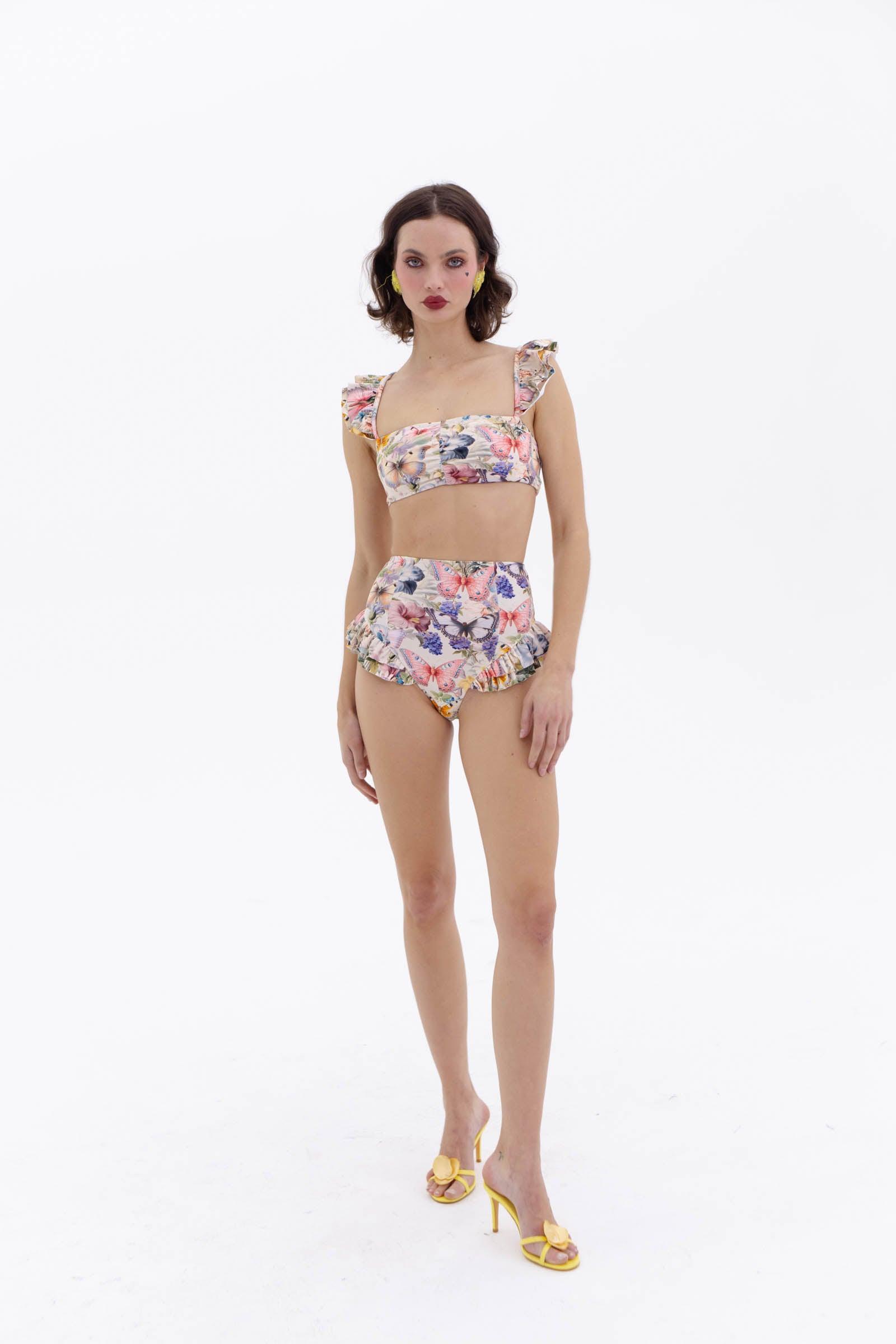 Selkie’s bikini debut is a nod to the absolute classic, reminiscent of the iconic bikinis worn by bathing beauties of yesteryear, crafted to complement a diverse range of body types. Featuring a cheeky cut and high waist, these swimsuit bottoms boast ruffle details at the hip, highlighting vibrant springtime botanicals and fluttering butterflies with wings painted in shades of pink, peach, and white. Pair the Butterfly Botanics Ruffle Bikini Bottoms with the matching Ruffle Bikini Top. High cut swimsuit bottoms Mid waist Ruffle detail at hip To ensure the best fit, measure your high waist before ordering and steam for optimal beauty. For more specifics, please text our help line. Mariah is 5’10” and wearing a size XL in Selkie. Her measurements are 44” bust, 36” waist, 48” hip. Amaya is 5’10” and wearing a size XS in Selkie. Her measurements are 30” bust, 24” waist, 35” hip. Swimsuit fabric: 82% Nylon 18% Spandex Care: Gently hand wash cold, lay flat to dry or dry clean
