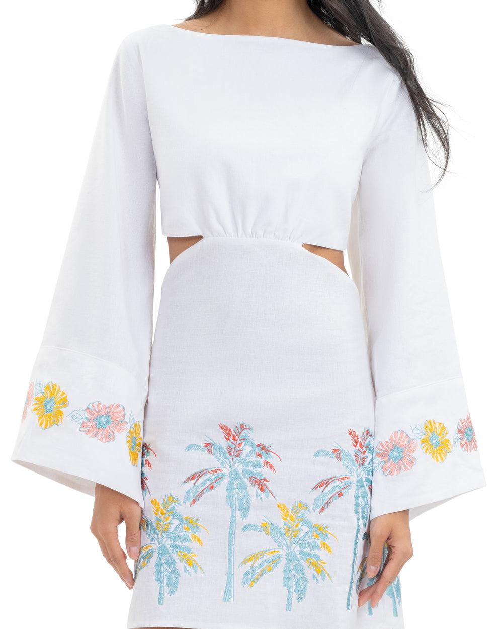 Consider this your new golden-hour go-to. Effortlessly elegant with a touch of island flair, this breezy linen dress was made for sipping champagne on the deck, sunset strolls through the resort, and turning heads wherever the tide takes you. Featuring intricate embroidered florals and palms, chic cutout details,and statement long sleeves, it’s the perfect blend of timeless sophistication and tropical charm. Crafted passionately for first-class travelers, barefoot luxury lovers, and those who believe paradise is a state of mind.