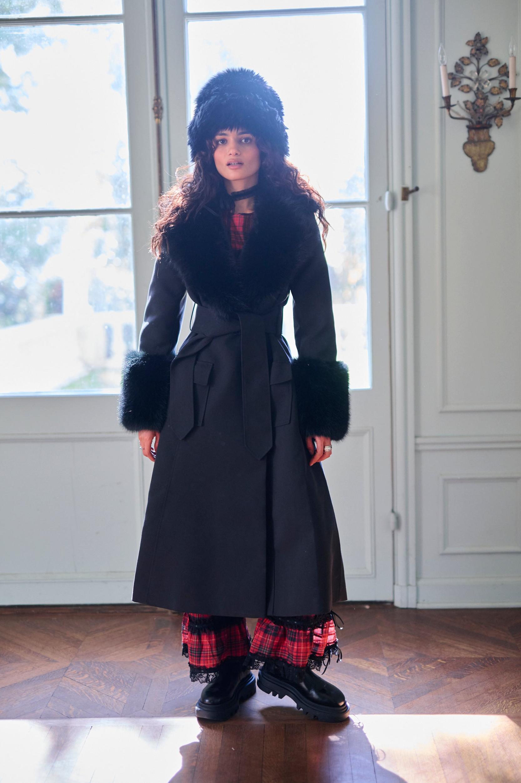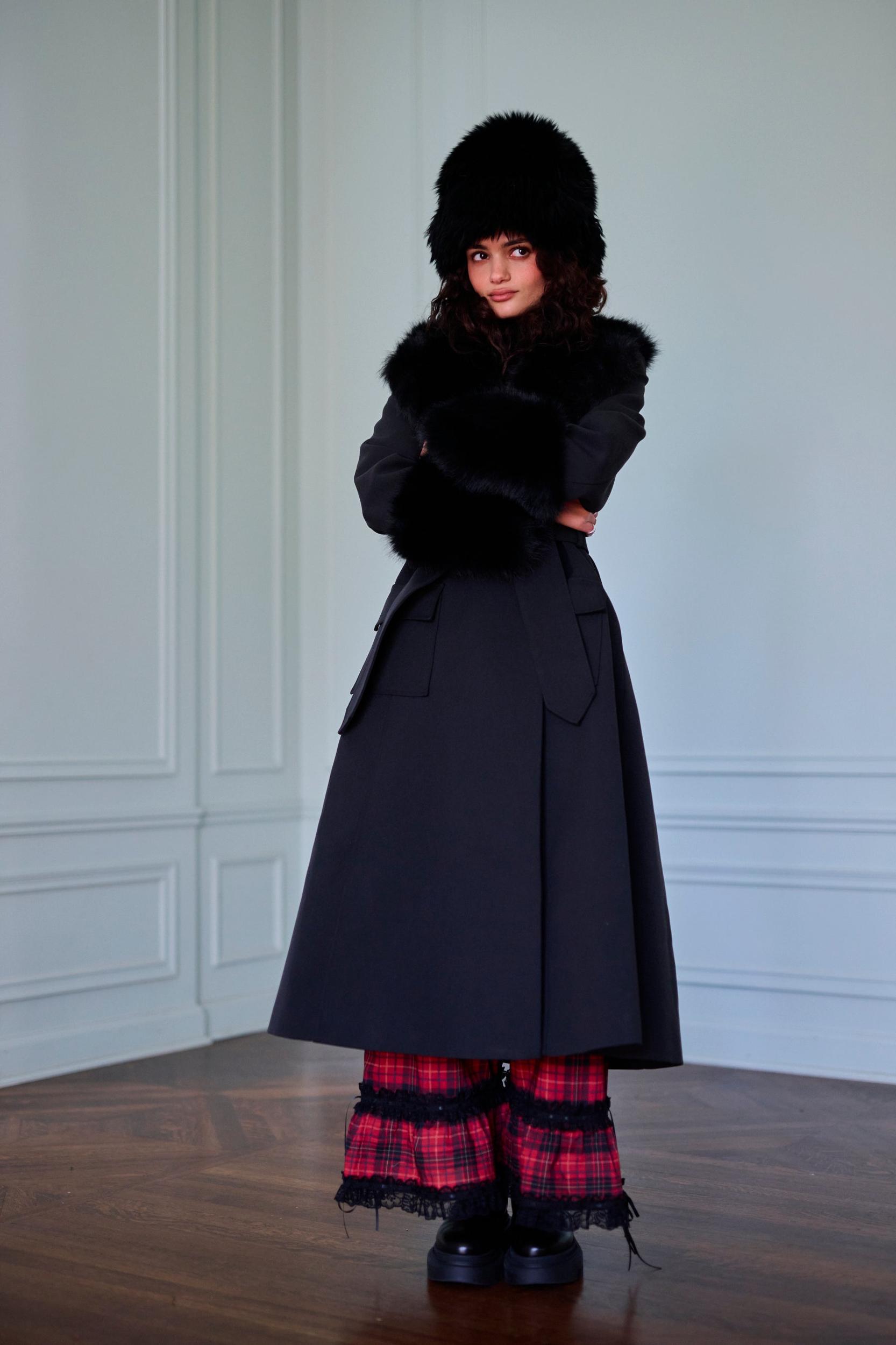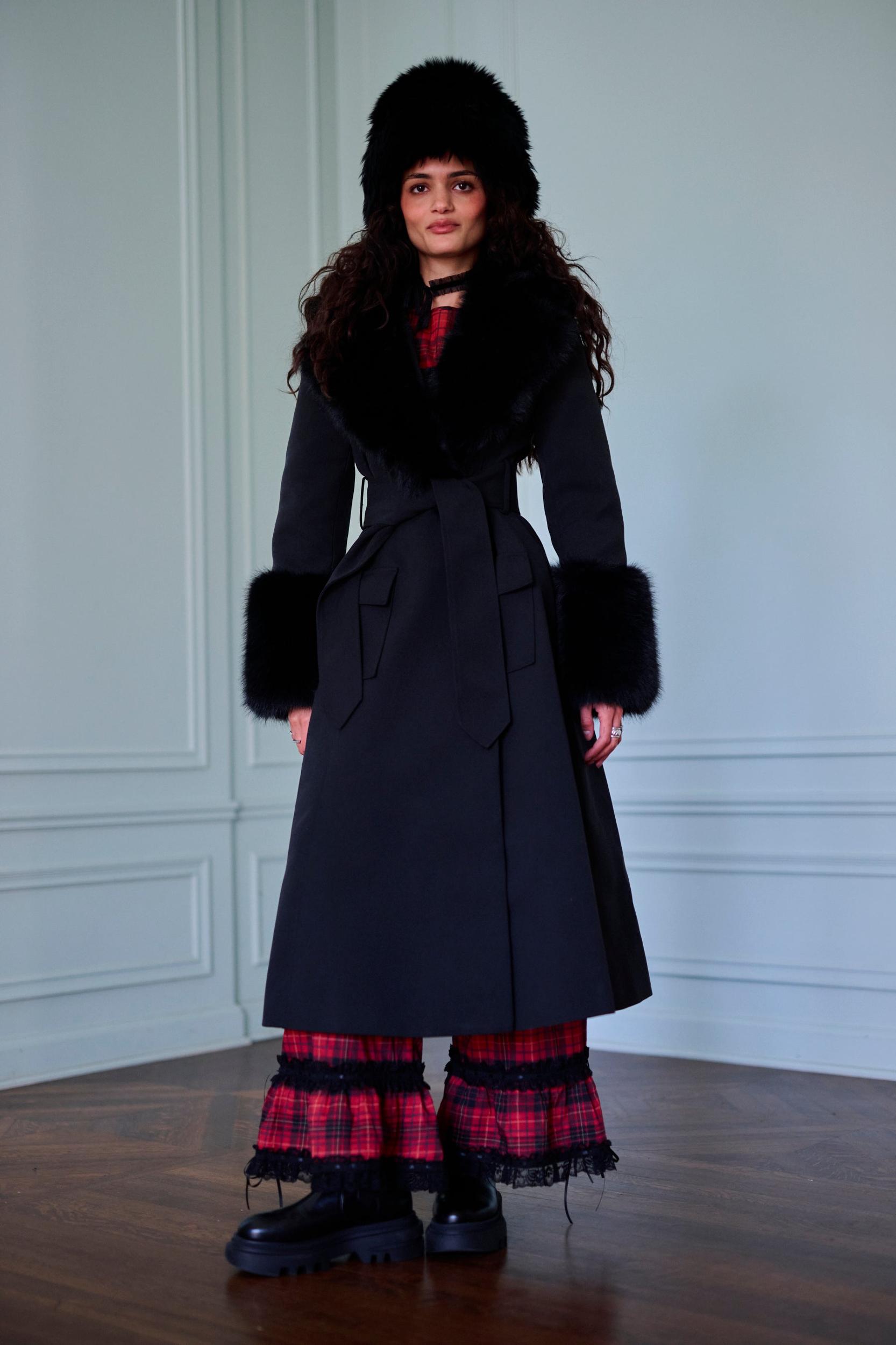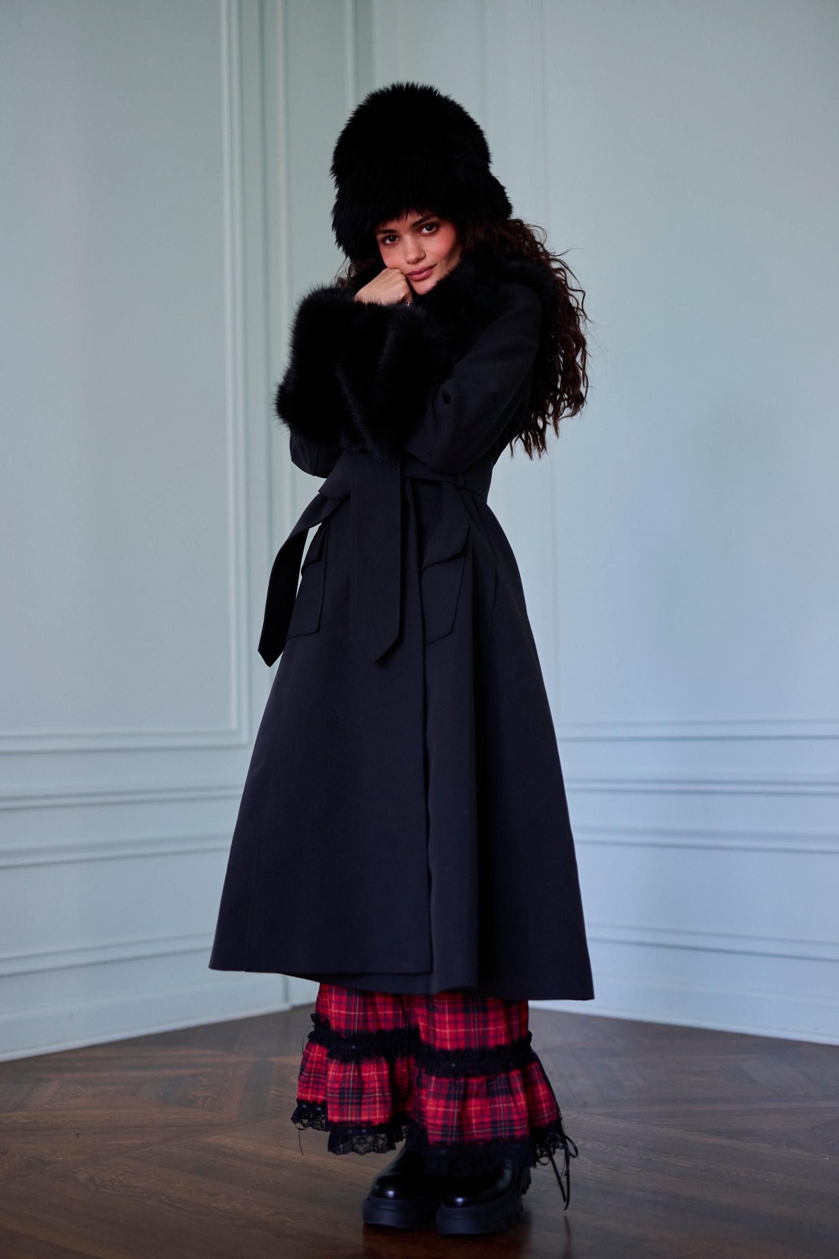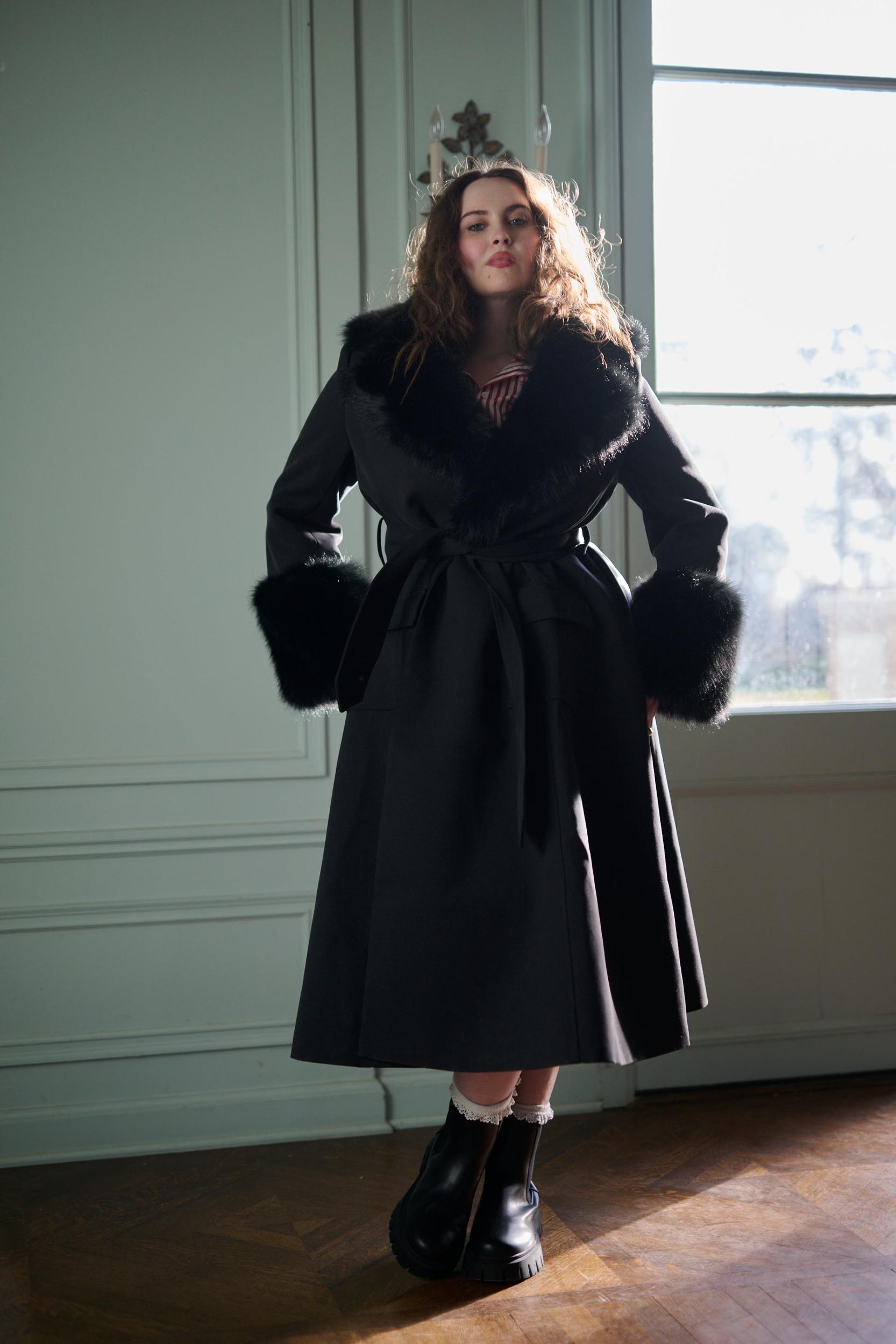 Our beloved Groupie Coat returns, capturing the essence of the 1960s - a tour bus filled with laughter, a crisp day pulling up curbside in New York, wrapping up tight in travel-ready twill and plush fur. Now with a more refined silhouette, this gorgeous, high-end beauty features our most luxurious faux fur collar and cuffs, large front pockets, side insert pockets, and a thick belt for wrapping. The ideal balance of vintage spirit and modern sophistication for the perfect encore. Full-length twill coat with oversized faux fur collar Oversized faux fur cuffs Front and side seam pockets Tie belt at the waist Metal snap button closures To ensure the best fit, measure your across bust and high waist before ordering and steam for optimal beauty. Erin is 5’10” and wearing a size XXL in Selkie. Her measurements are 38” bust, 34.5” waist, 46” hip. Vie is 5’8.5” and wearing a size XS in Selkie. Her measurements are 31” bust, 23” waist, 36” hip. Fabric: 80% Polyester, 20% Rayon Lining: 97% Polyester, 3% Elastane