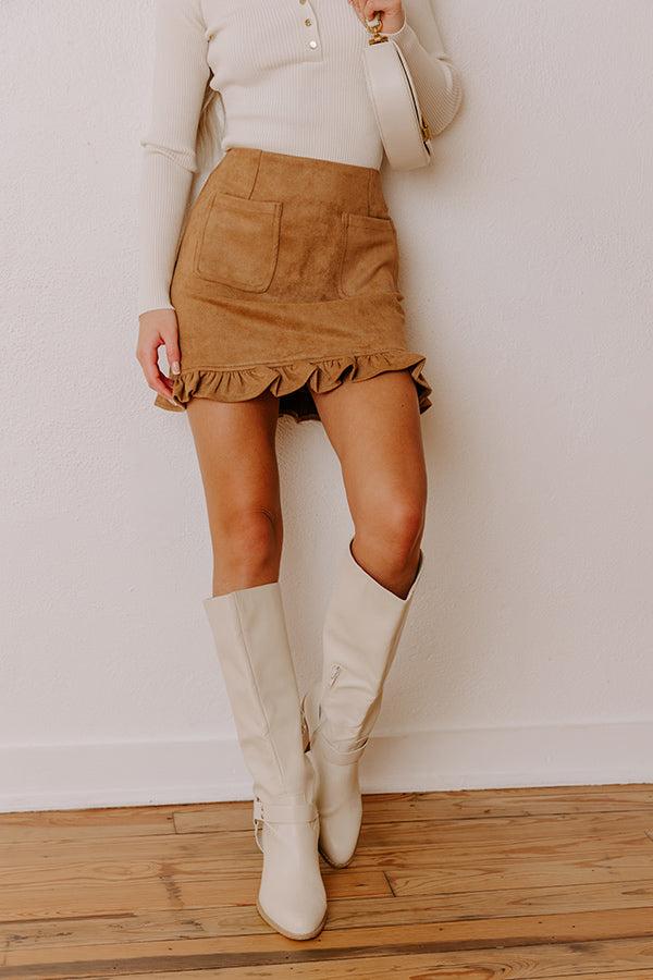 - Your boho style just got a little sweeter! This faux suede mini skirt brings playful ruffle details and effortless charm to your casual wardrobe. - Unlined, stretchy faux suede material - Back zip closure Functional patch pockets on the front - A flattering silhouette that ends in a ruffled, mini skirt length hemline