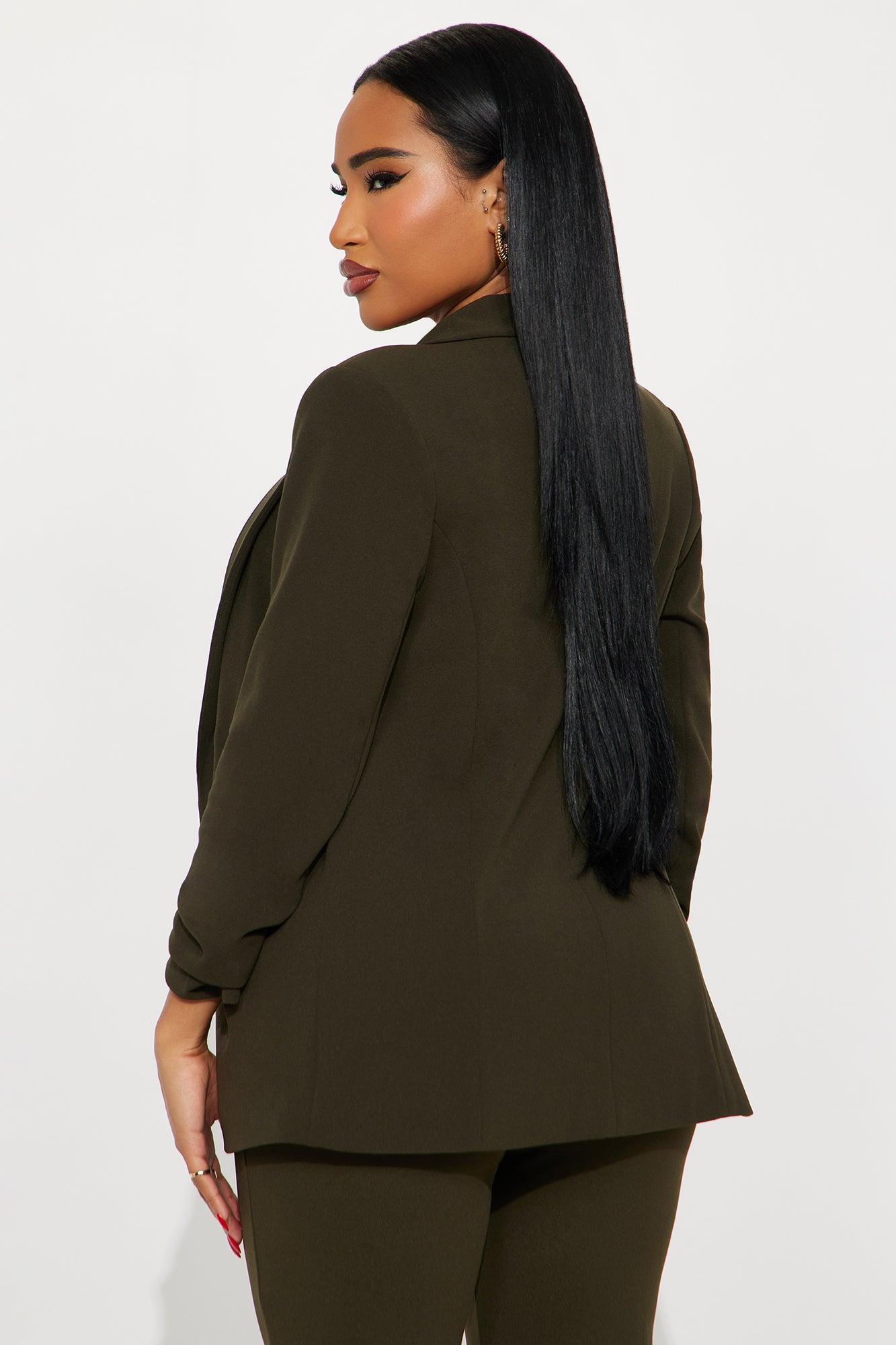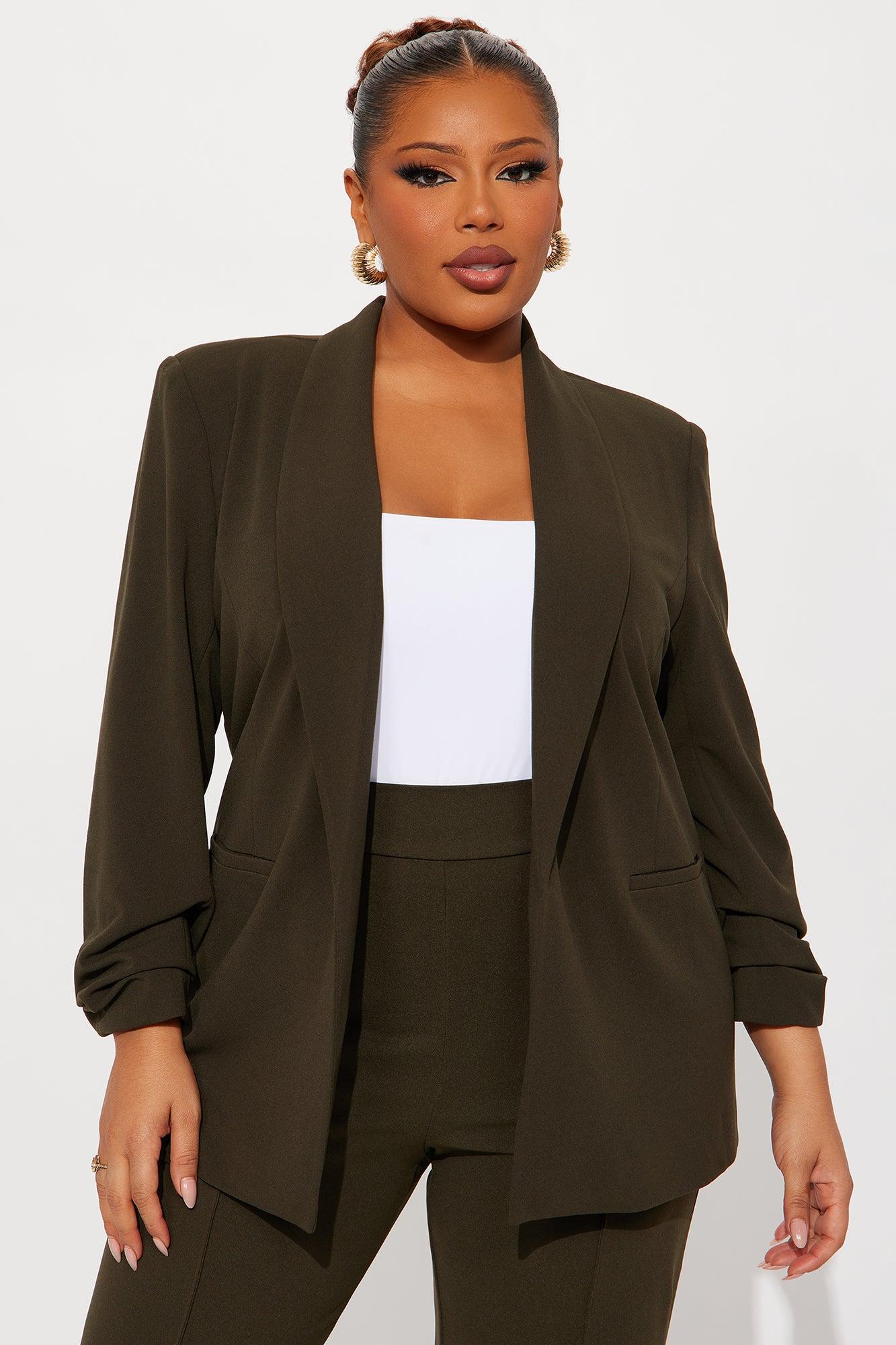 Available In Black, Brown, Butter Yellow, Charcoal, Chocolate, Hunter, Ivory, Kelly Green, Light Blue, Mauve, Navy, Olive, Raspberry, Royal, Rust, Sage And Taupe. Blazer Jacket Open Front 3/4 Ruched Sleeves Faux Front Pockets Stretch Pair With Olivia Belted Trouser, Sasha Short, Celine Belted Shorts Shell: 95% Polyester 5% Spandex Lining: 100% Polyester Imported
